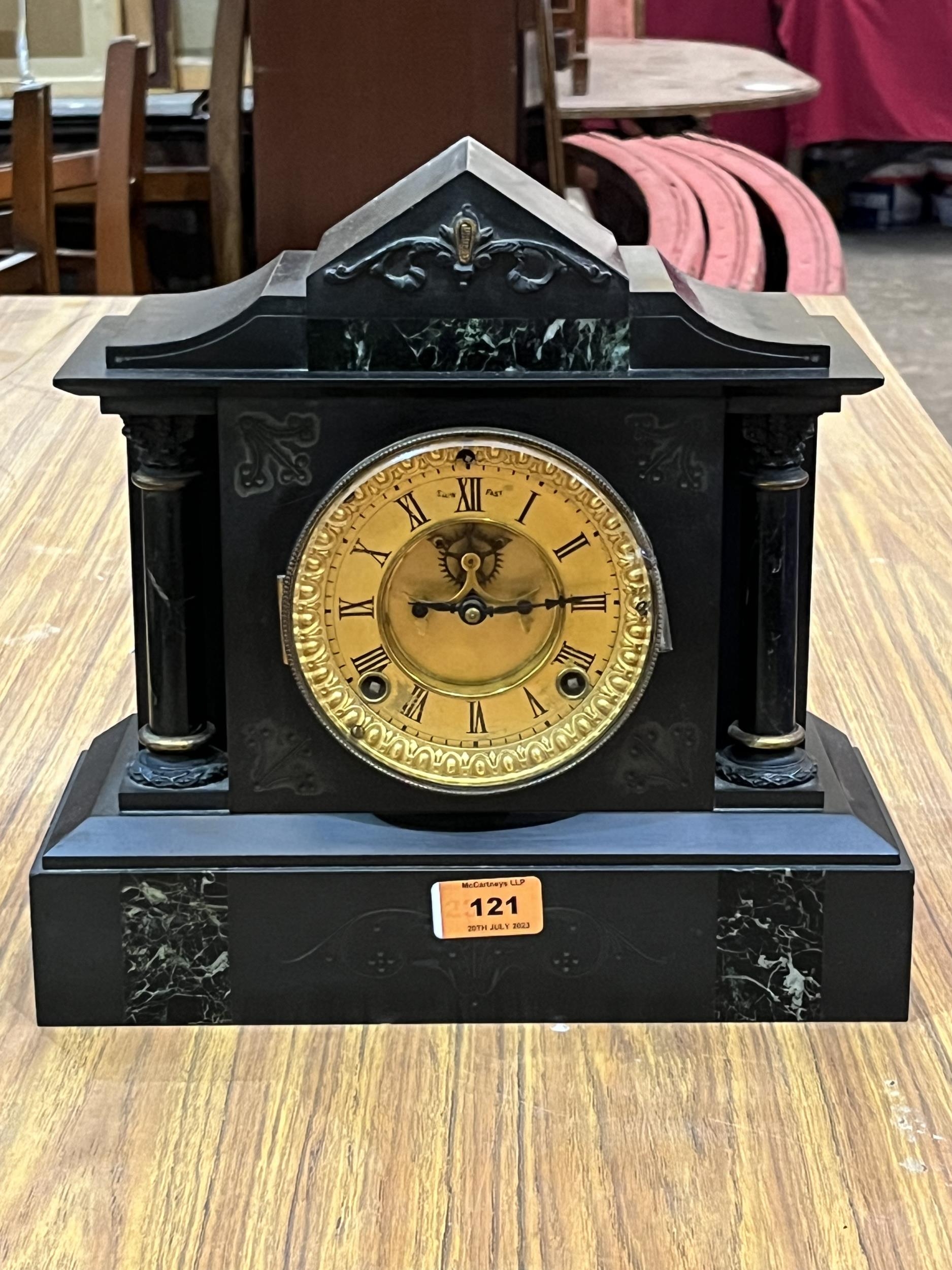 An early 20th century French black slate cased mantle clock, the gilt dial with Brocot escapement. 11¾' high.