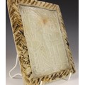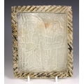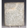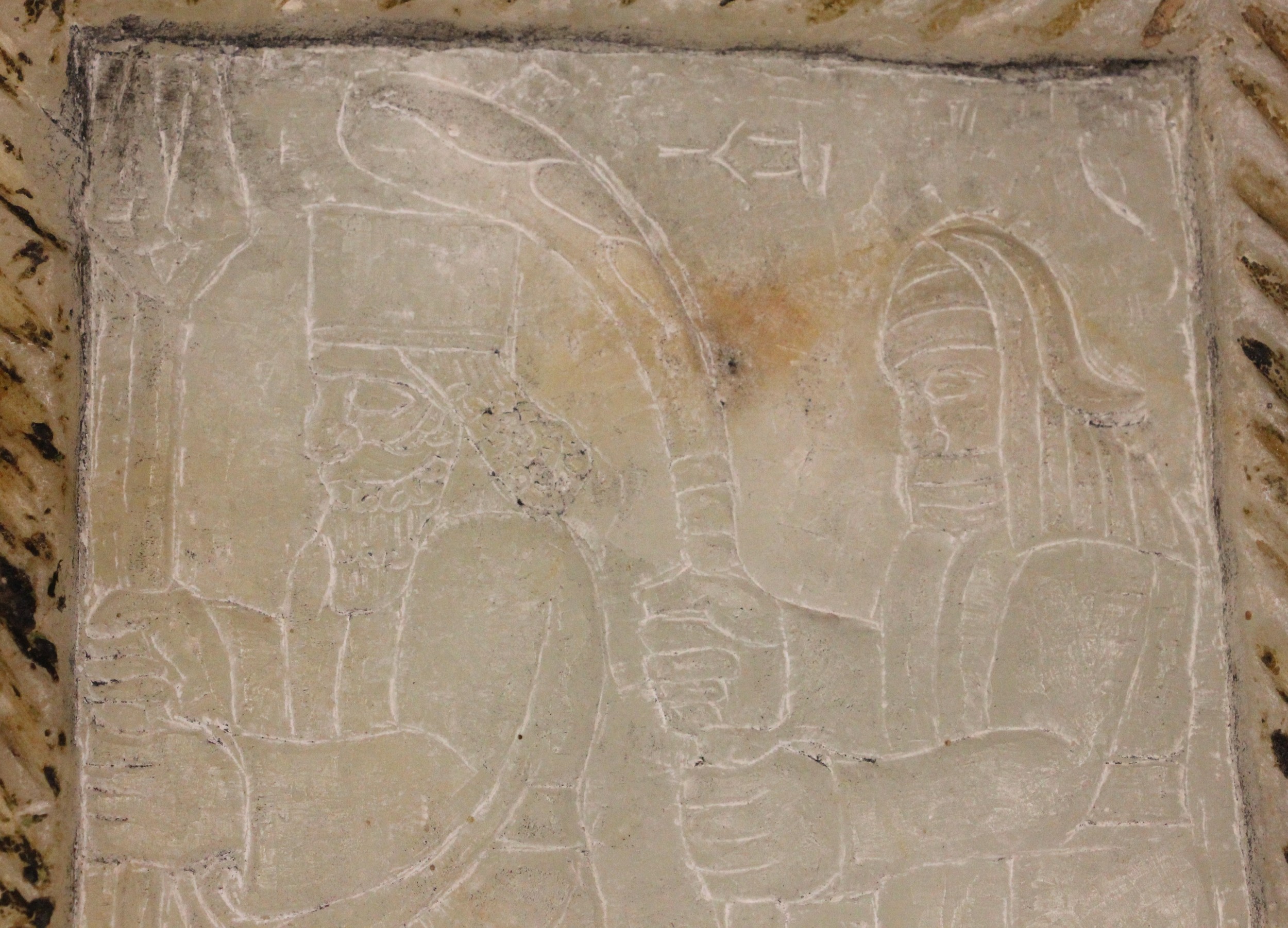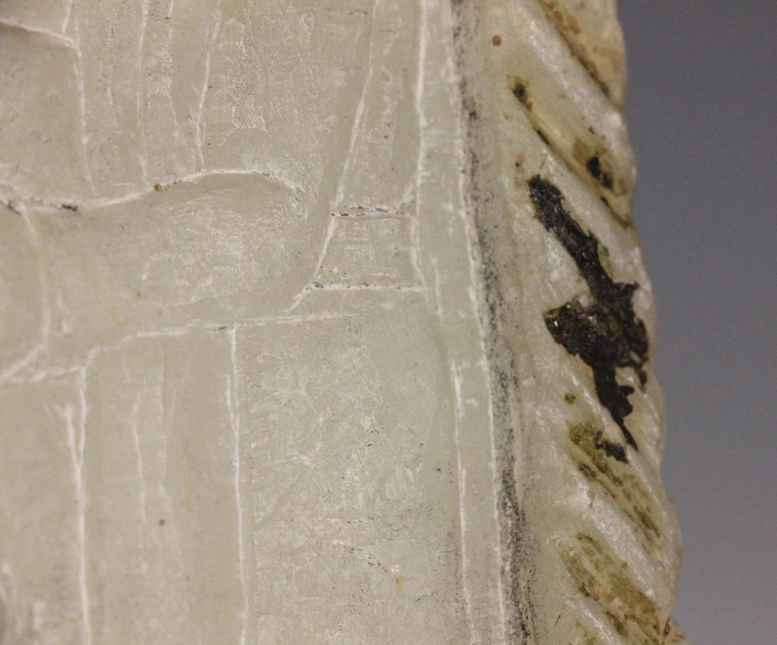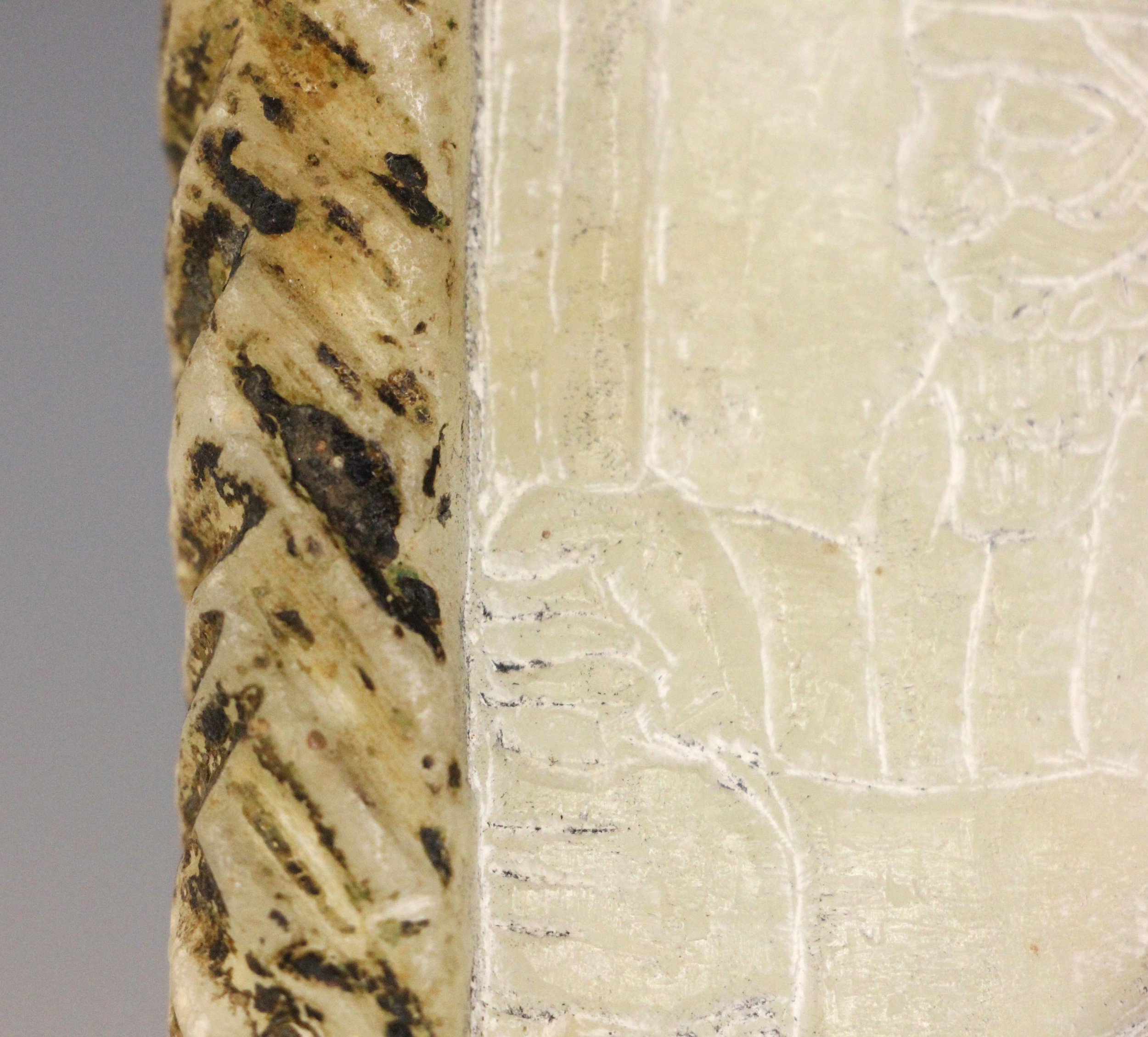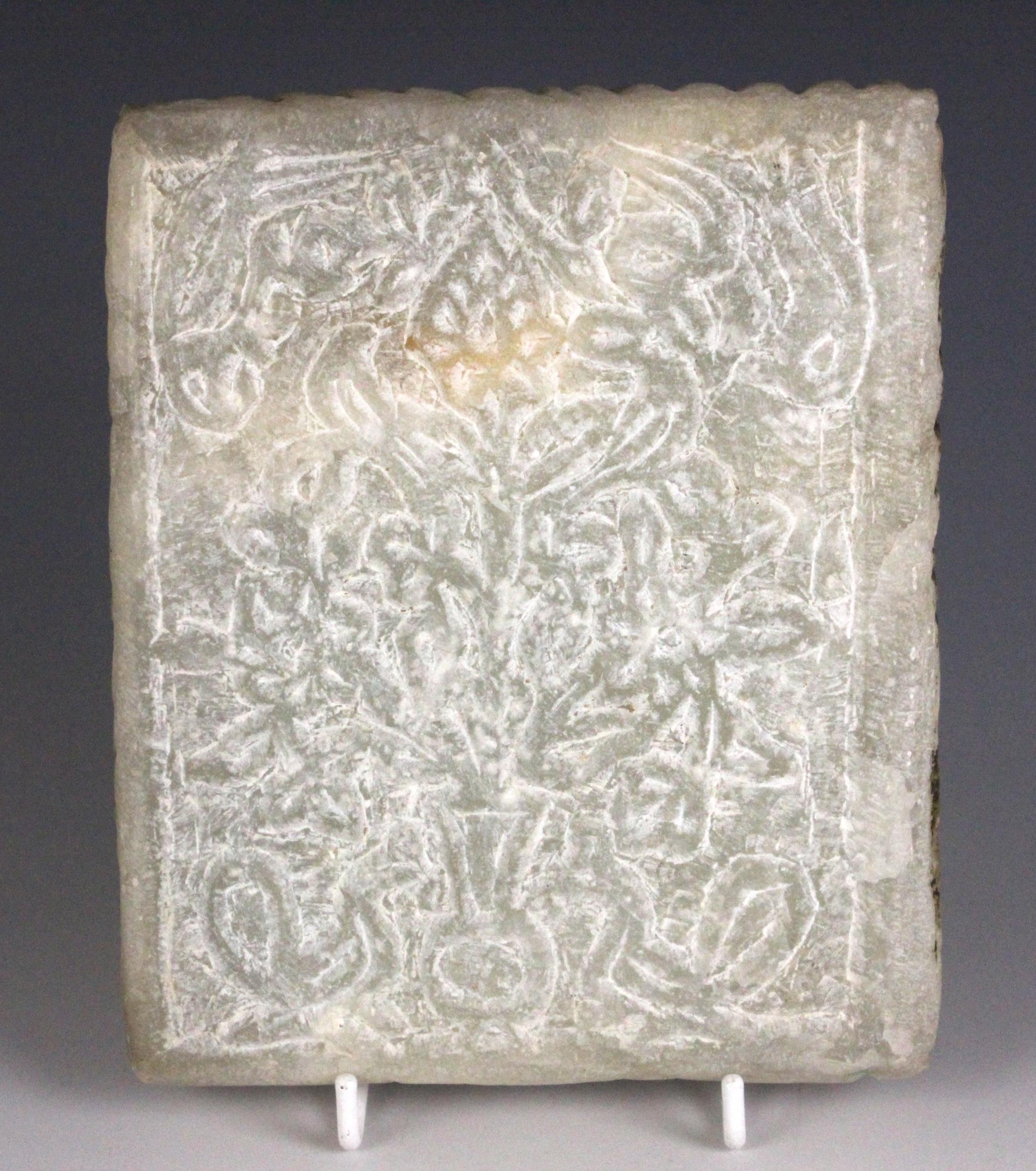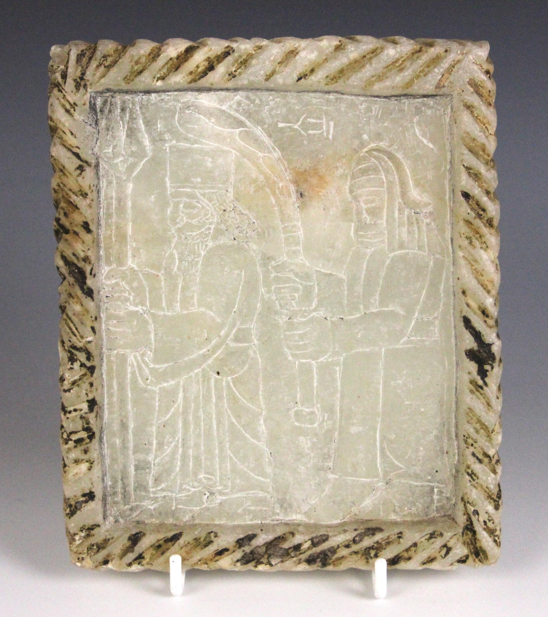 A Western Asiatic carved soapstone stele, Mesopotamia, carved with two Assyrian gods, the reverse carved with a vase issuing scrolling foliage, 18cm x 15cm