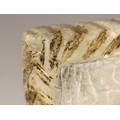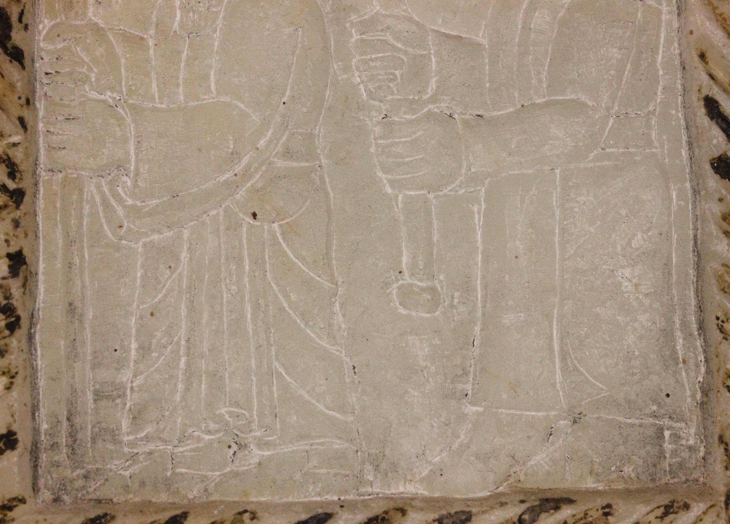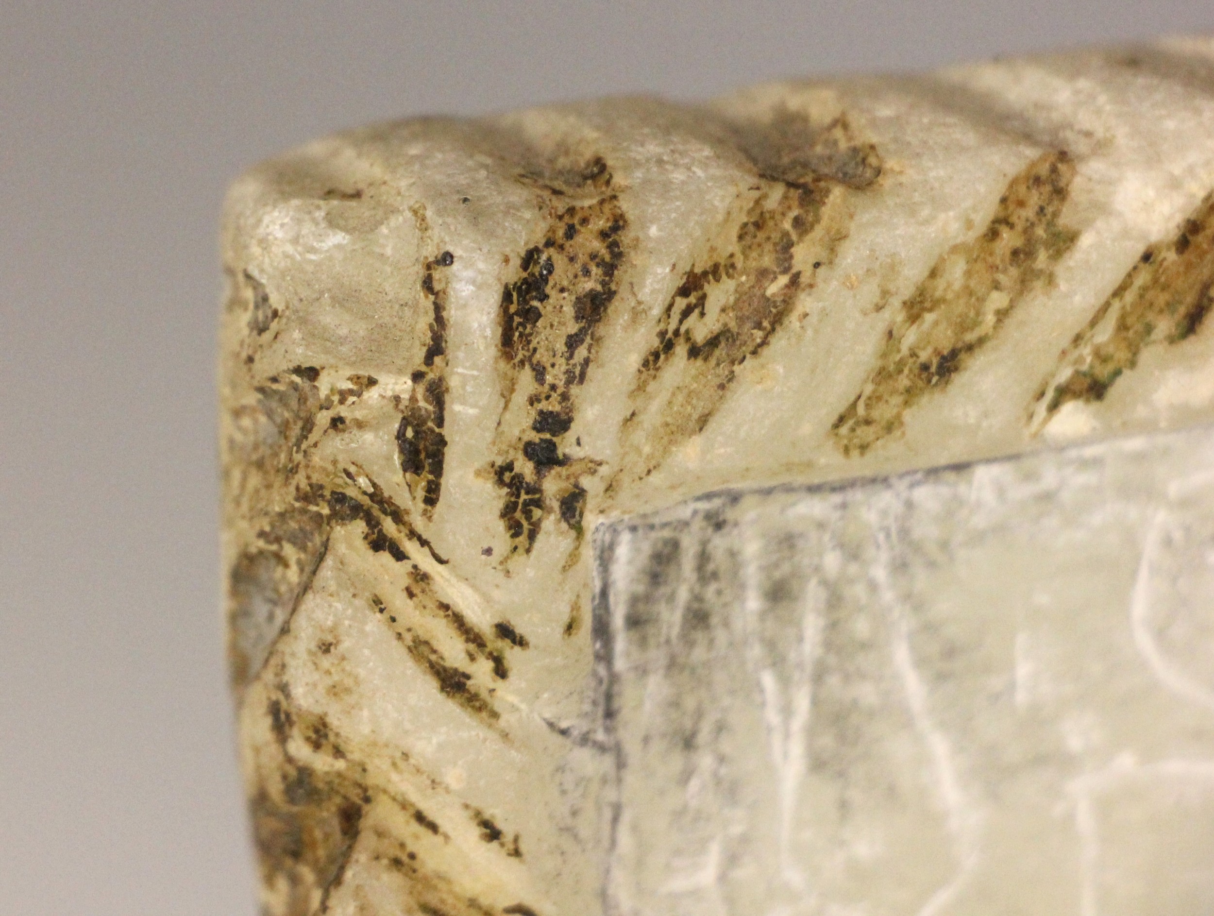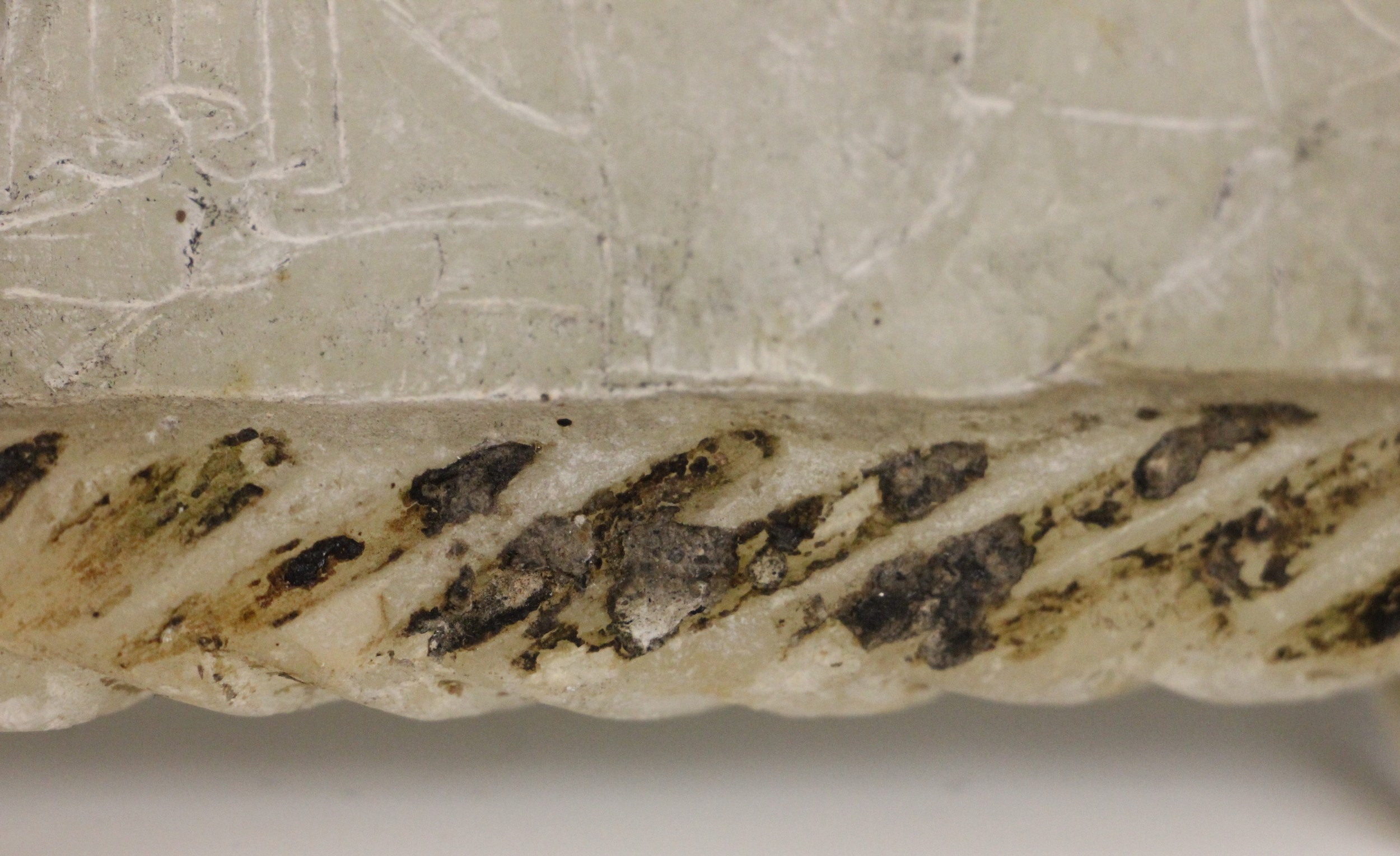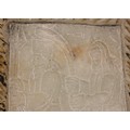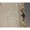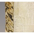 The design on the front is carved in low relief with incised outlines. The design on the back is relief carved. The stele shows residue and ingrained dirt to the carved border. The front and back panels show surface wear throughout. The top left corner shows a loss approximately 10mm x 10mm. The stone shows natural fault throughout.