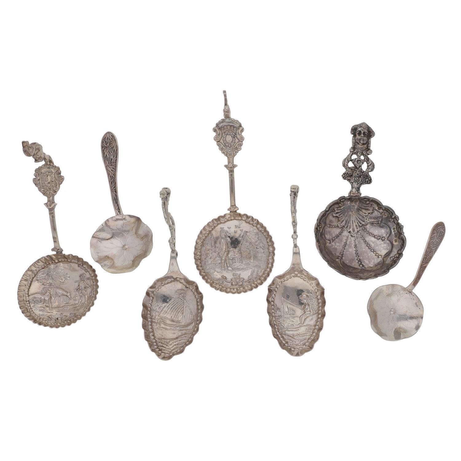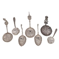 Group of five ornate Dutch silver spoons, probably late 19th century, various makers' marks; together with two small Asian white metal spoons, total weight approximately 160gm (7)