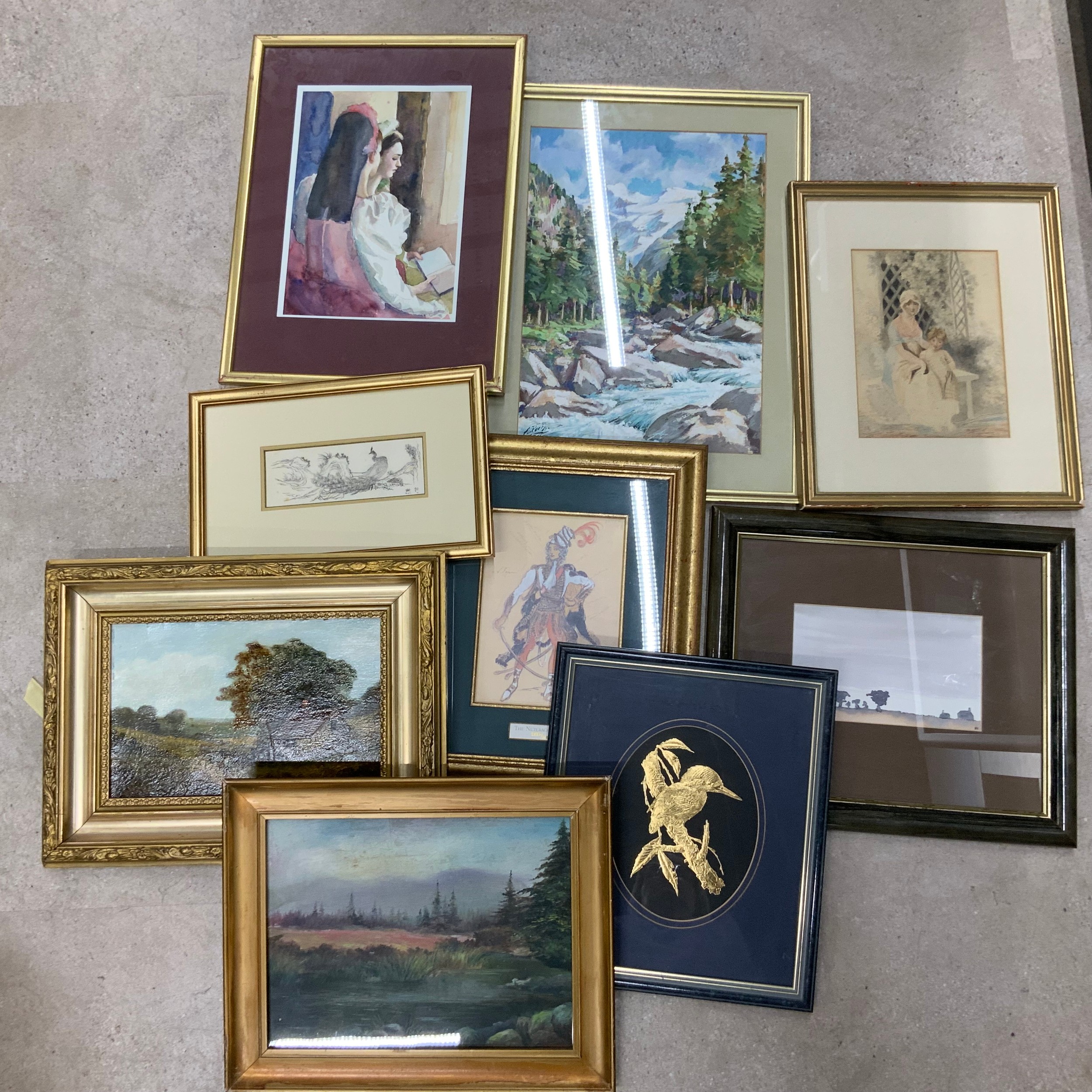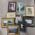 A collection of nine pictures, paintings and prints, to include watercolours, a portrait, a limited edition print, a mountain scene and others.