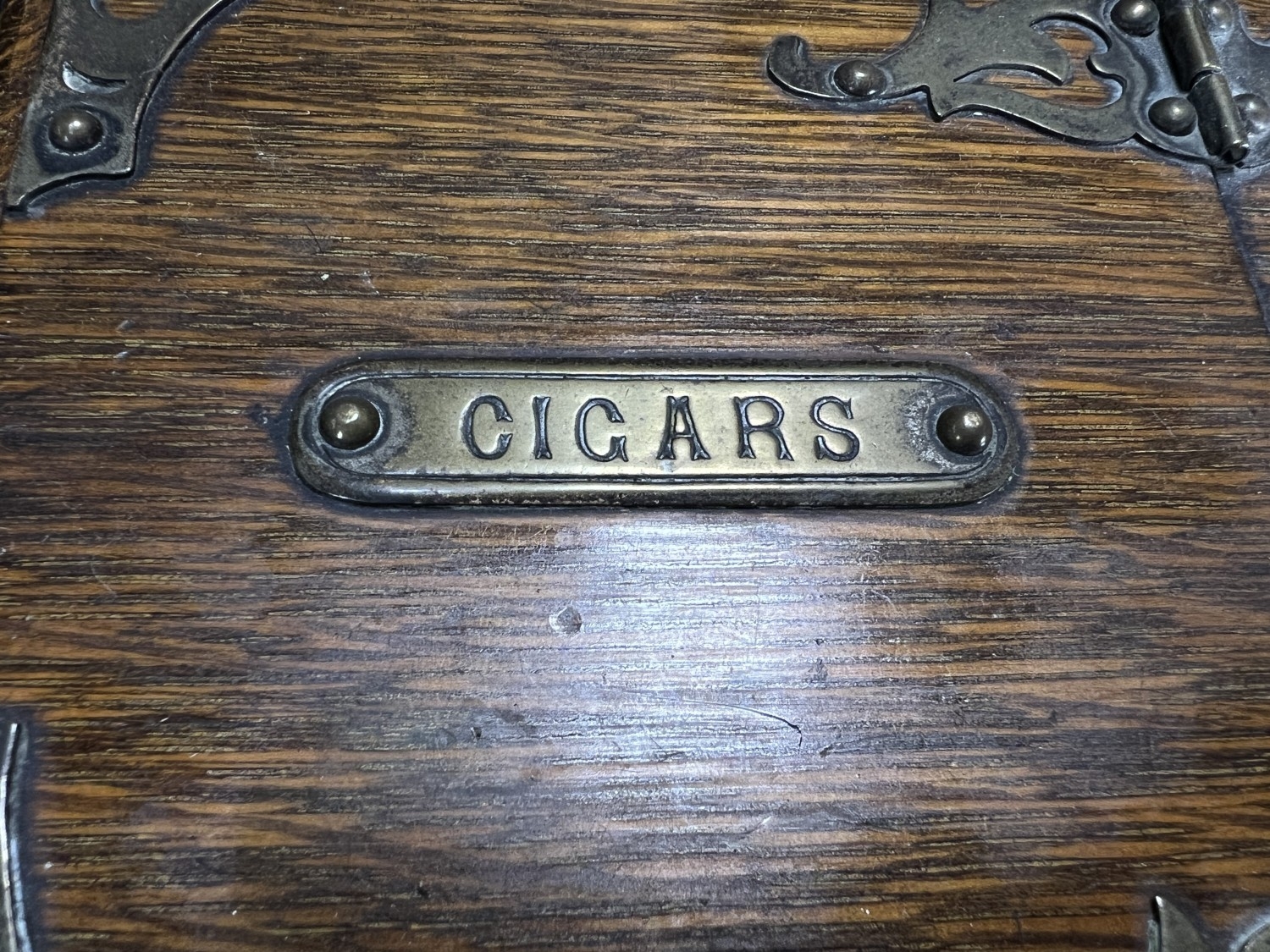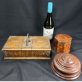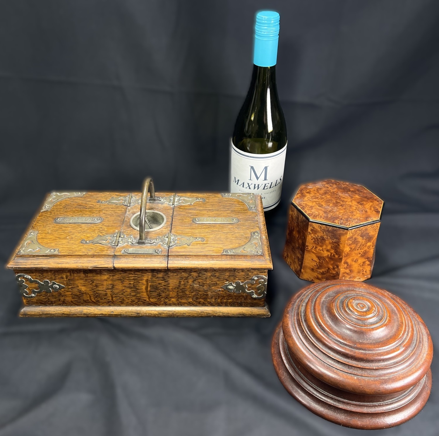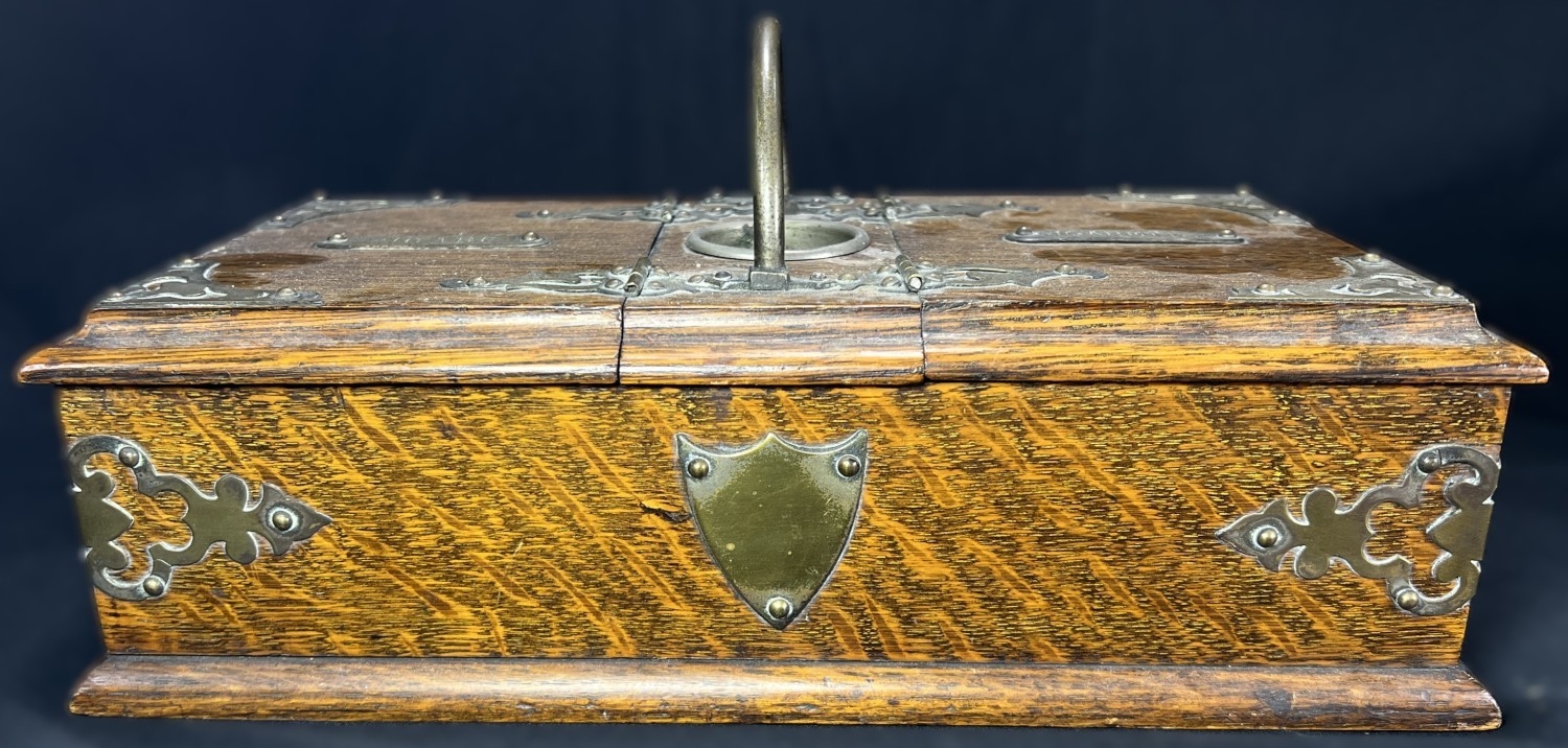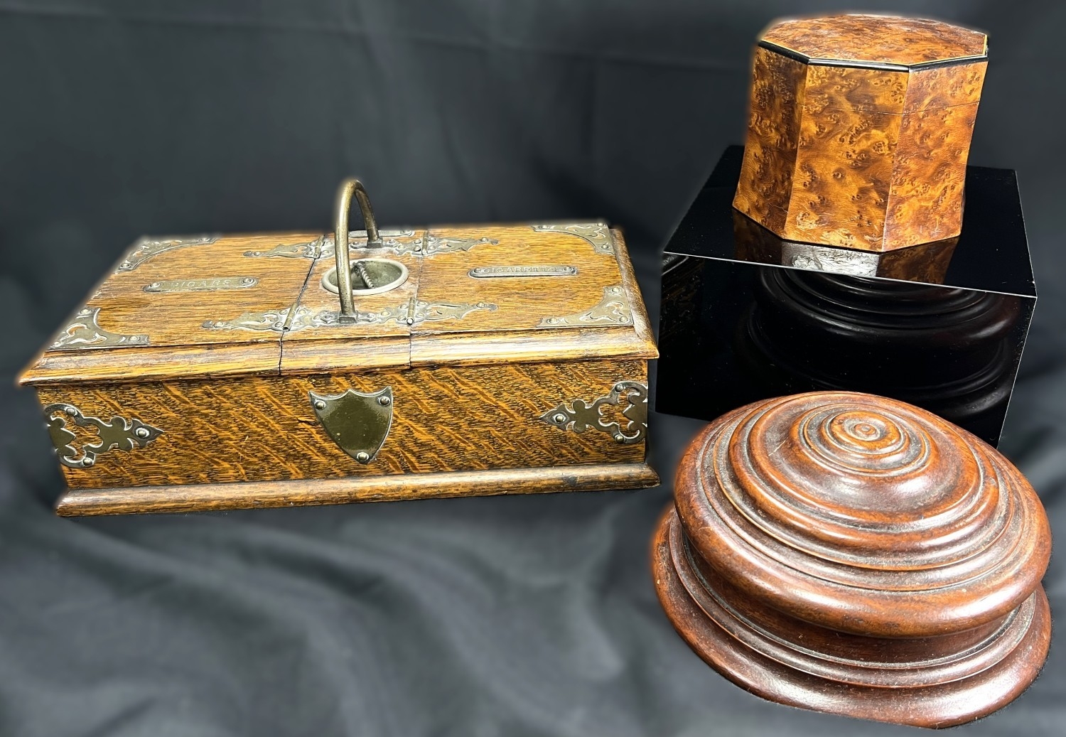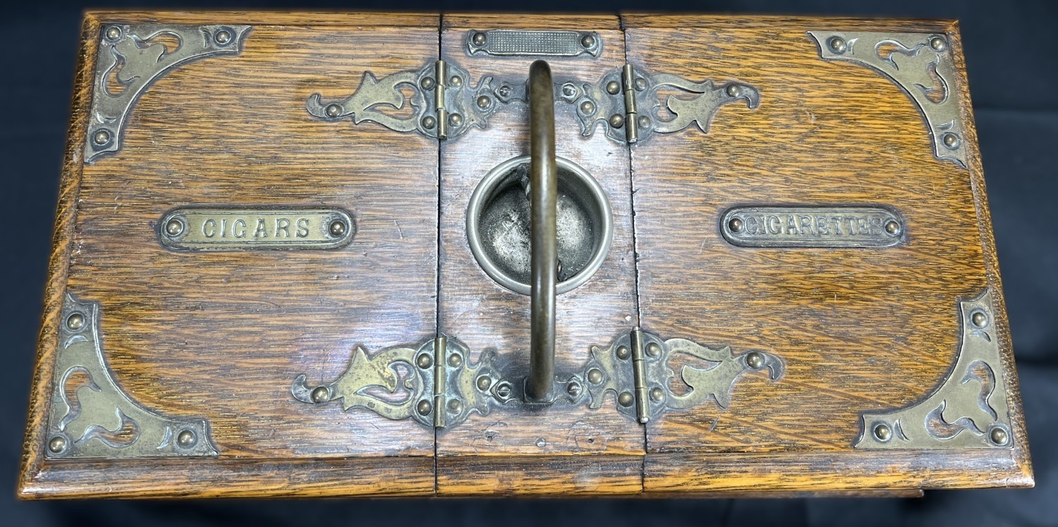 A Victorian oak humidor / smoking companion, space for cigars, cigarettes, matches etc and two other carved wooden humidors.