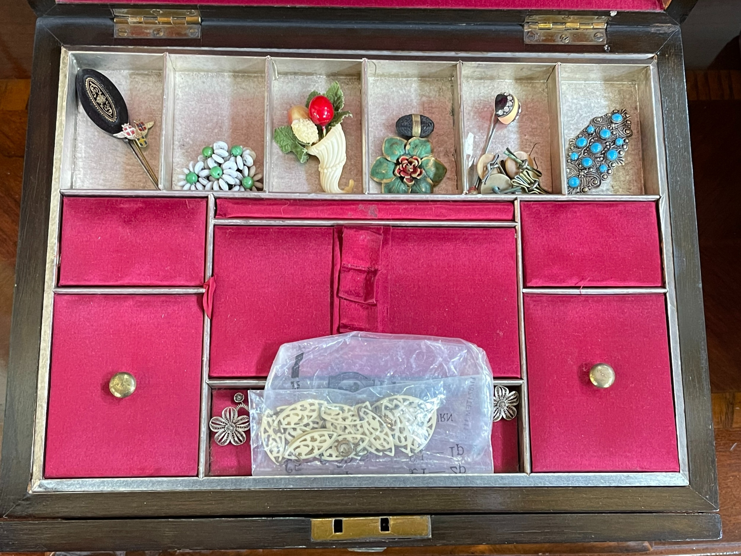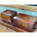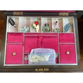 Mahogany and brass writing slope and a sewing box housing costume jewellery.
