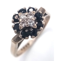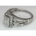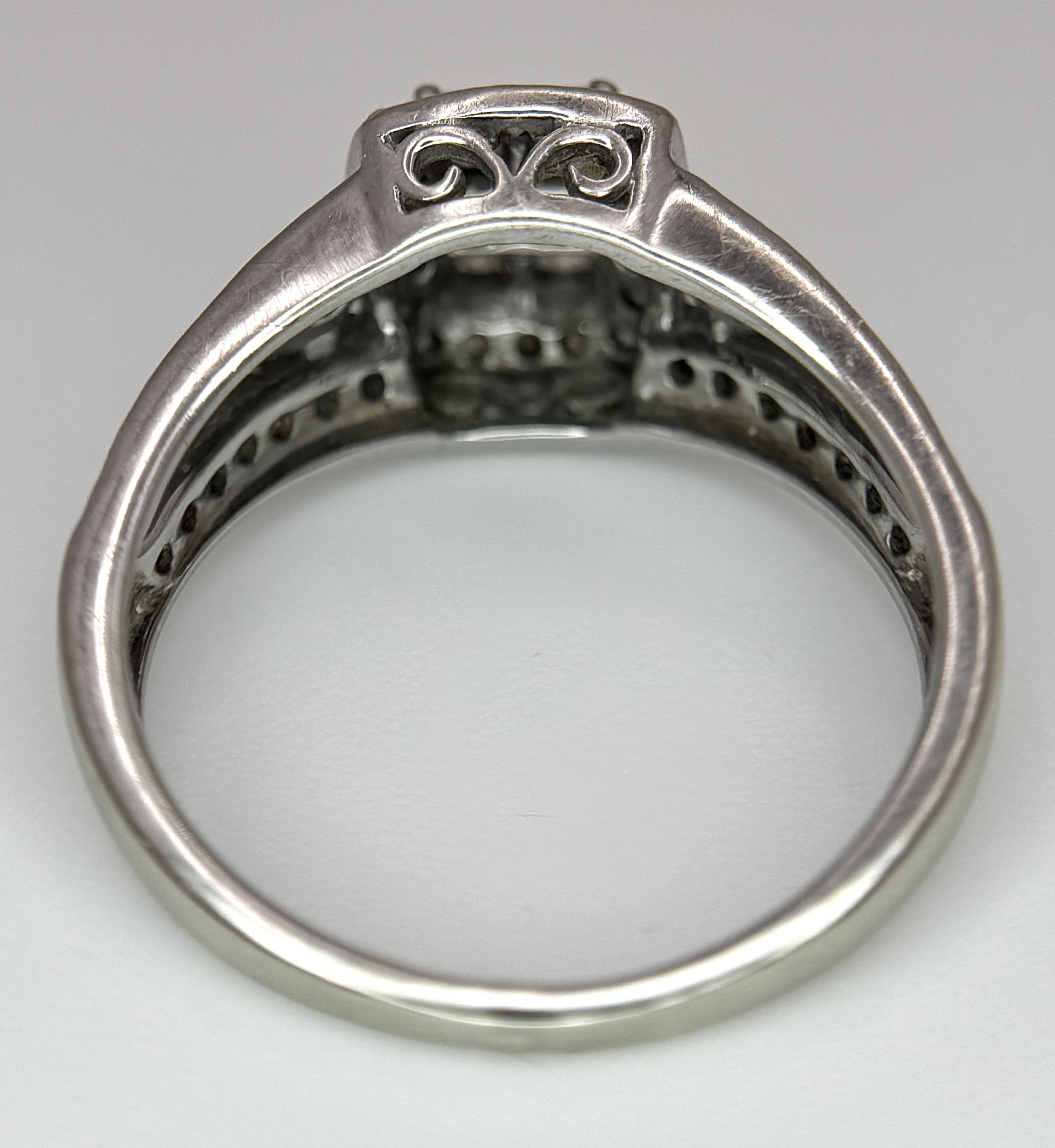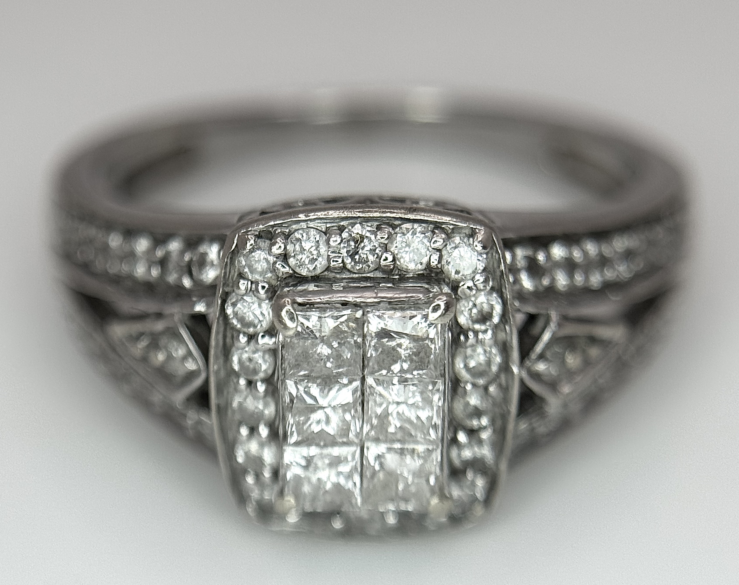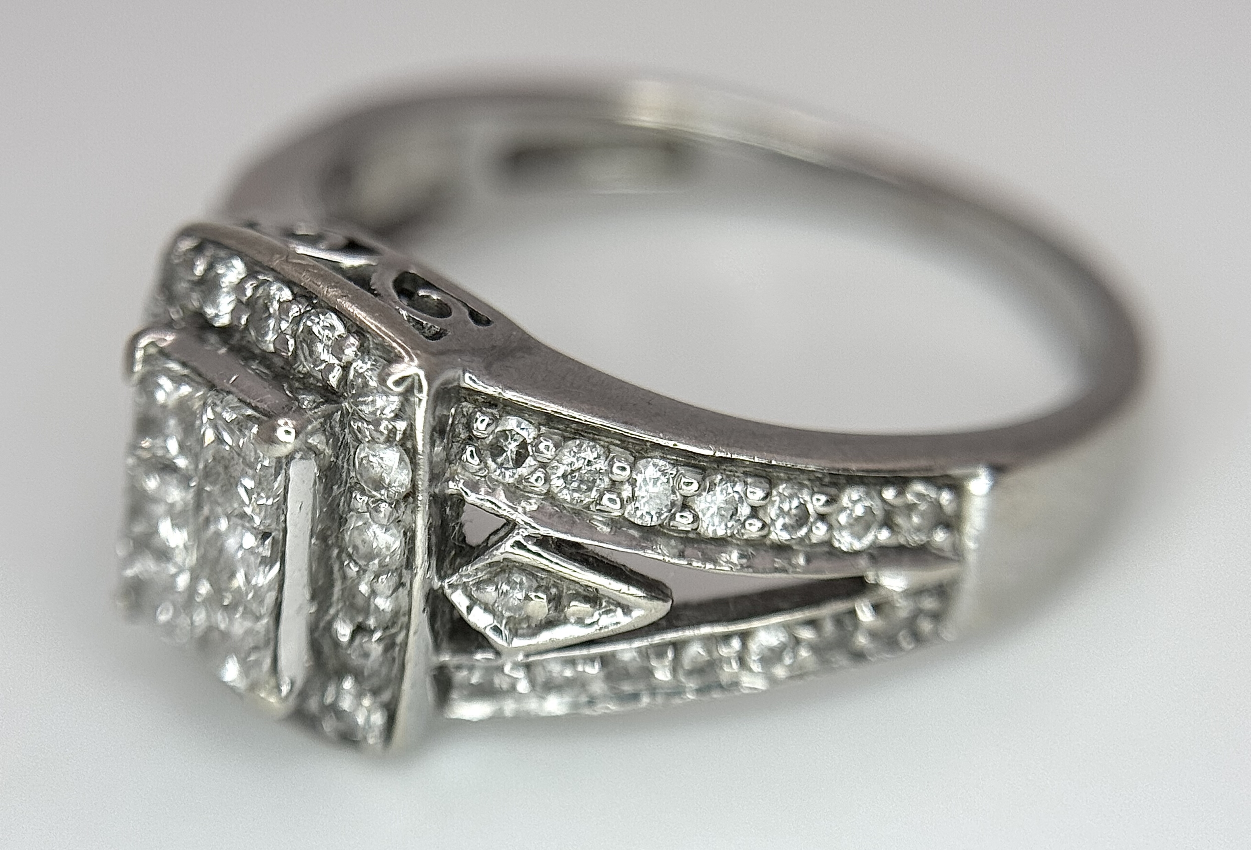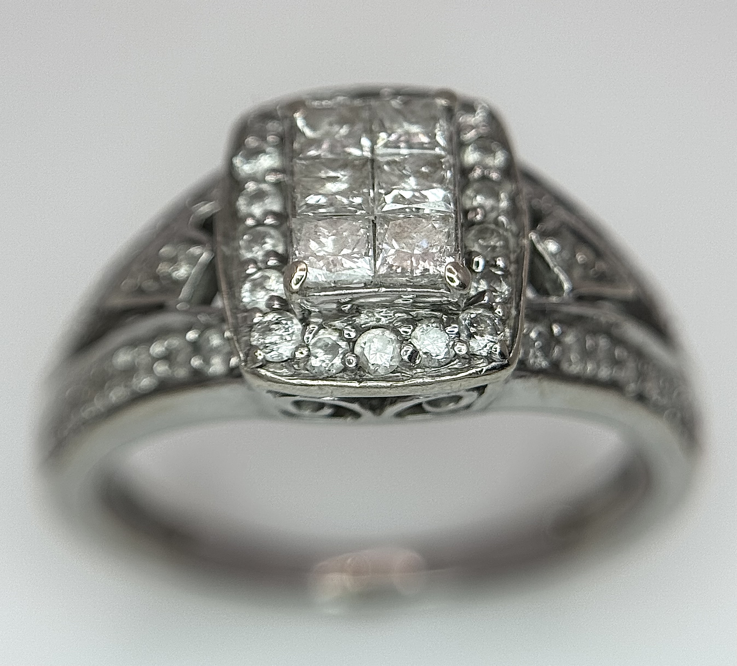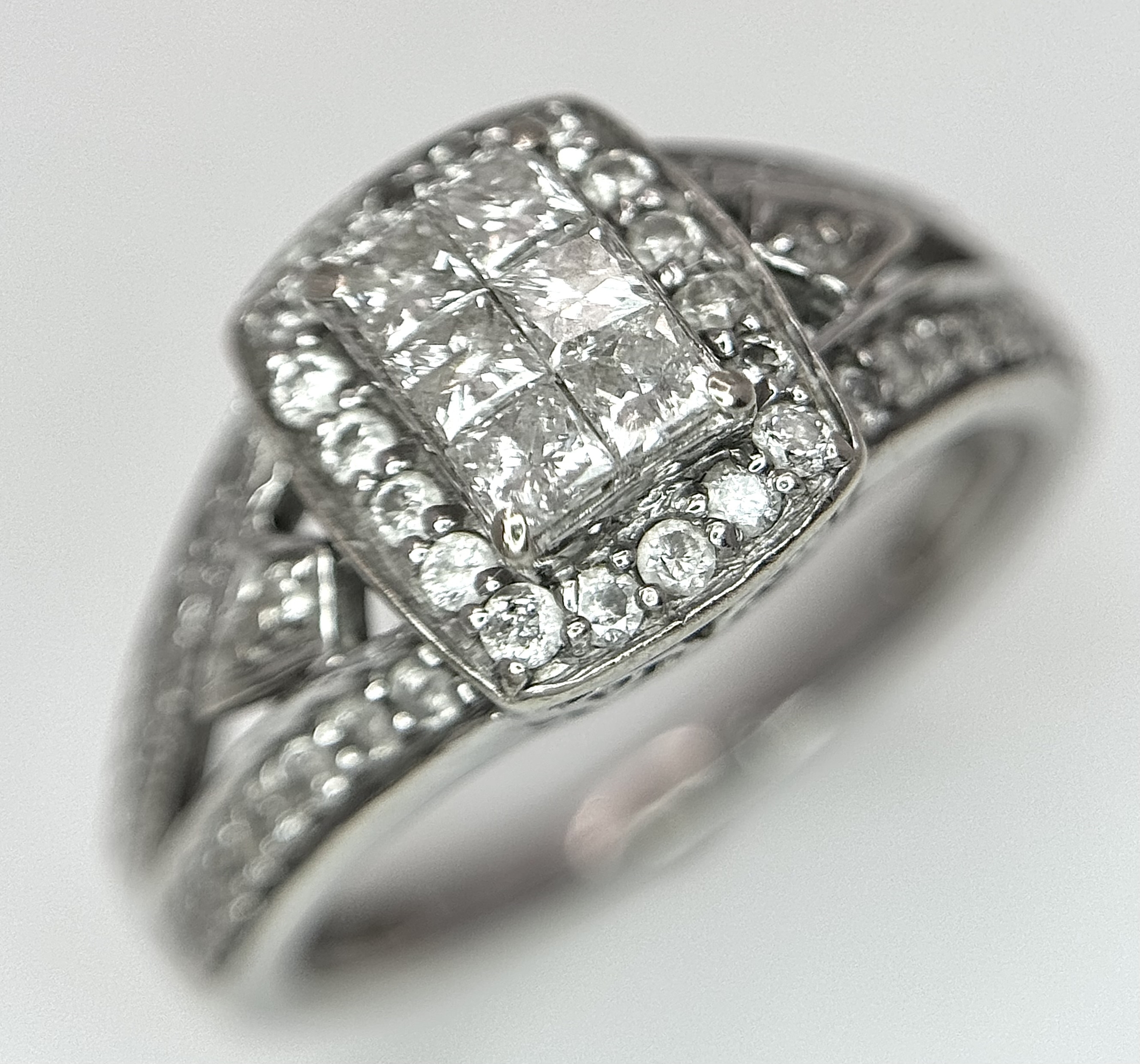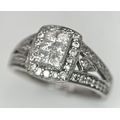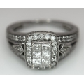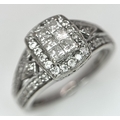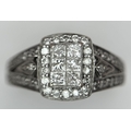 An Art Deco Style, 14K White Gold Diamond Cluster Ring. Set with c. 0.75ctw of high grade Princess and round cut diamonds. Size M 1/2. 4g total weight.