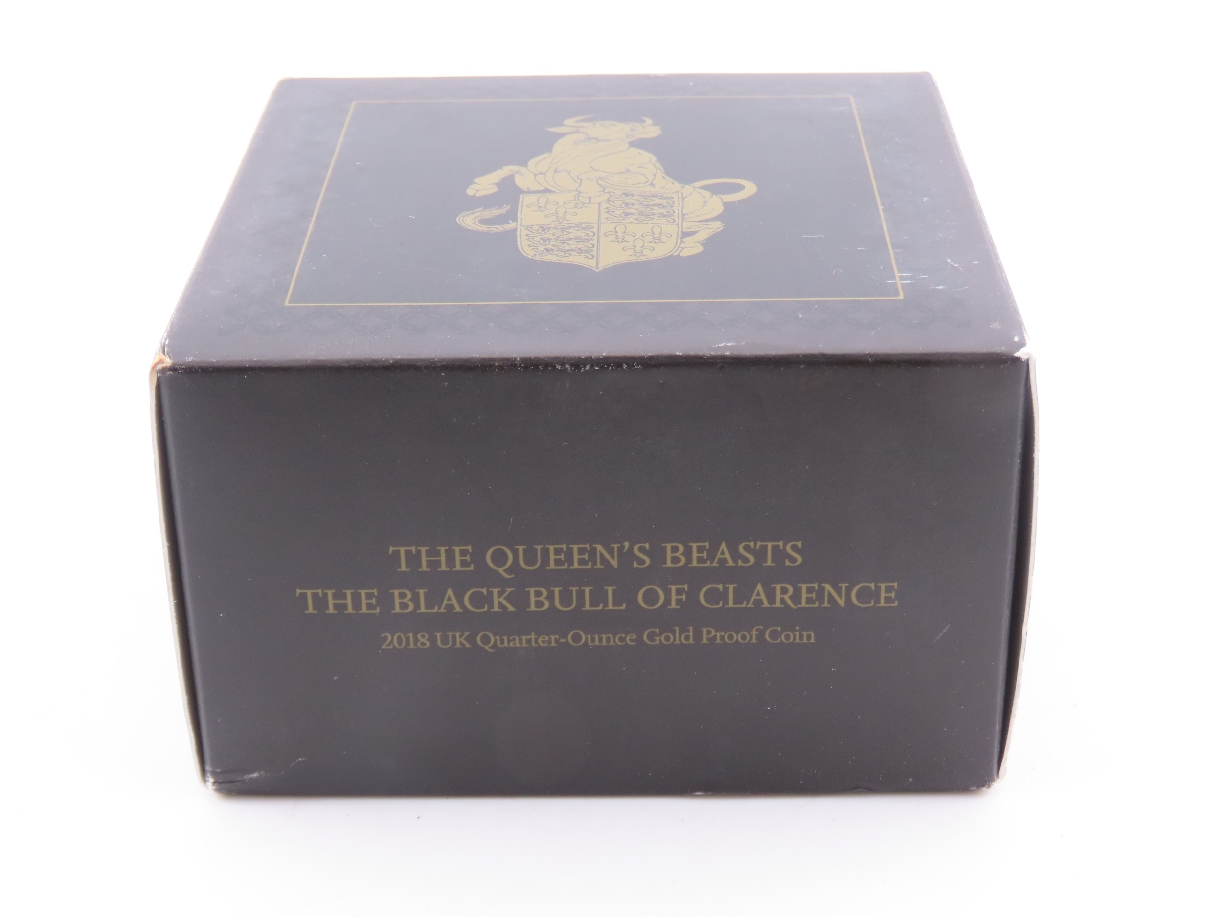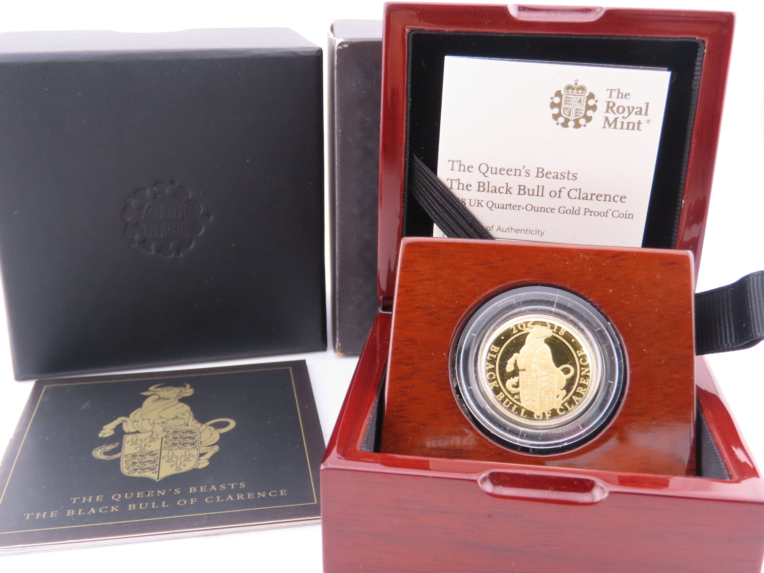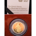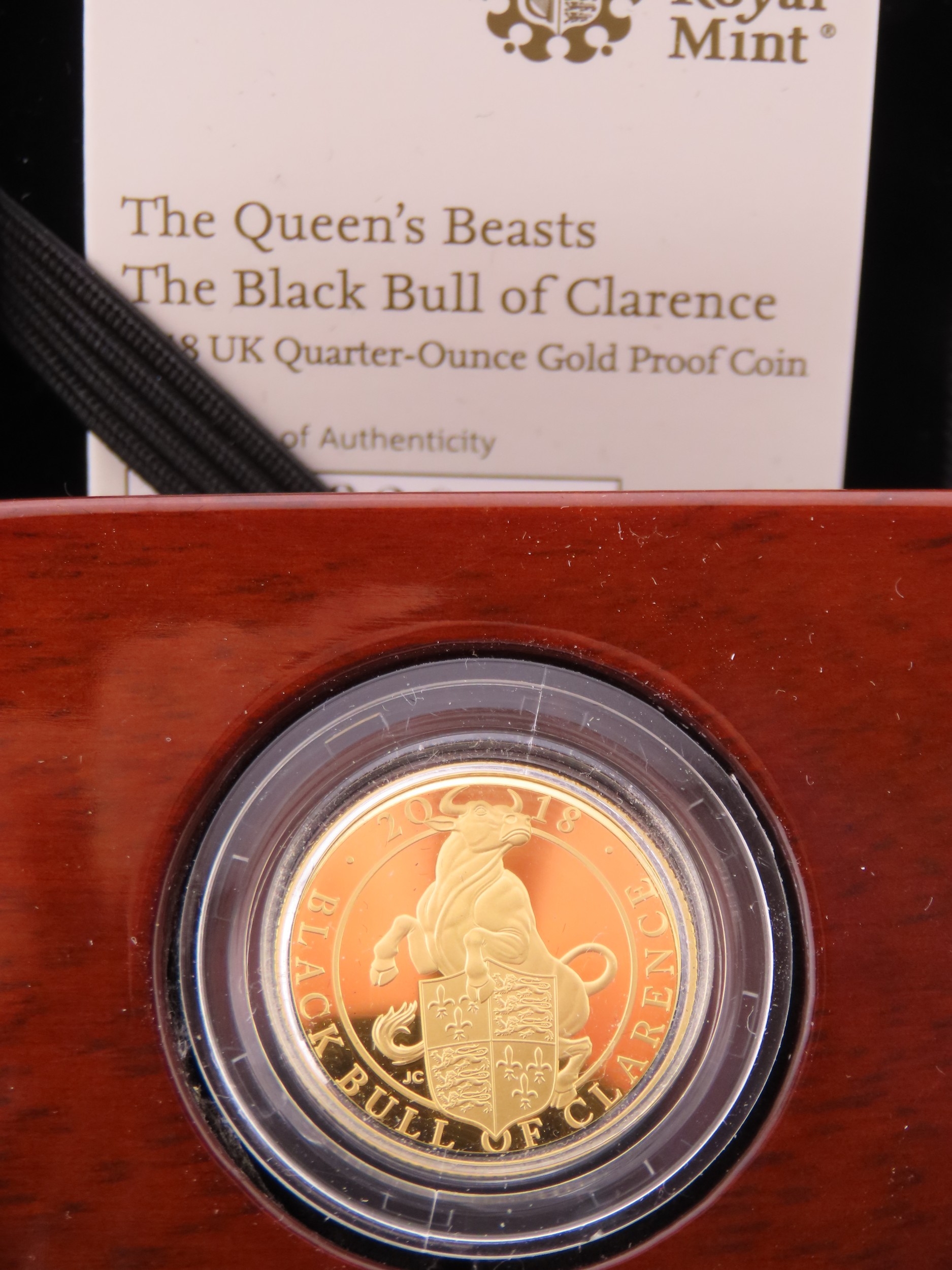 The Royal Mint Queens Beasts The Black Bull of Clarence gold proof coin. A United Kingdom 25 pound gold proof coin from The Royal Mint Queen?s Beasts series. Struck in 999.9 fine gold, weighing 7.80 grams and measuring 22.00 millimetres in diameter. Issued in proof quality with a maximum coin mintage of 1,500. Presented in the original Royal Mint wooden presentation case with outer packaging and certificate of authenticity.