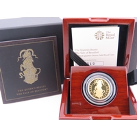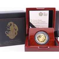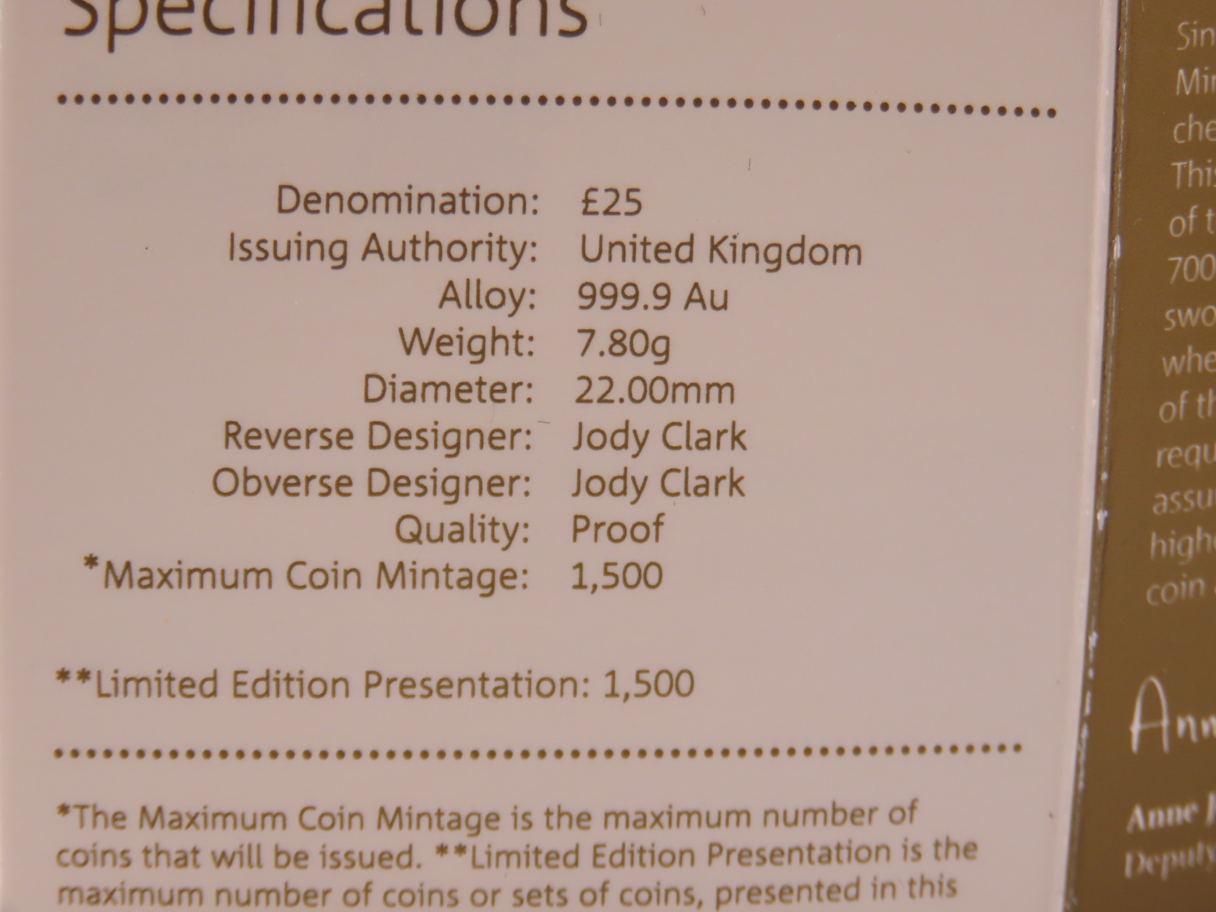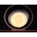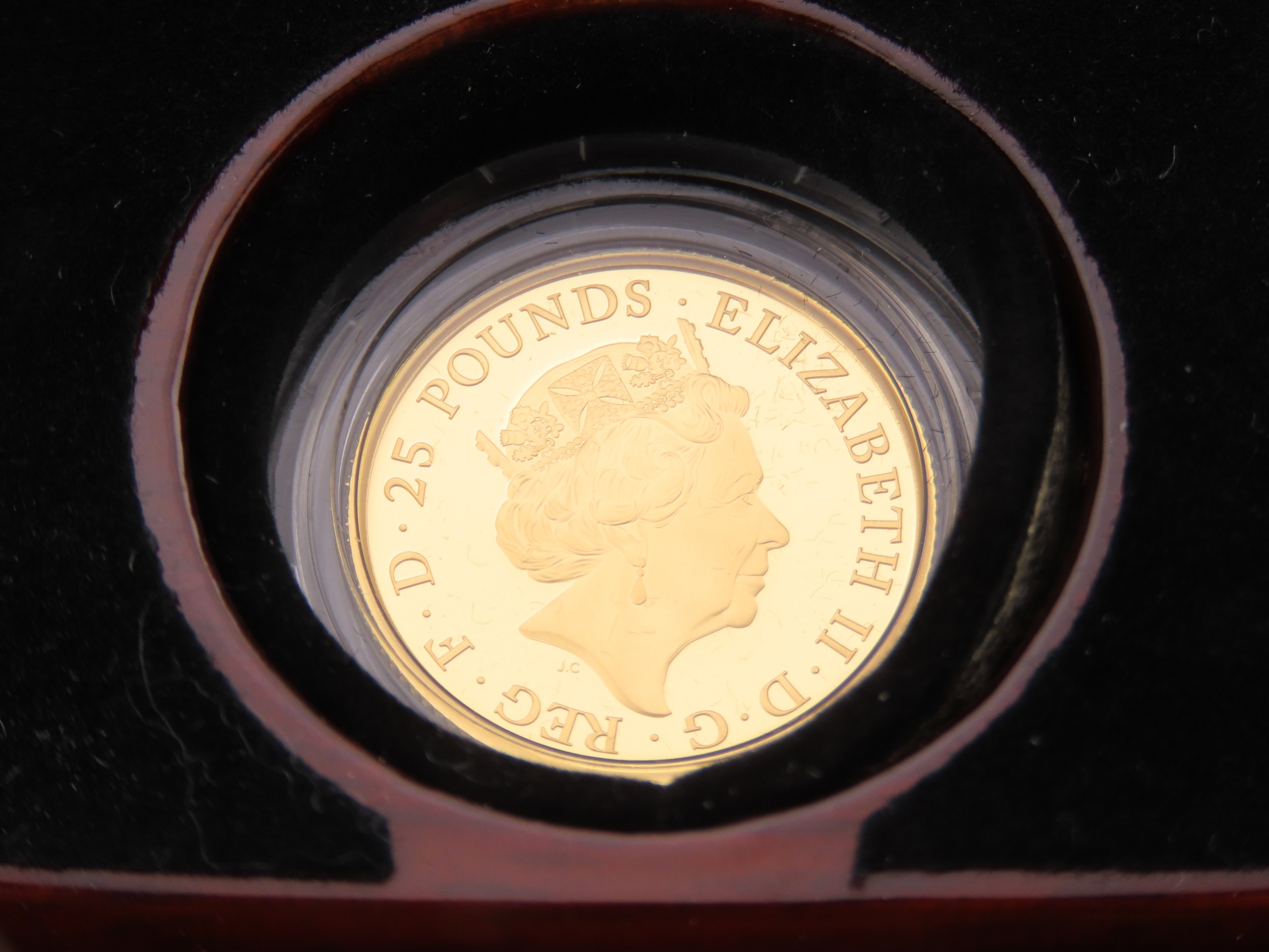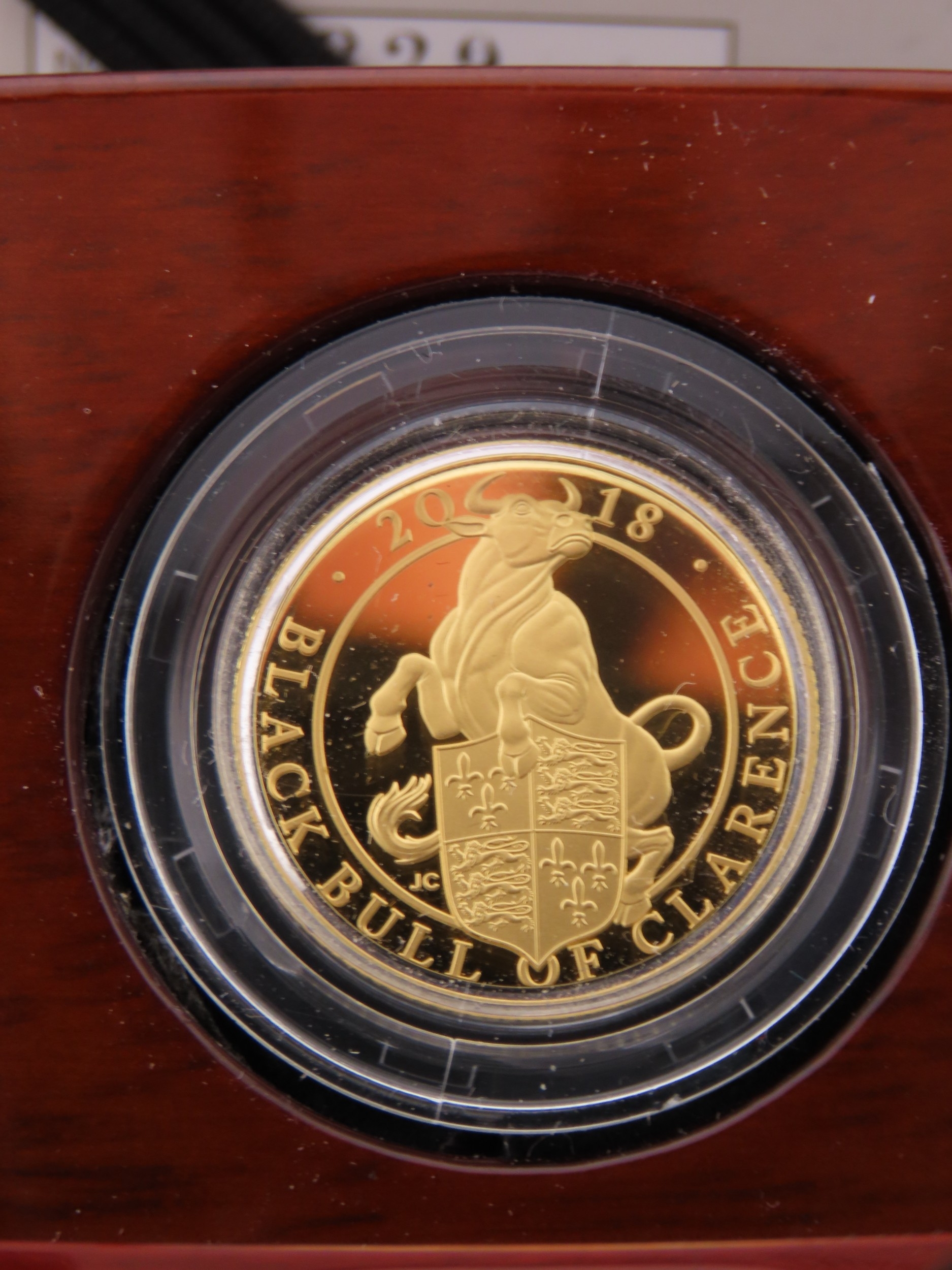 The Royal Mint Queens Beasts The Black Bull of Clarence gold proof coin. A United Kingdom 25 pound gold proof coin from The Royal Mint Queen?s Beasts series. Struck in 999.9 fine gold, weighing 7.80 grams and measuring 22.00 millimetres in diameter. Issued in proof quality with a maximum coin mintage of 1,500. Presented in the original Royal Mint wooden presentation case with outer packaging and certificate of authenticity.