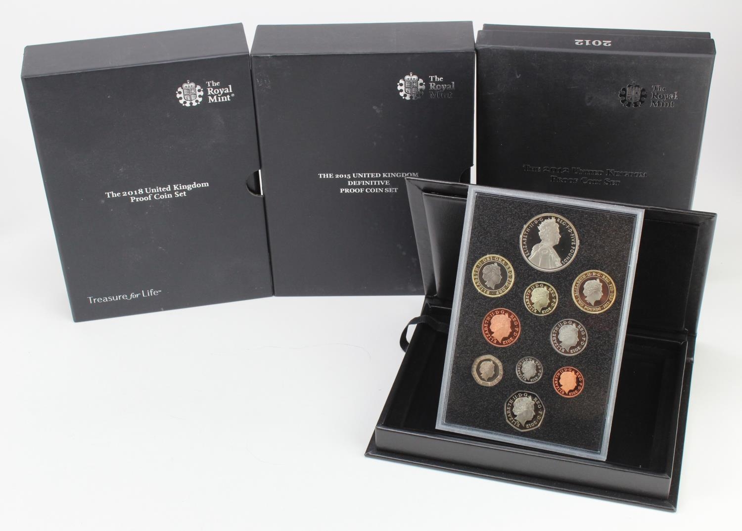 GB Proof Sets (3) 2012 (ten coins), 2015 "Definitive" & 2018 (thirteen coins). aFDC/FDC all cased as issued