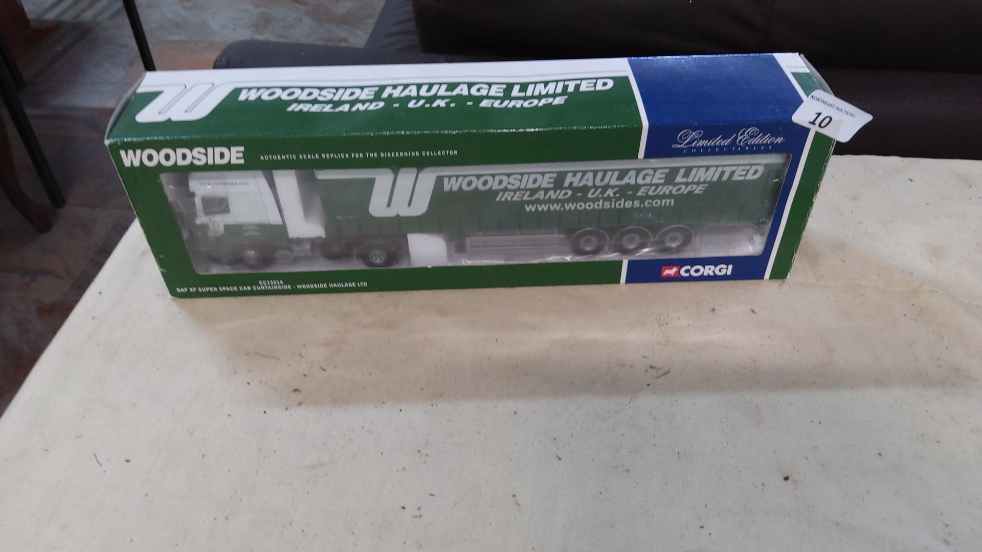 A boxed Corgi limited edition 1:50 scale die-cast model, DAF XF Super Space cab curtainside truck and trailer in Woodside Haulage Limited (Ireland–U.K.–Europe) livery, reference CC13214.