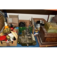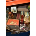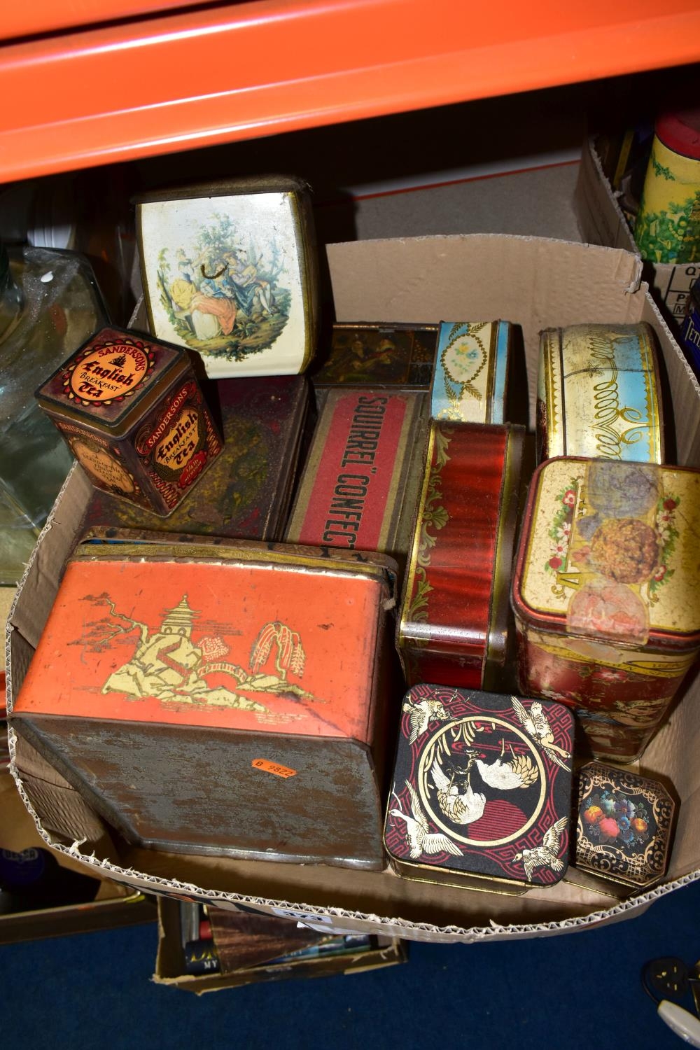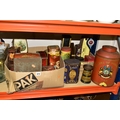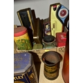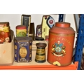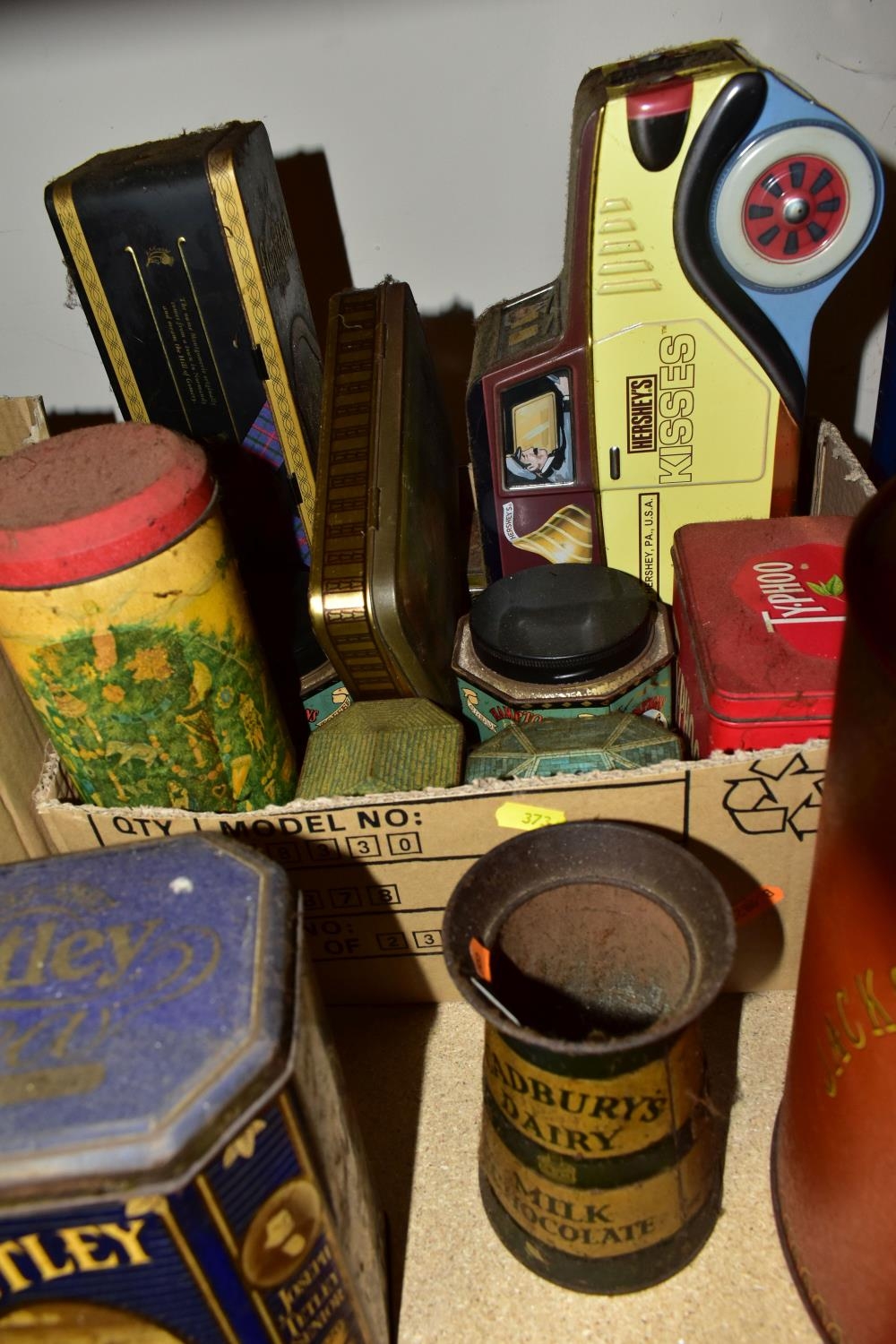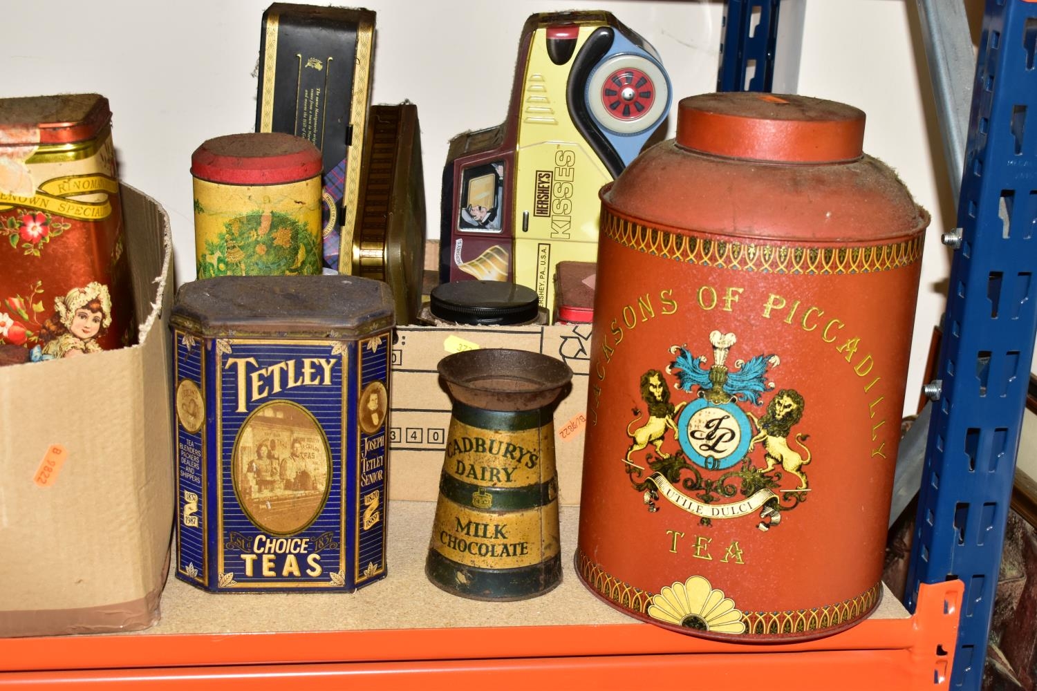 TWO BOXES AND LOOSE ADVERTISING TINS, twenty four mainly twentieth century tins to include a Cadbury's Dairy Milk Chocolate tin in the form of a milk churn (no lid), a large Jackson's of Piccadilly tea tin height 32cm, tins from brands including Wrights Biscuits Ltd South Shields, Sandersons English Breakfast Tea, Peak, Frean & Co Ltd biscuits, Tetley and Typhoo teas, Hamptons Toffee, Hershey's Kisses, etc (2 boxes + loose) (sd, dirty and rusty)