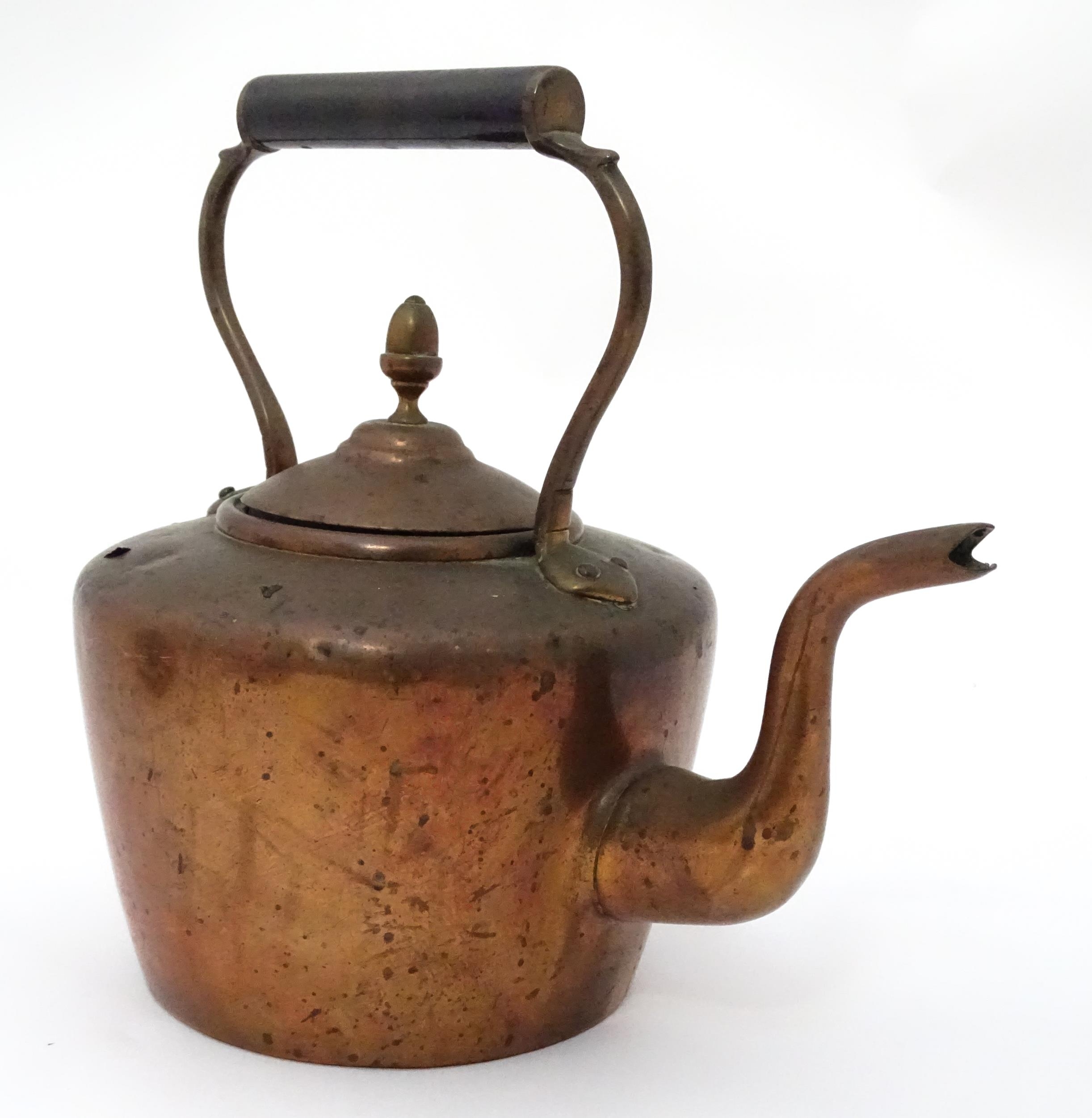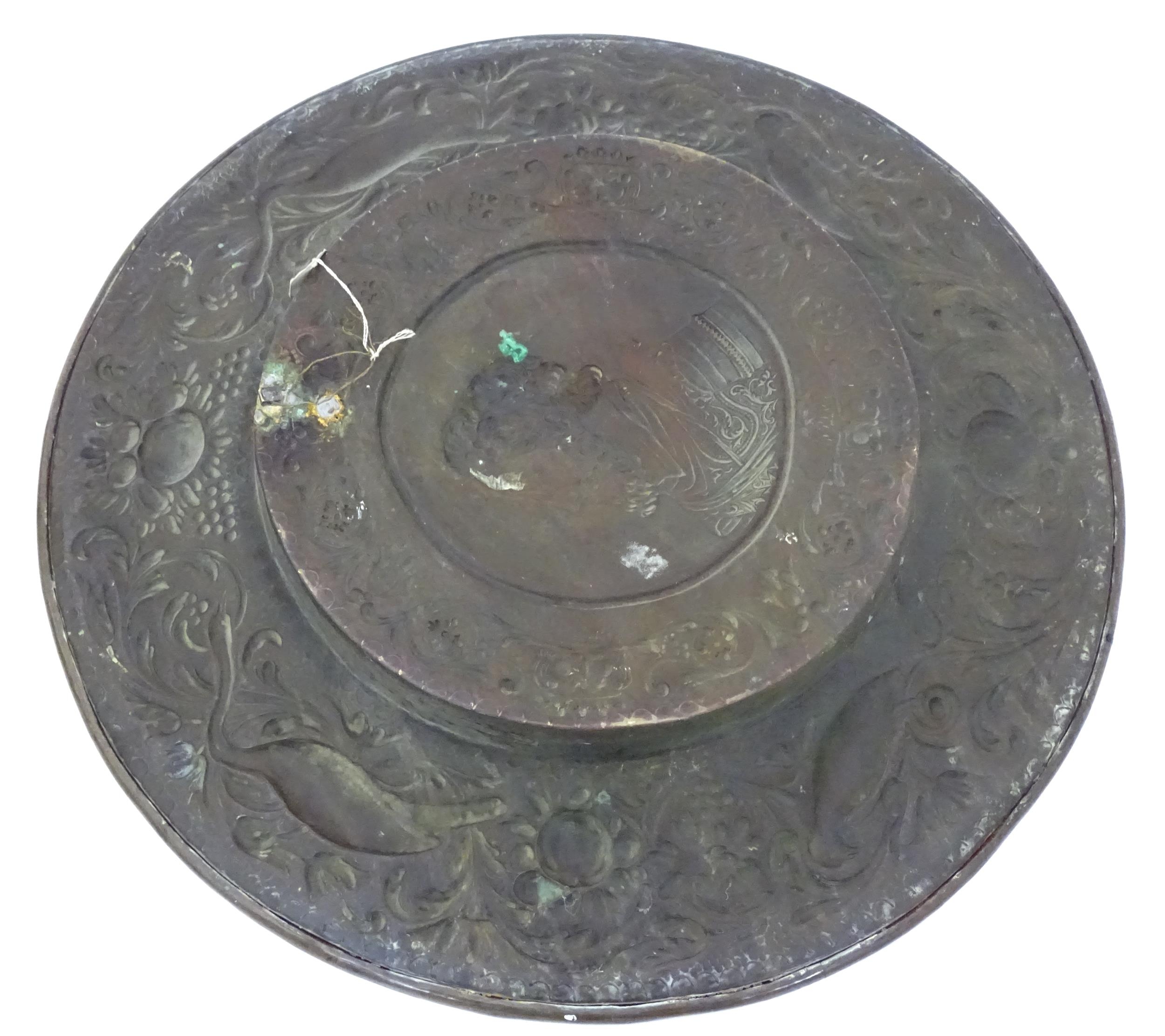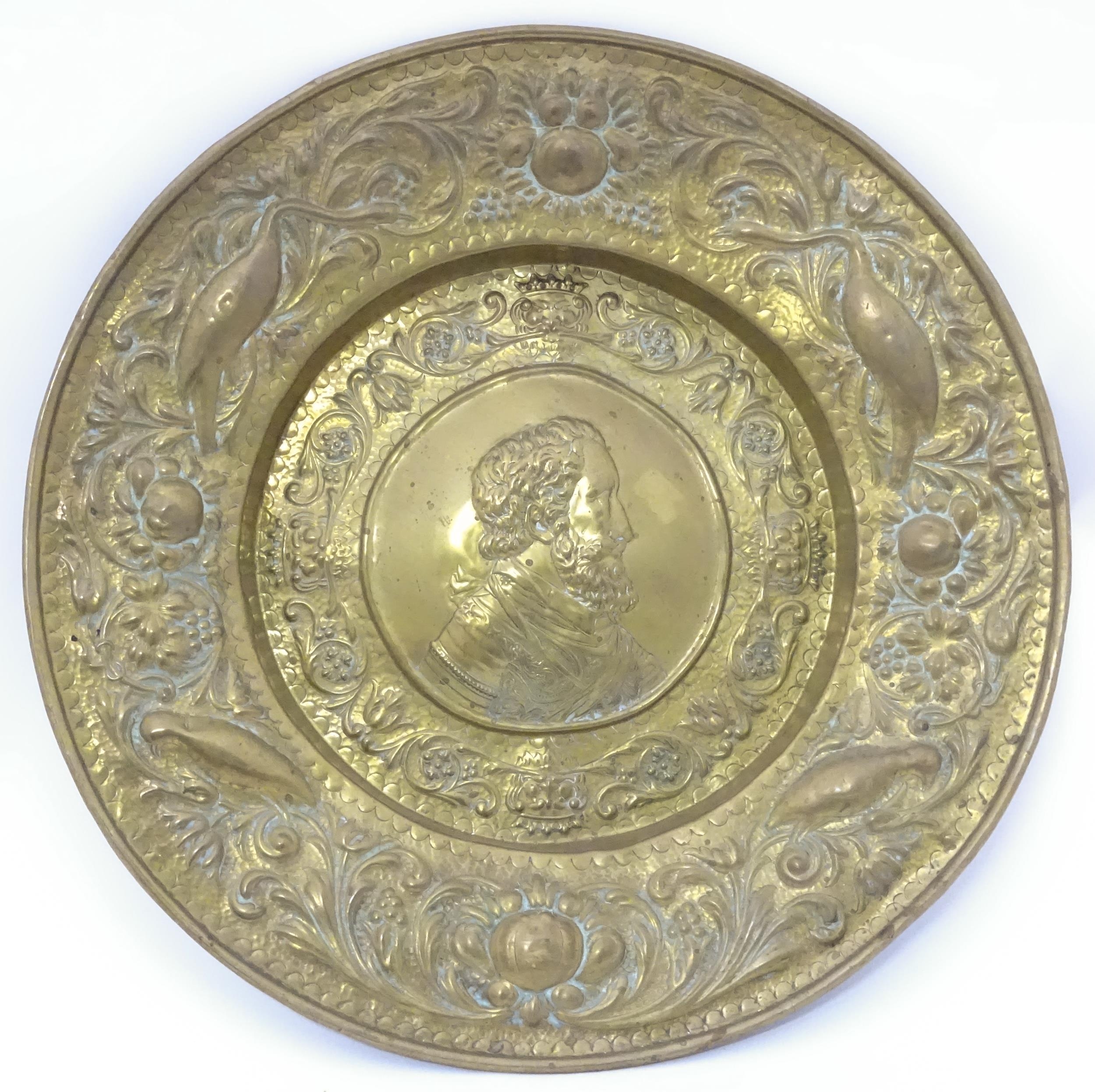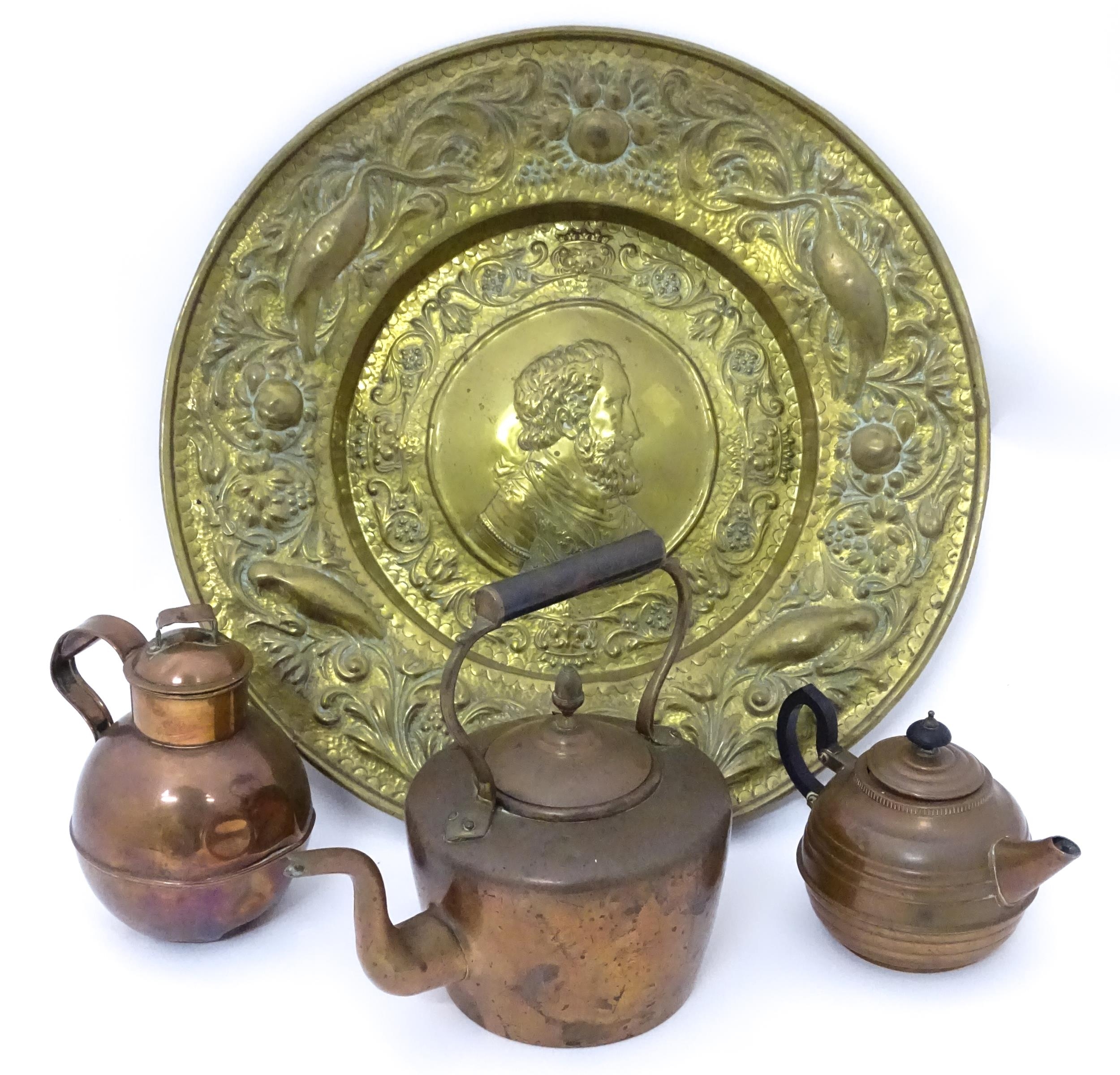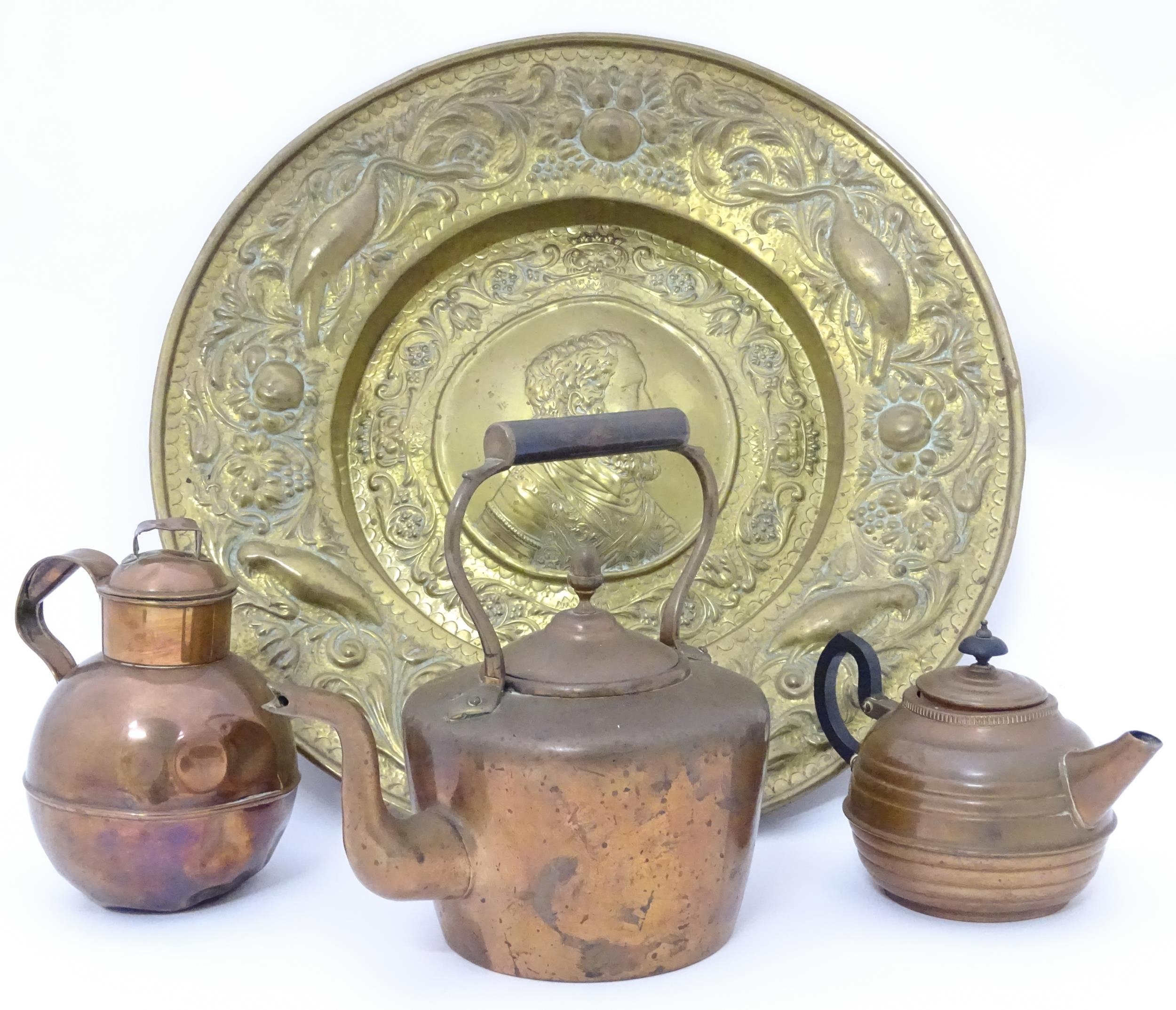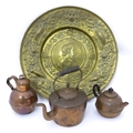 A quantity of brass and copper to include a copper kettle, teapot and jug together with a large brass charger, the largest approx 24" in diameter (4)