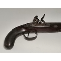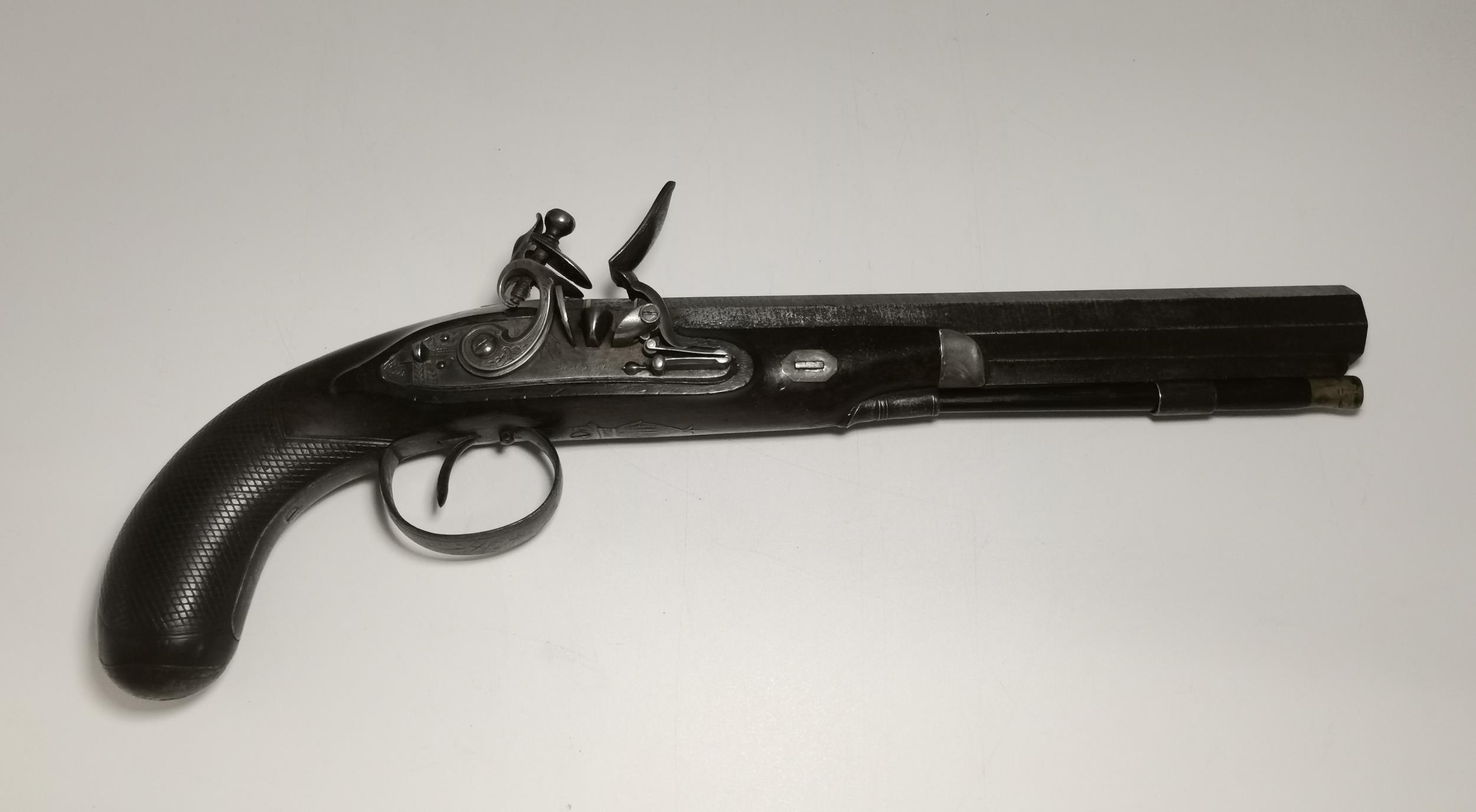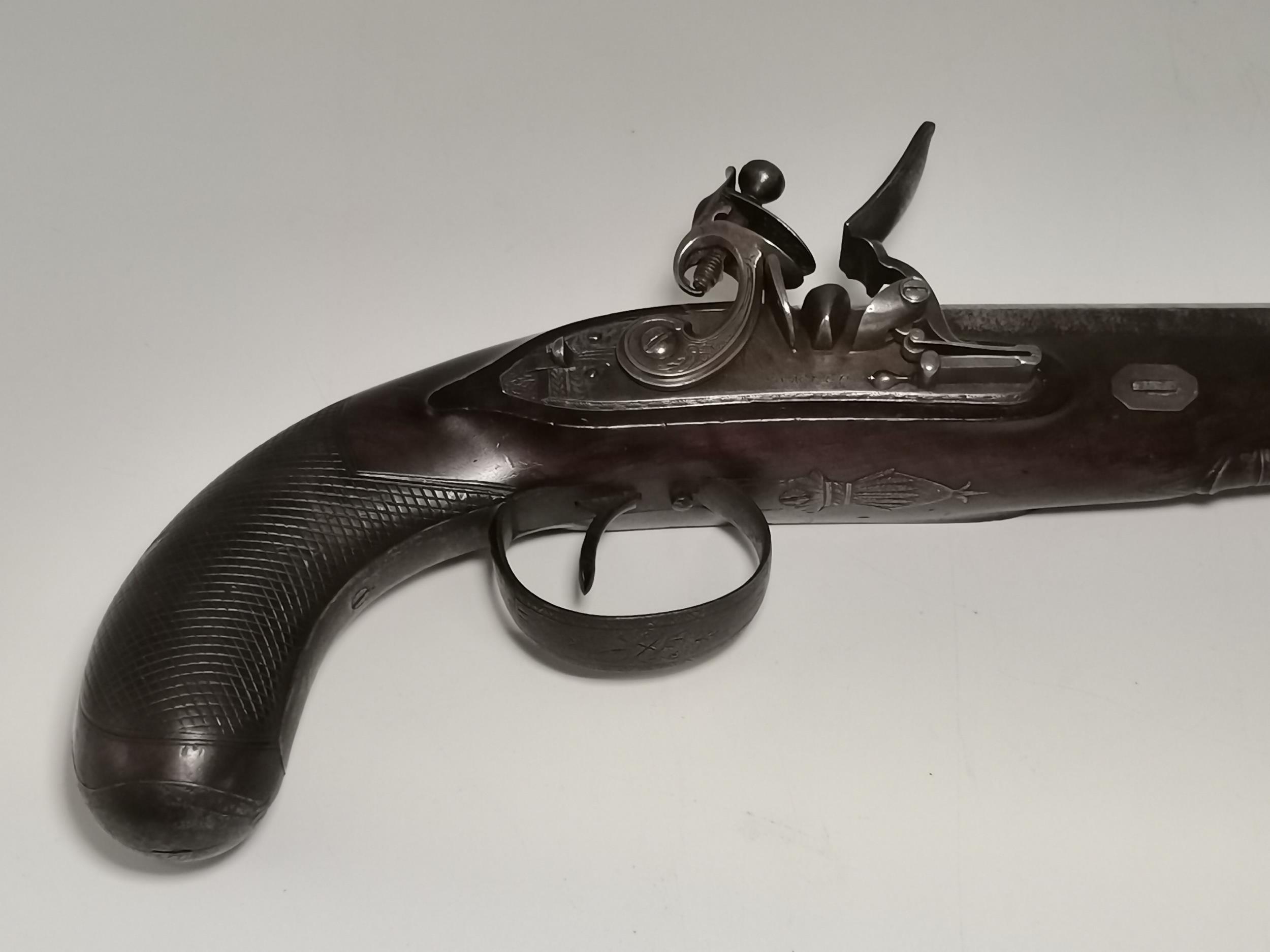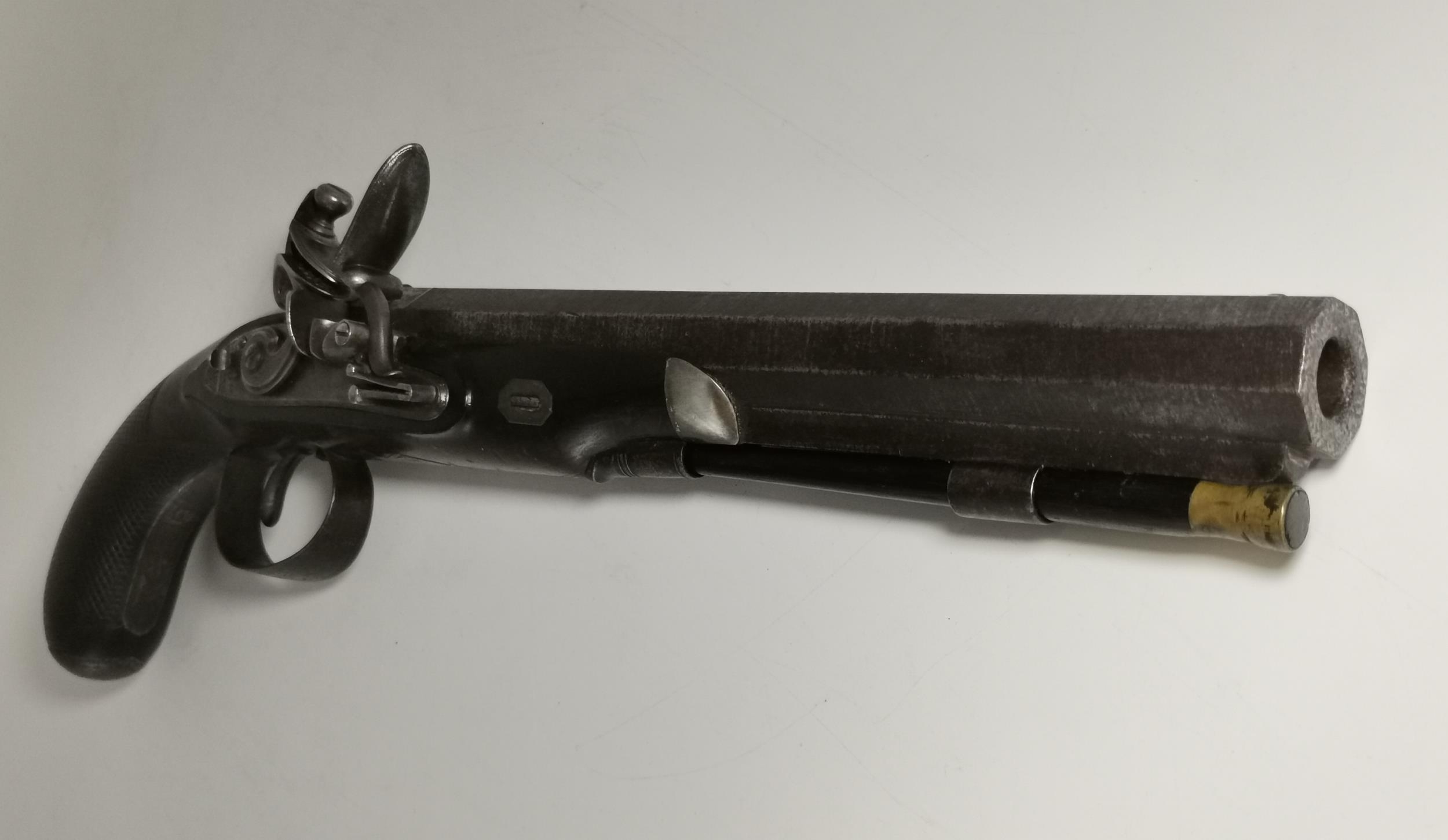 Smith of London: A late 18th/early 19th Century flintlock duelling pistol, the 9¾" octagonal Damascus steel barrel with twin gilt-metal bands and poinçon on the breech stamped SMITH LONDON, with silvered bead fore-sight and barrel mounts, the walnut stock with chequered grip, the lockplate with slide safety and signed SMITH, the steel furniture variously engraved with foliage, globe and shield, the trigger guard with spurred wheatsheaf finial, with brass-tipped wooden ramrod. 38.5cm long overall