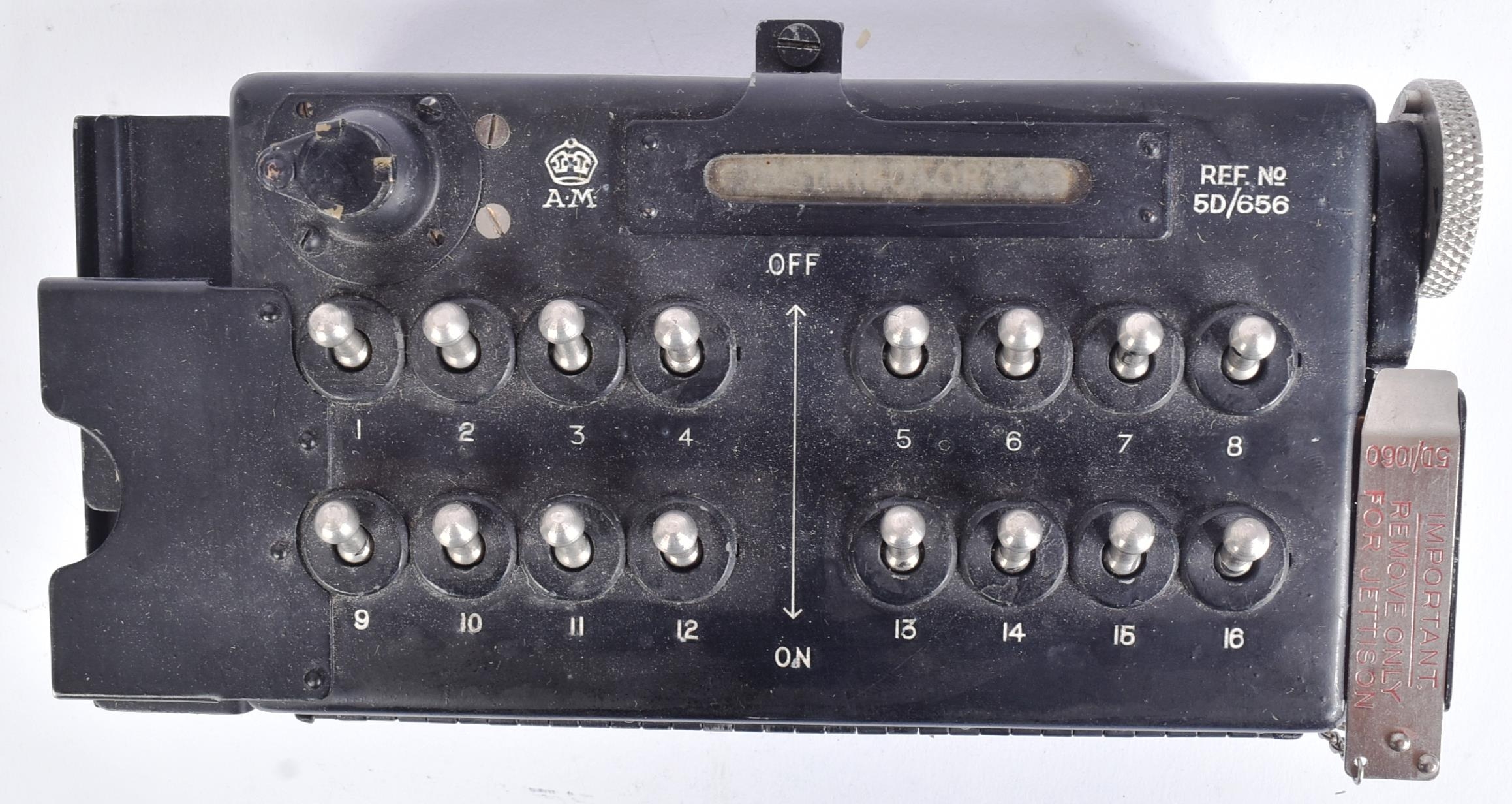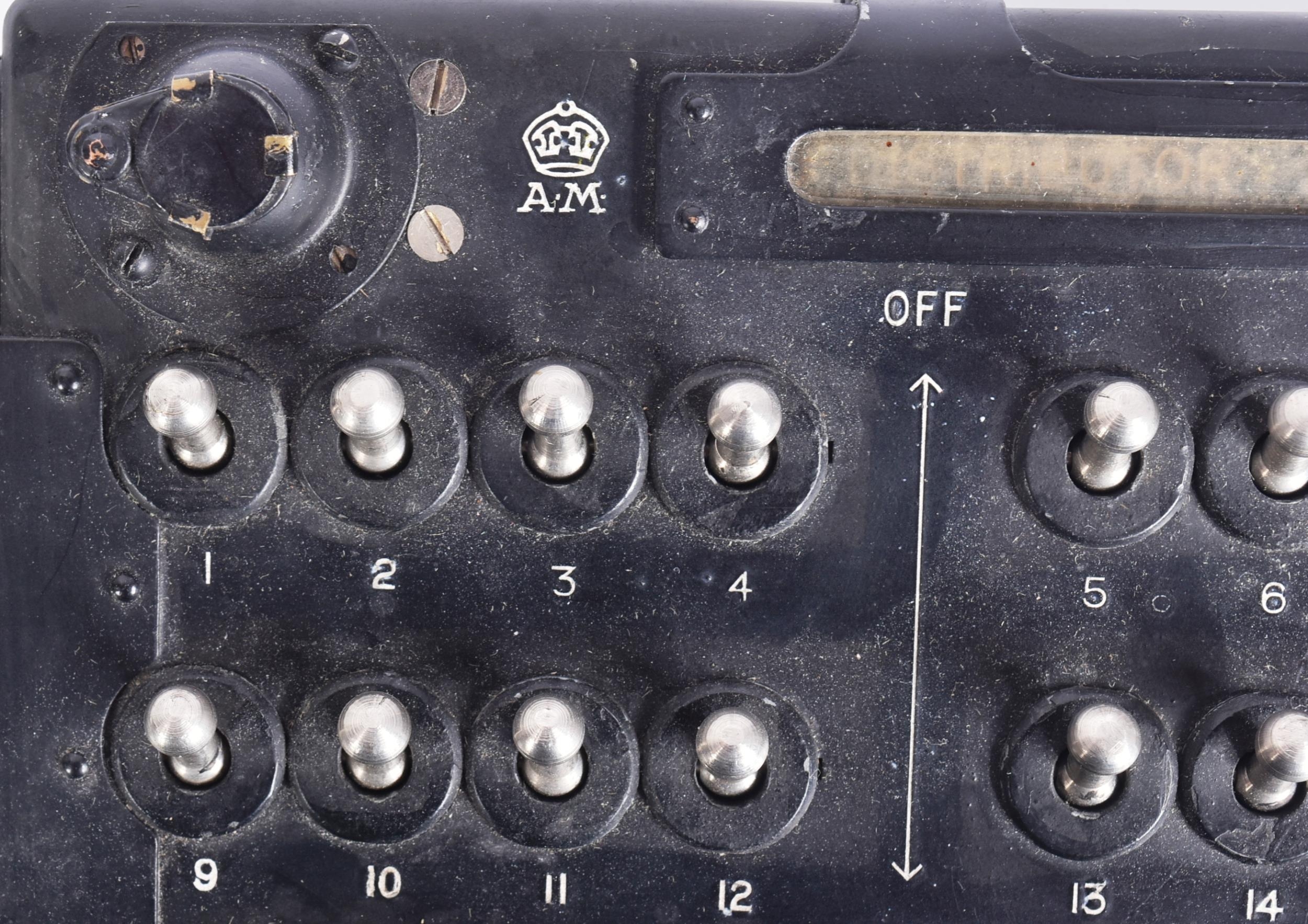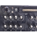 A WWII Second World War Lancaster Bomb-Aimers Bomb compartment arming switch panel. The switch panel features various official Air Ministry markings, and would have been used in a standard bomb aimer panel in an Avro Lancaster . The unit appears to be in working order with all switches still locking, and the 'mode selector' still turning.