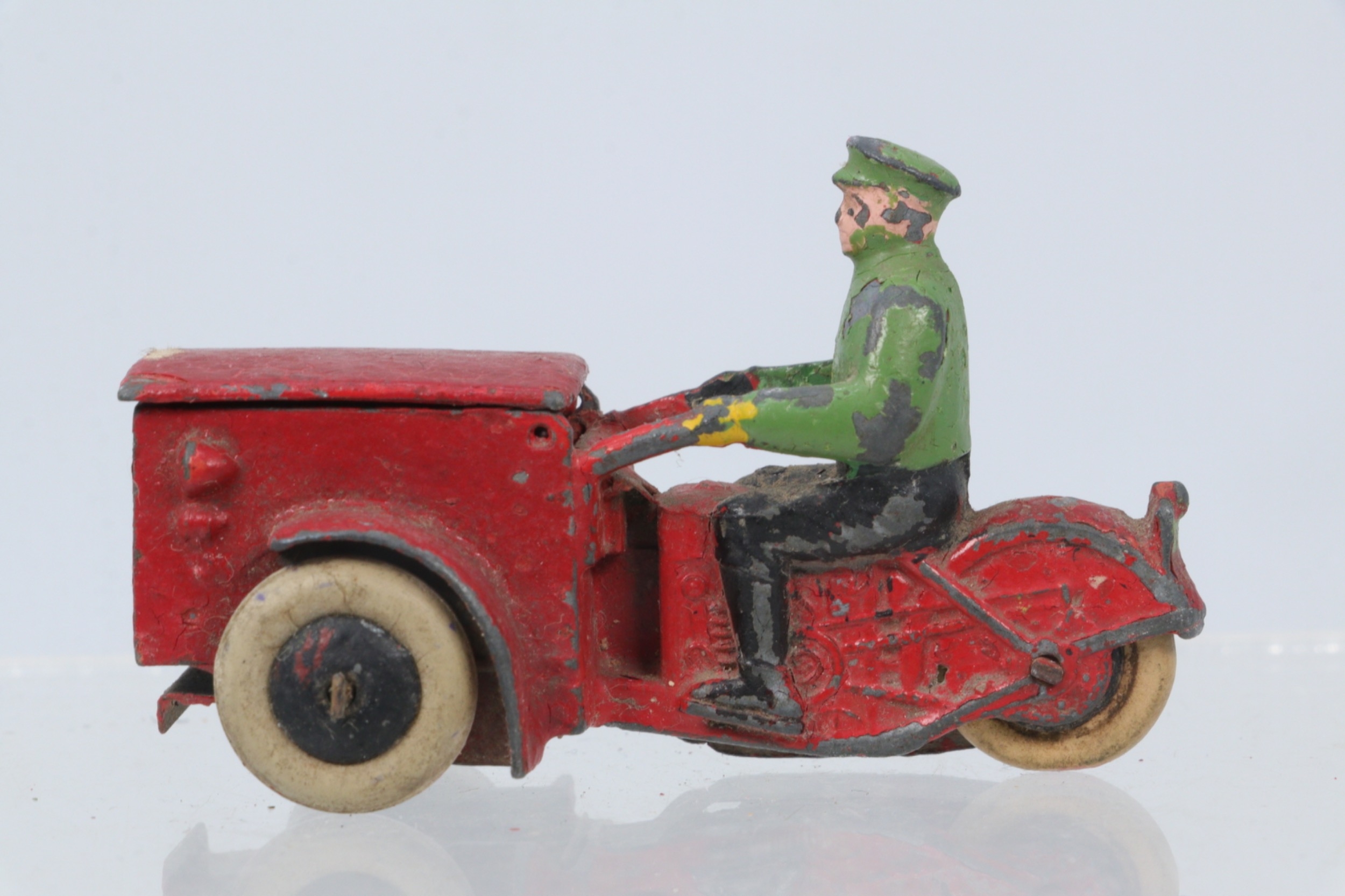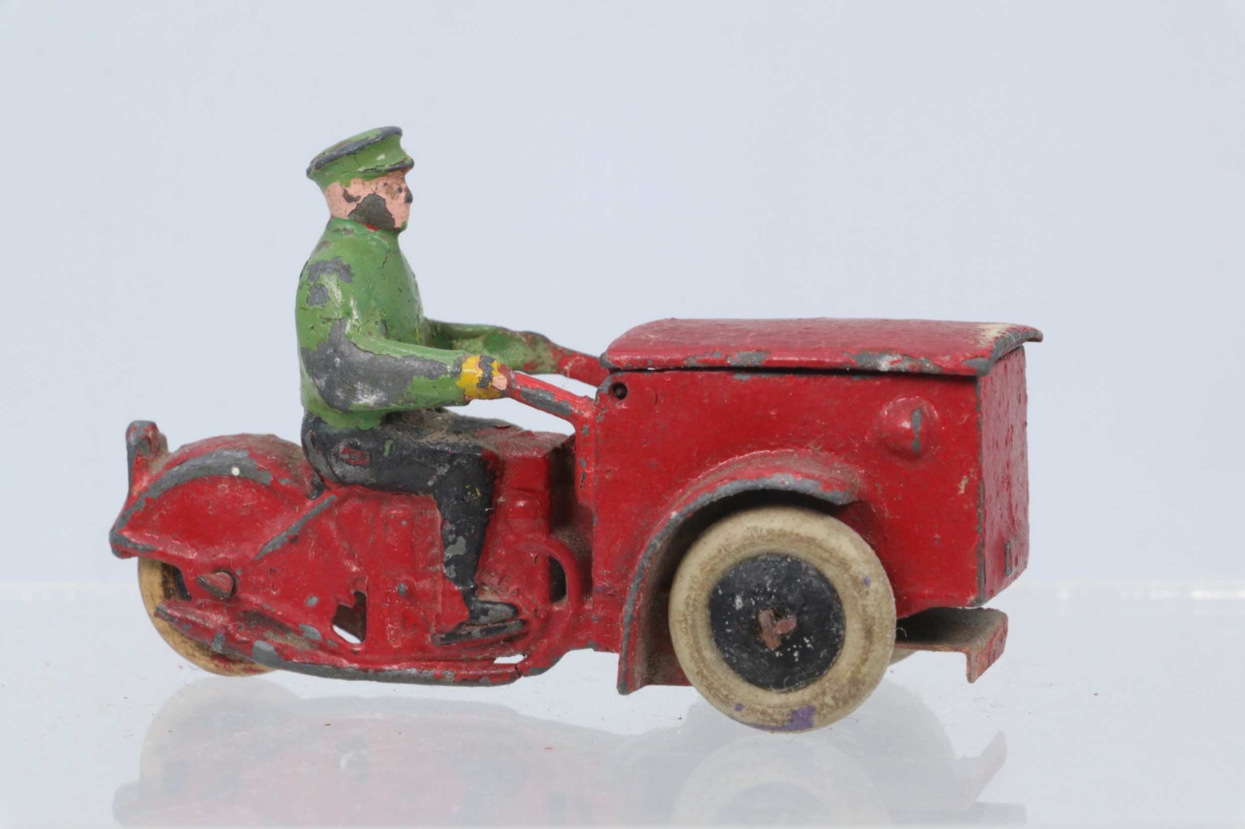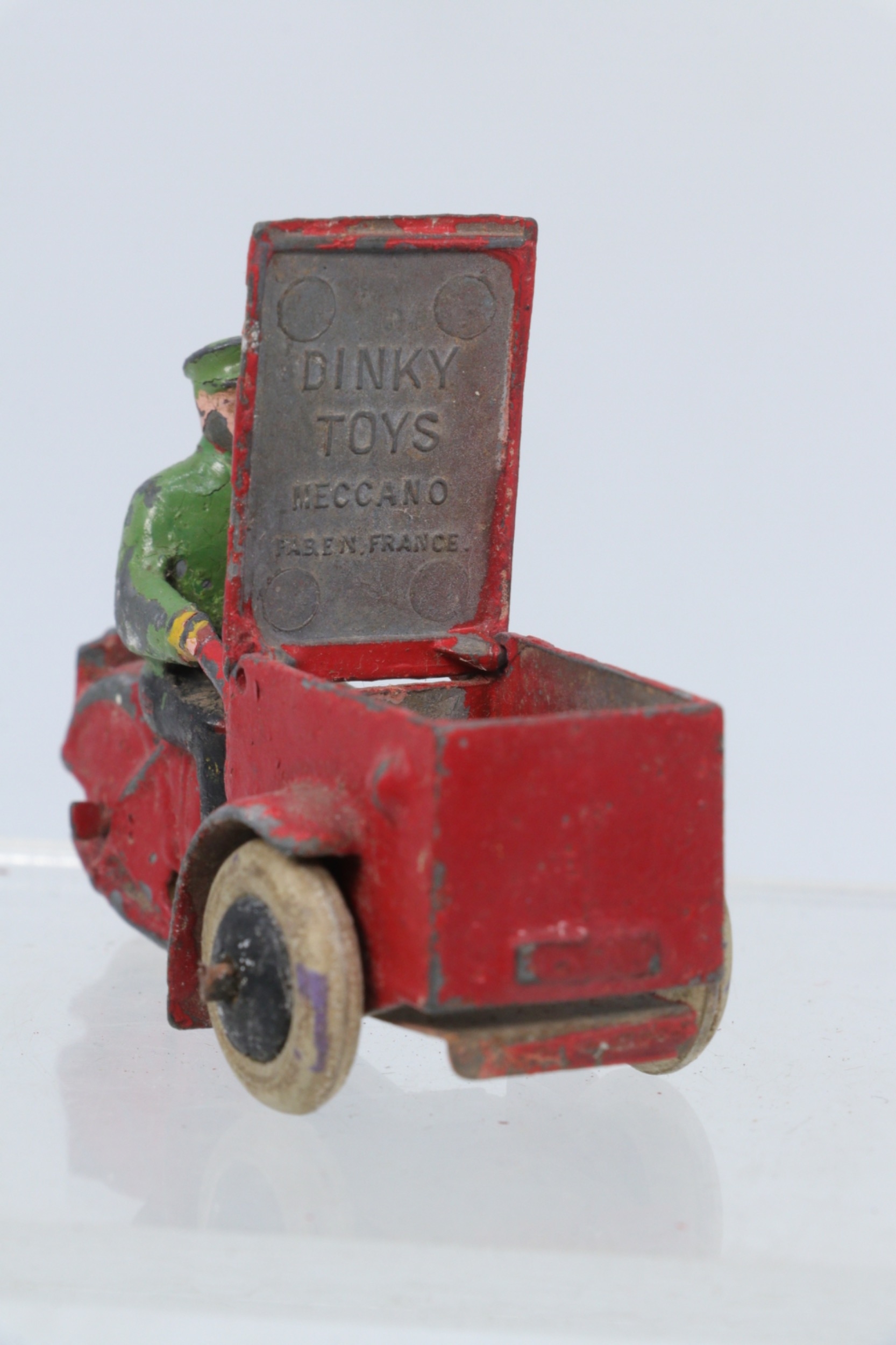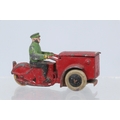A French Dinky Toys 14Z Triporteur comprising red body with black & green driver, with original hinged front box in playworn condition