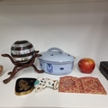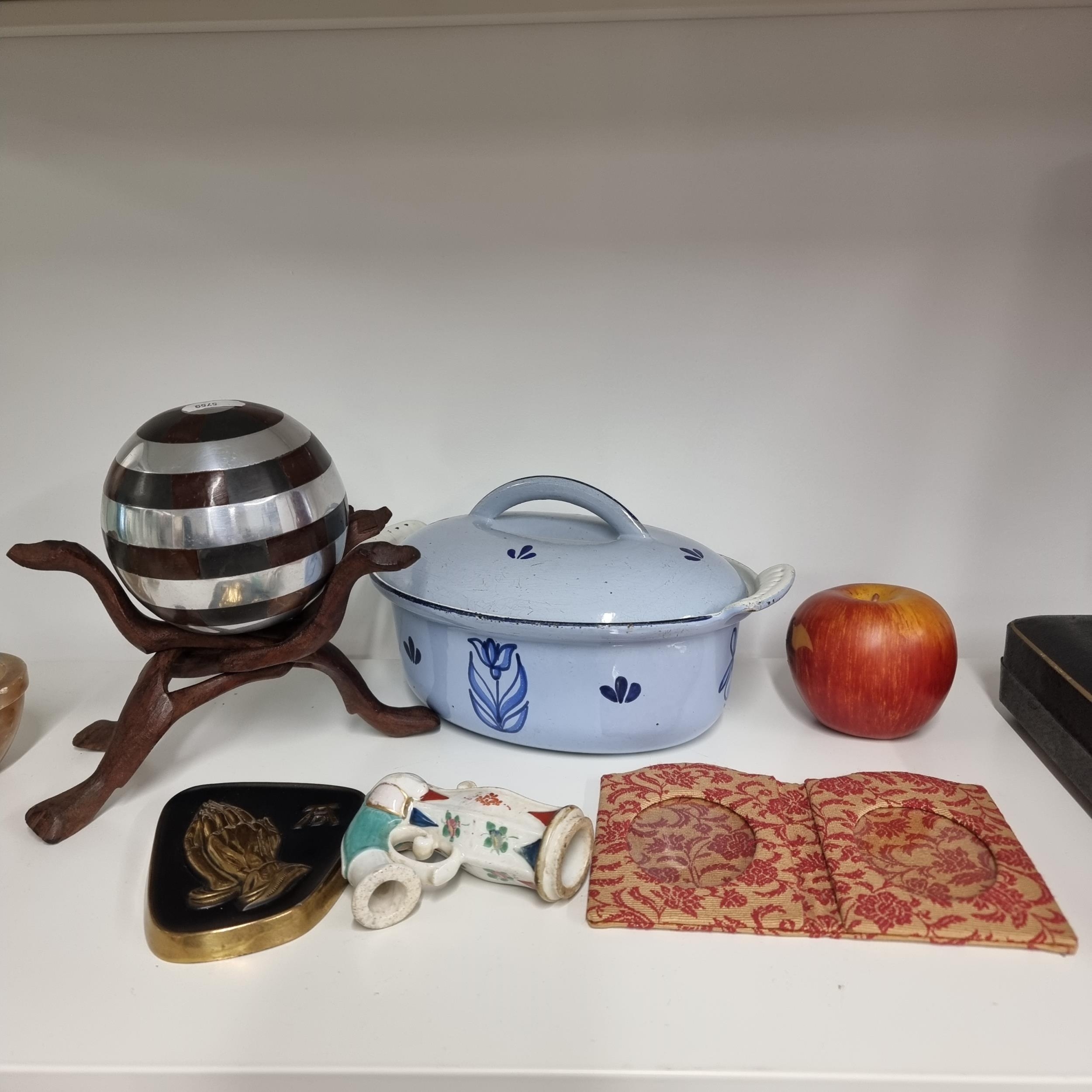A mixed lot of five items, including a lovely vintage Dutch casserole dish with a hand painted floral design, and a unusual carved wood and metal sculpture with ball, vintage photo frame and ceramic antique pipe.
