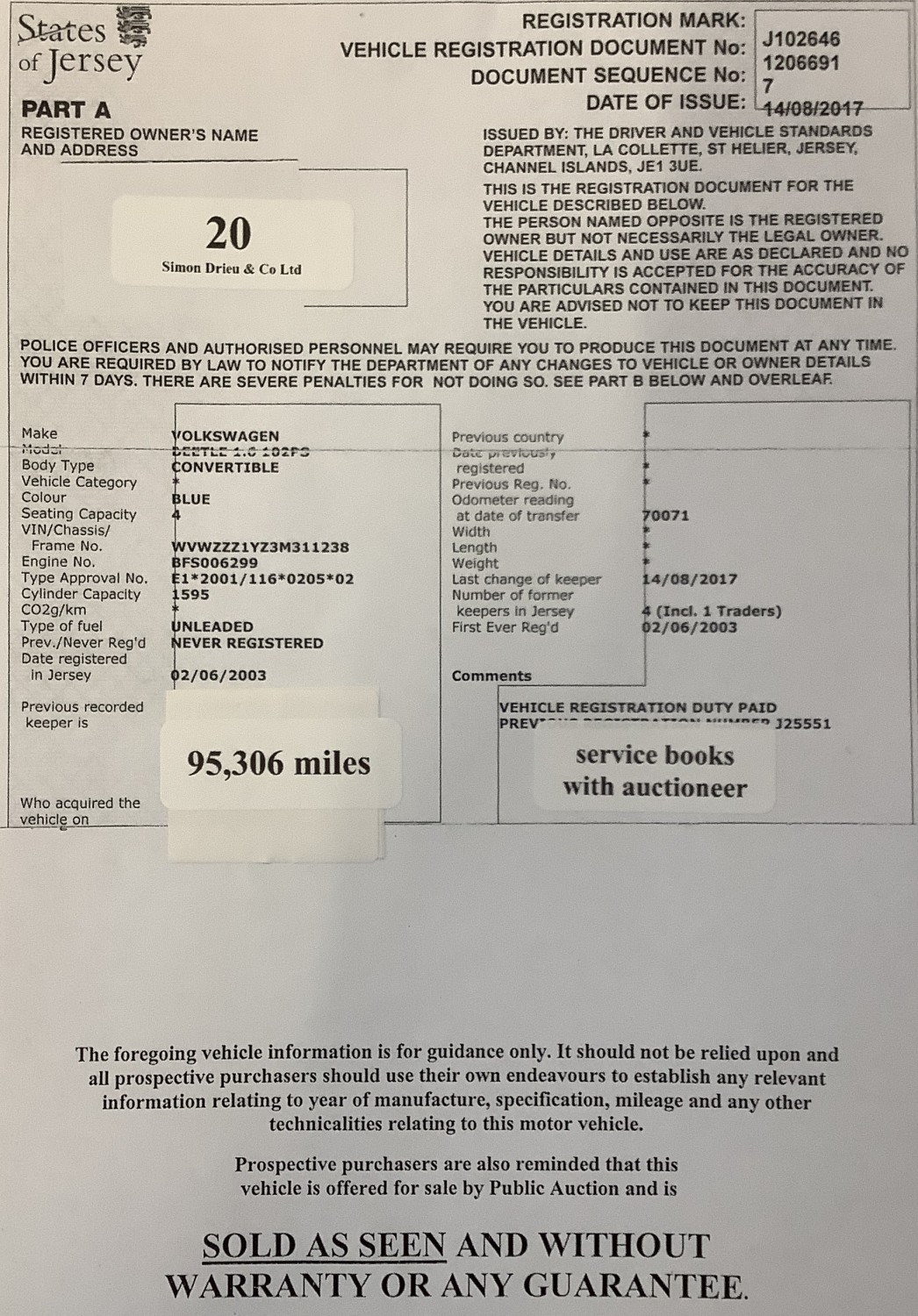A 2003 Volkswagen Beetle 1.6 convertible J102646 (petrol/manual), odometer reading 95,306 miles