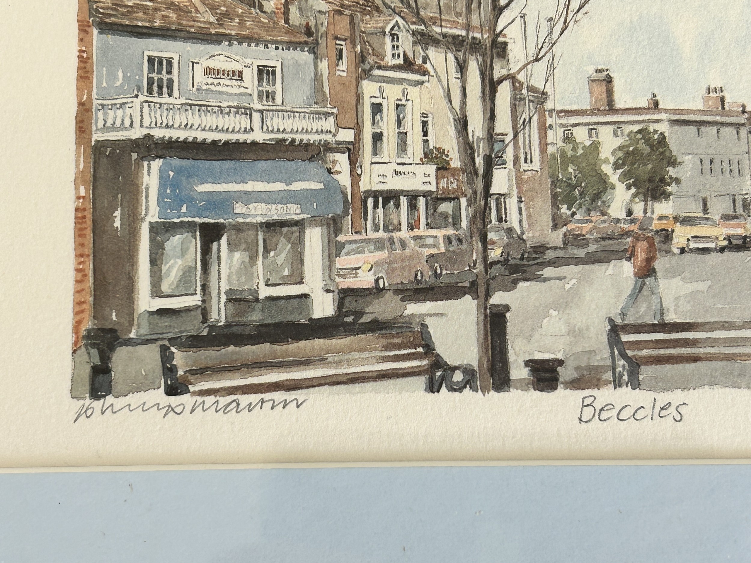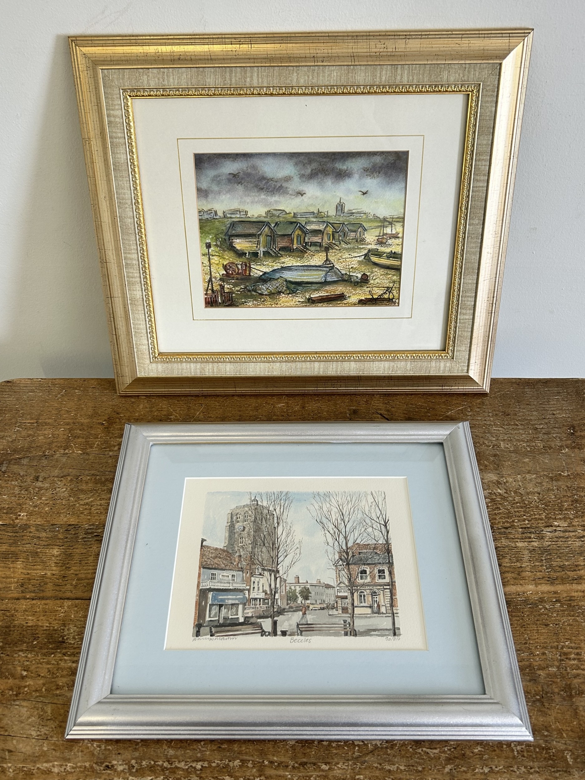 Lorenzo Tony Barrow, framed and glazed watercolour 'Pakefield Beach', 7 1/2" x 5 3/4" plus a framed and glazed artist signed limited edition print of Beccles, numbered 90/810, signed lower left