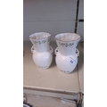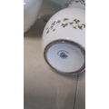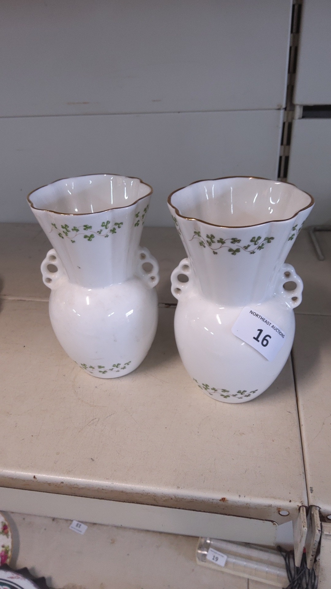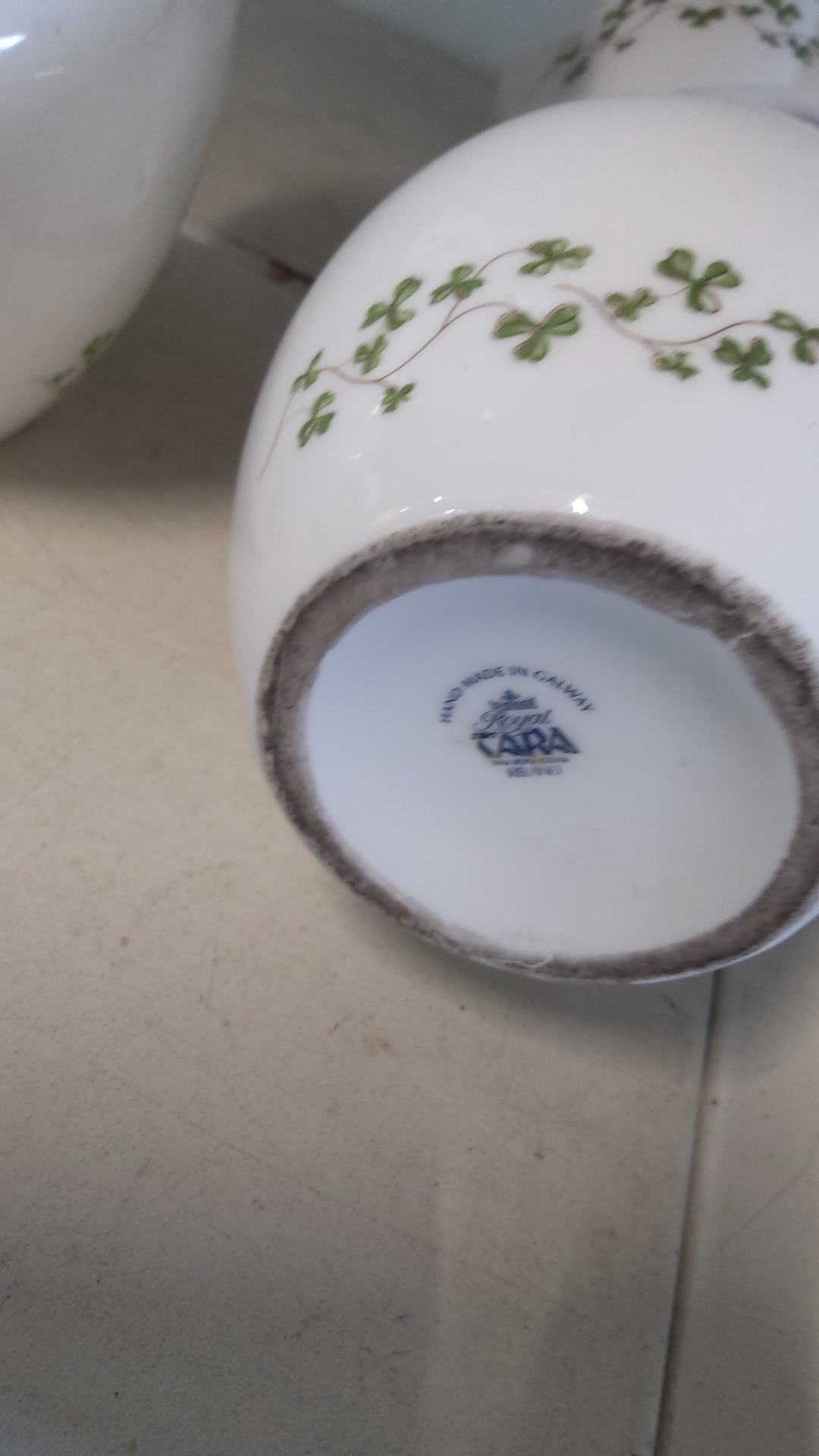 A pair of Royal Tara porcelain vases, of ovoid form with waisted necks and pierced side lugs, gilt-edged scalloped rims, and green shamrock garland decoration.
