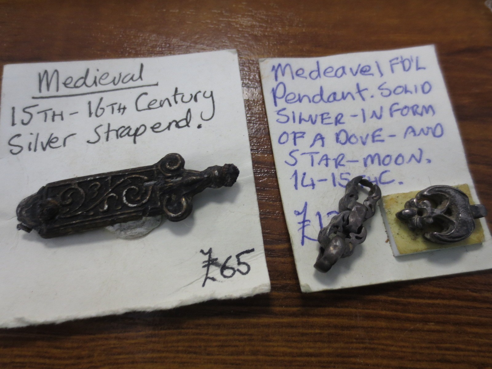 A pair of metal detector finds in decent order comprising an item marked as 'Medieval 15th/16th Century Silver Strap End' and 'Medieval Pendant solid silver in form of a dove and star/moon 14th/15th century', both in quite good condition.