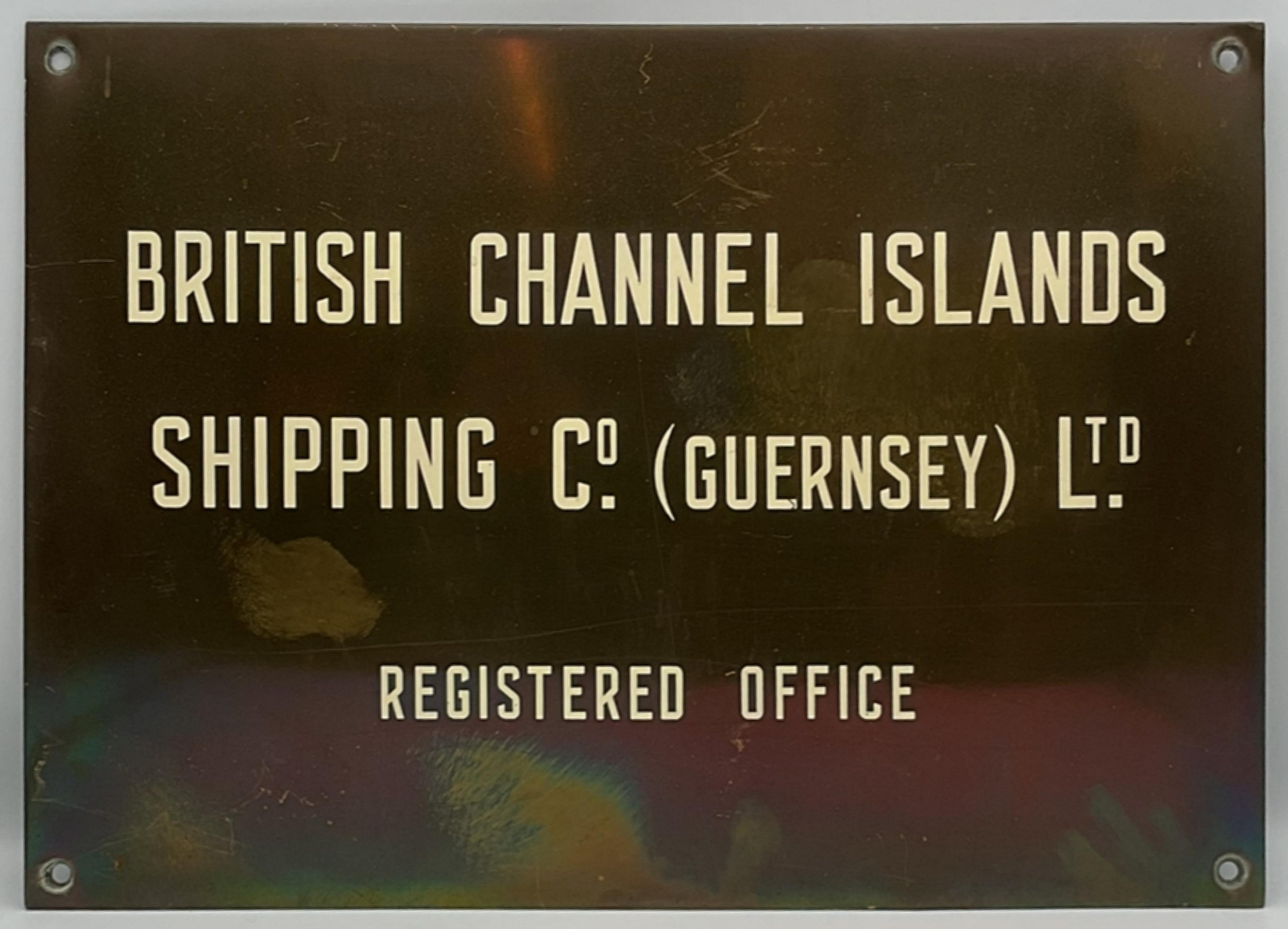 Guernsey Maritime interest - A polished bronze and enamel advertising / Registered Office plaque, BRITISH CHANNEL ISLANDS SHIPPING Co (GUERNSEY) Ltd REGISTERED OFFICE, 30.5 x 45.8cm.