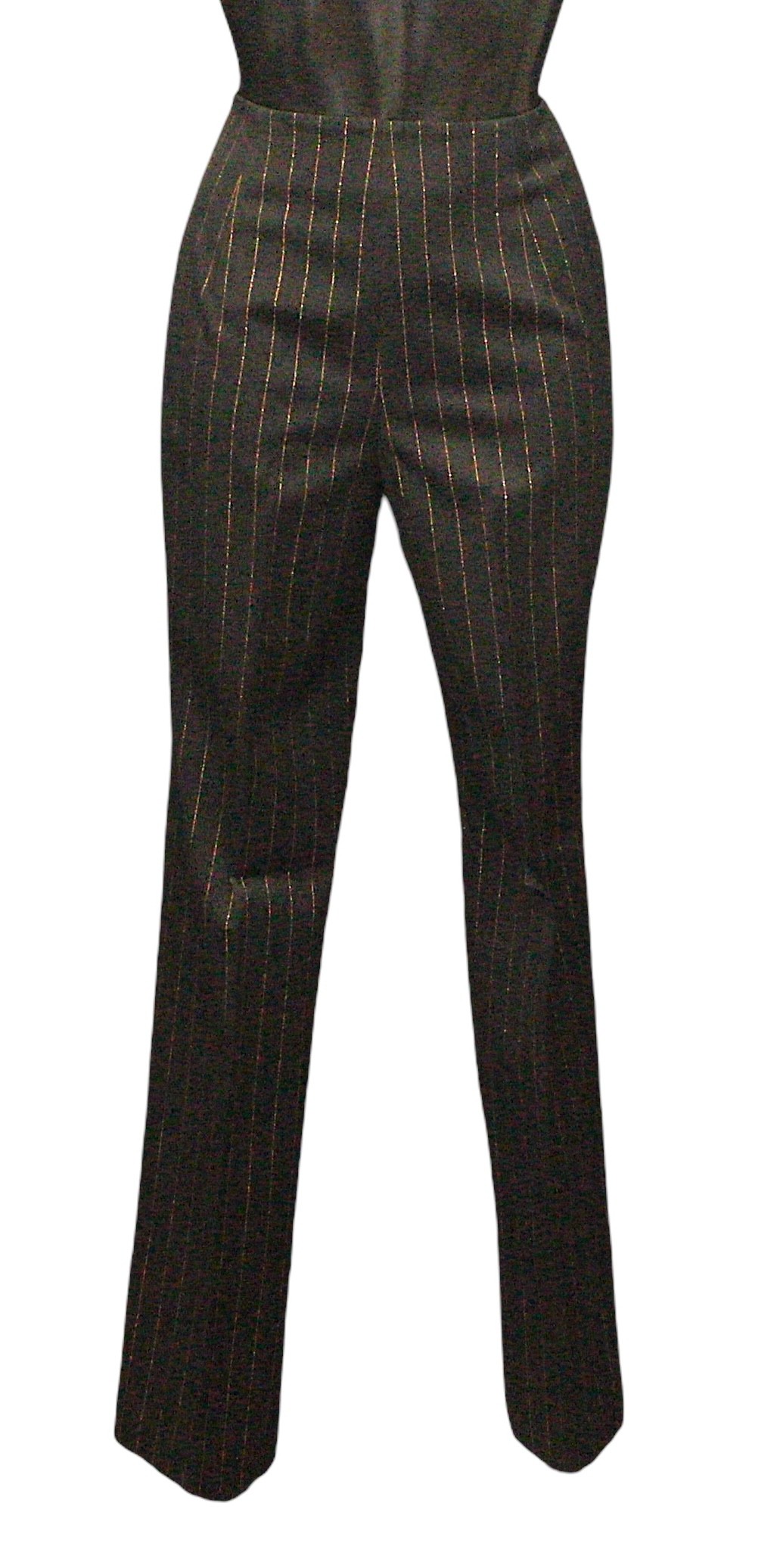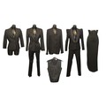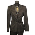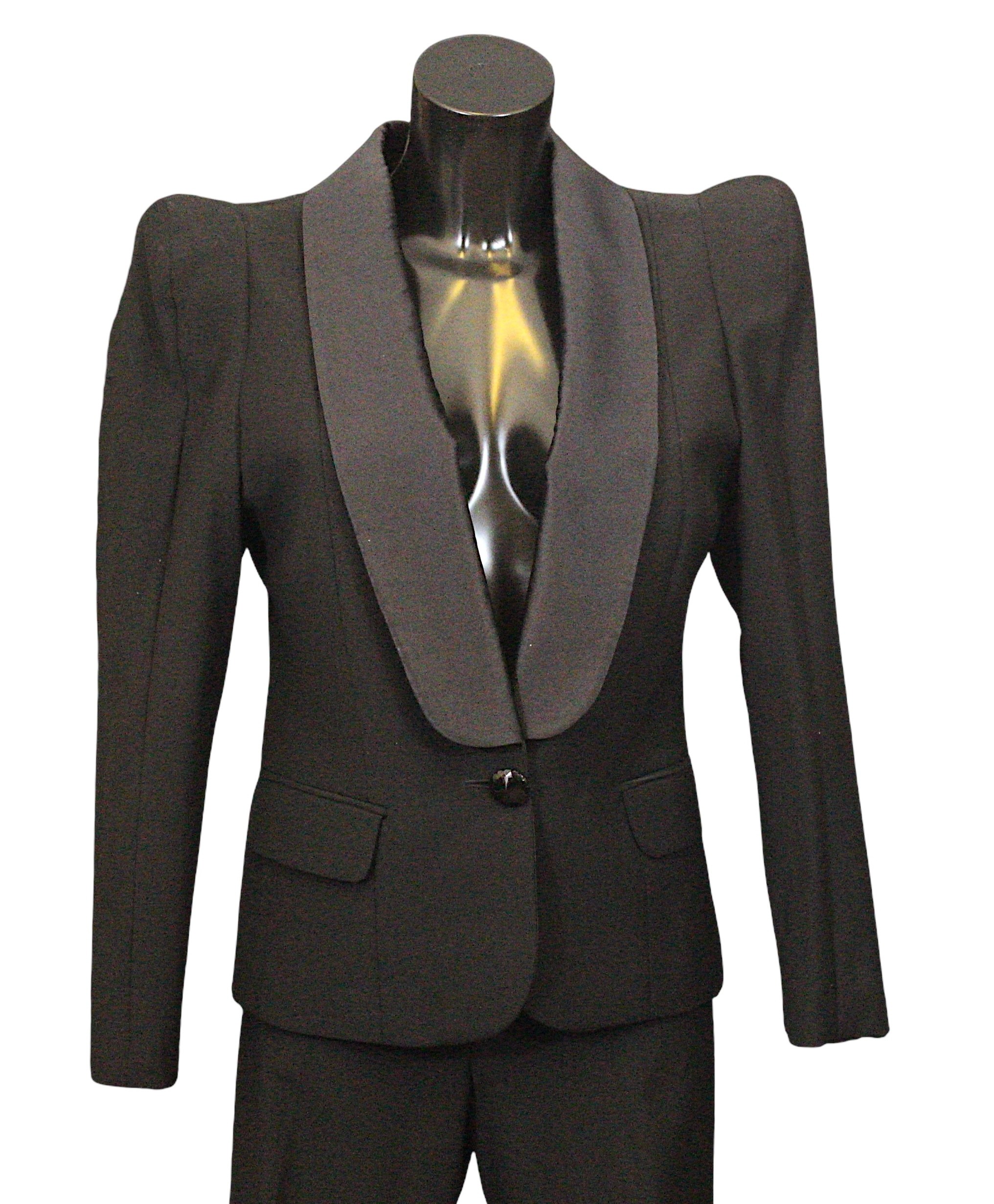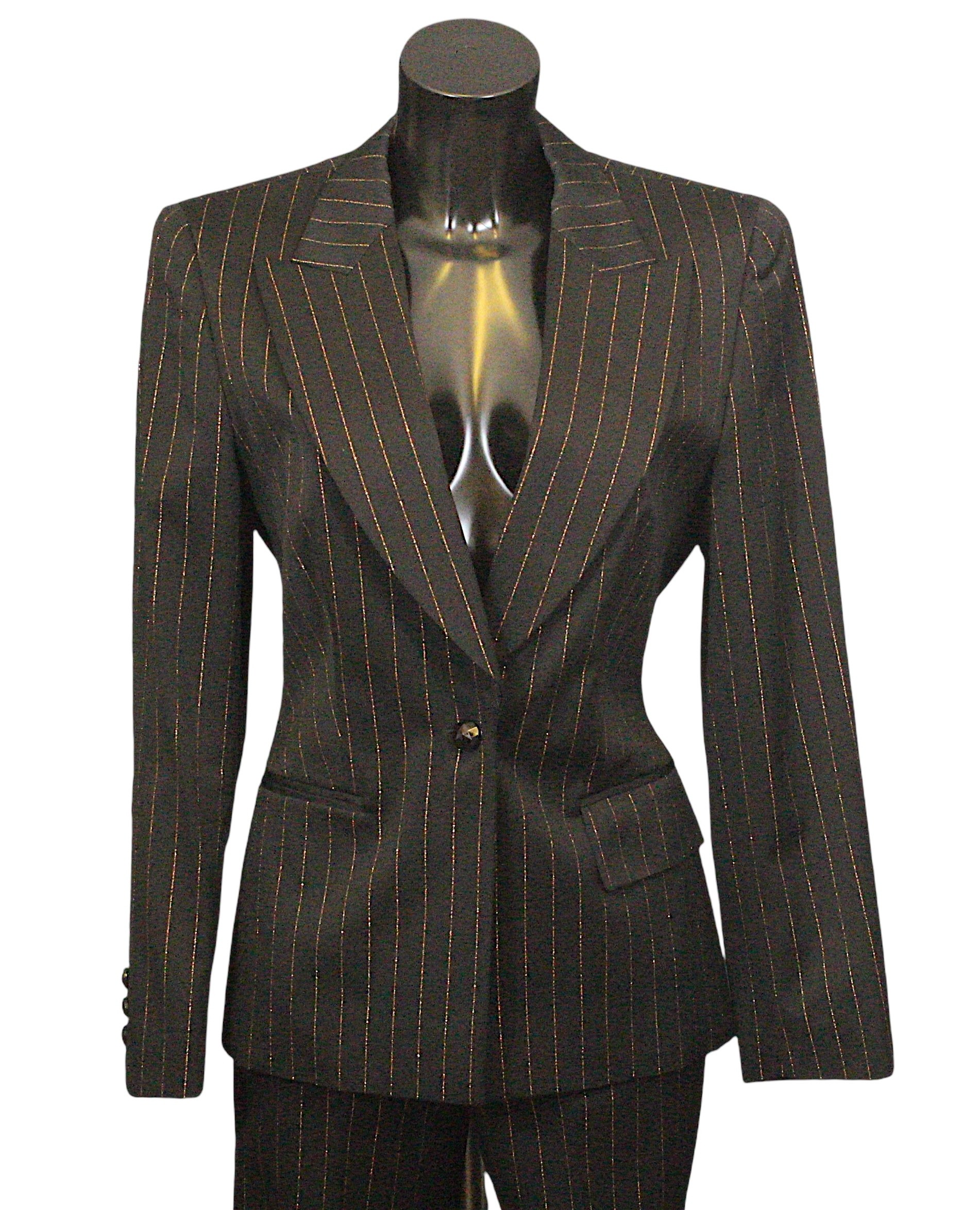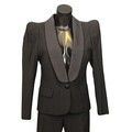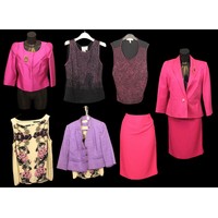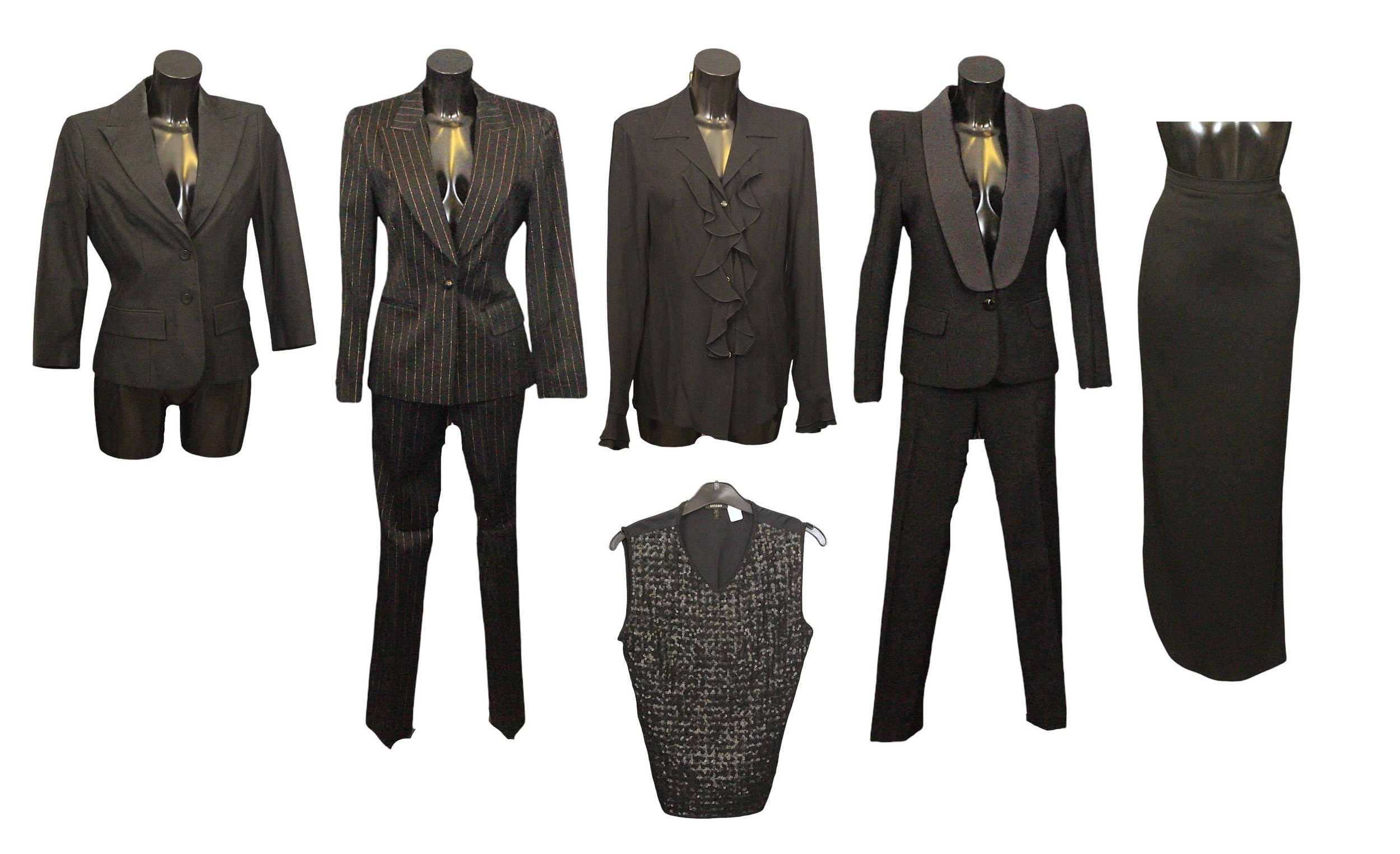 the majority in black colours, including: an Escada two-piece trouser suit, with bronze pinstripe, both size 38; an unlabelled short black jacket, made in Italy; a Jackie Palmer two piece tuxedo style trouser suit, jacket with black satin collar; a Jackie Palmer maxi skirt; an Escada sheer long sleeve blouse, with ruffle collar, size 36; together with an Escada tank top, embellished with black sequins and beads, size M (8)