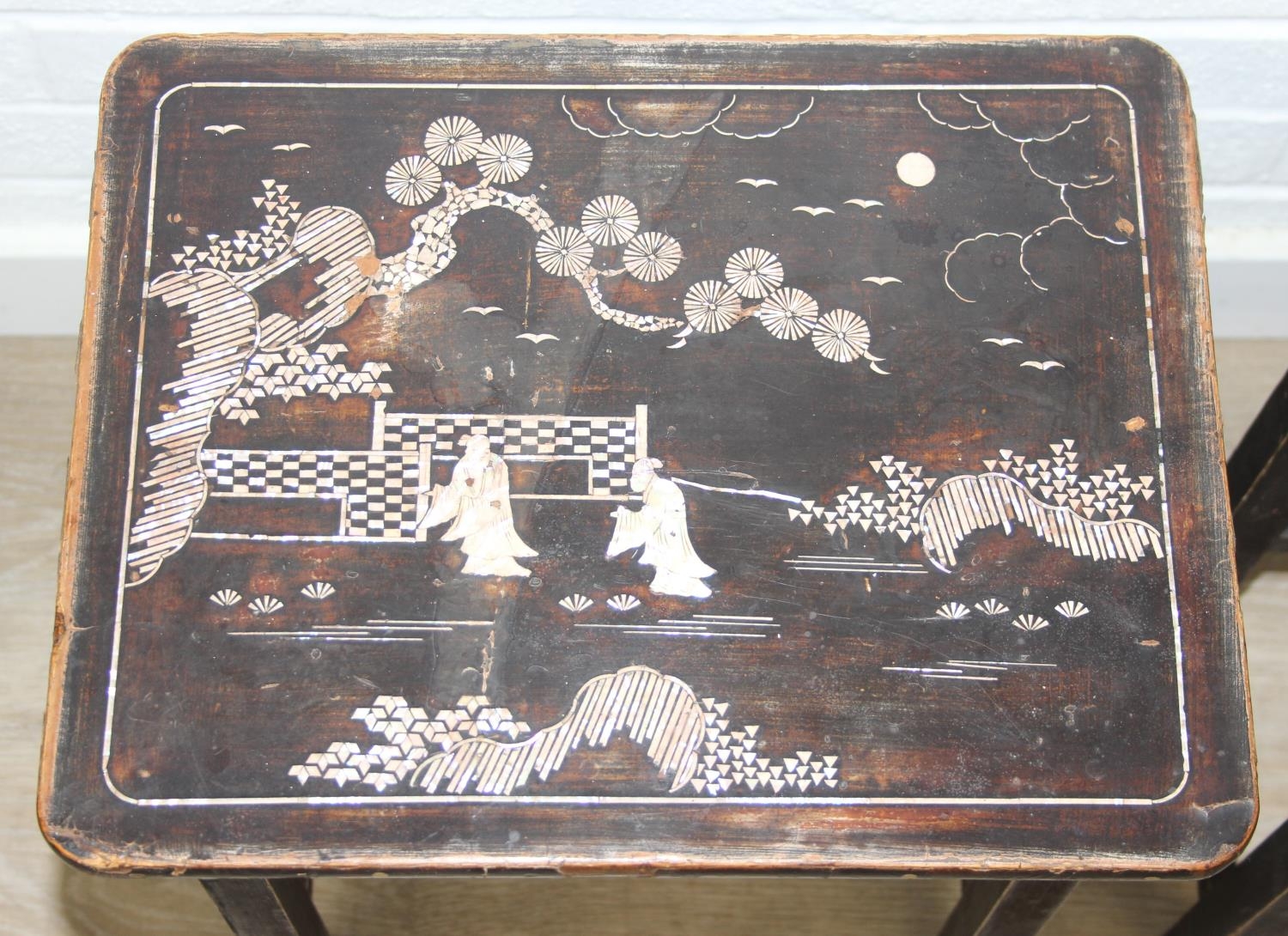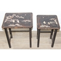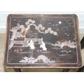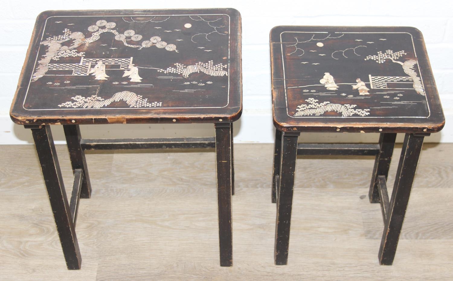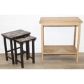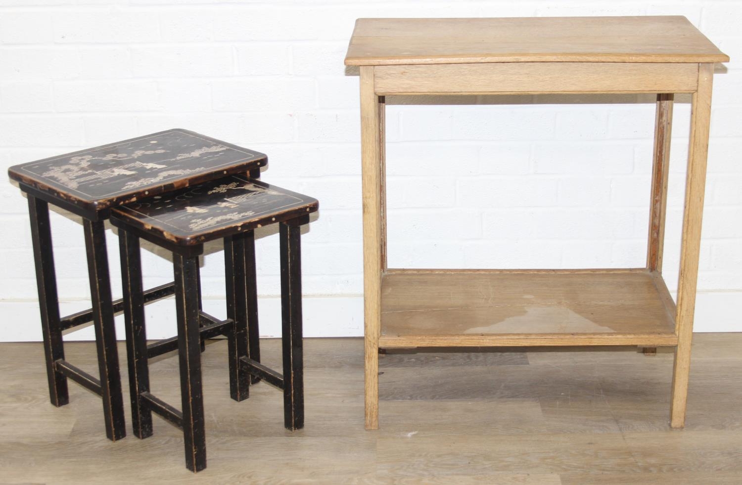 Nest of two oriental style lacquered tables with mother of pearl inlay and a light oak side table with undertier, the oak table 66cm x 40cm x 72cm [2]