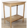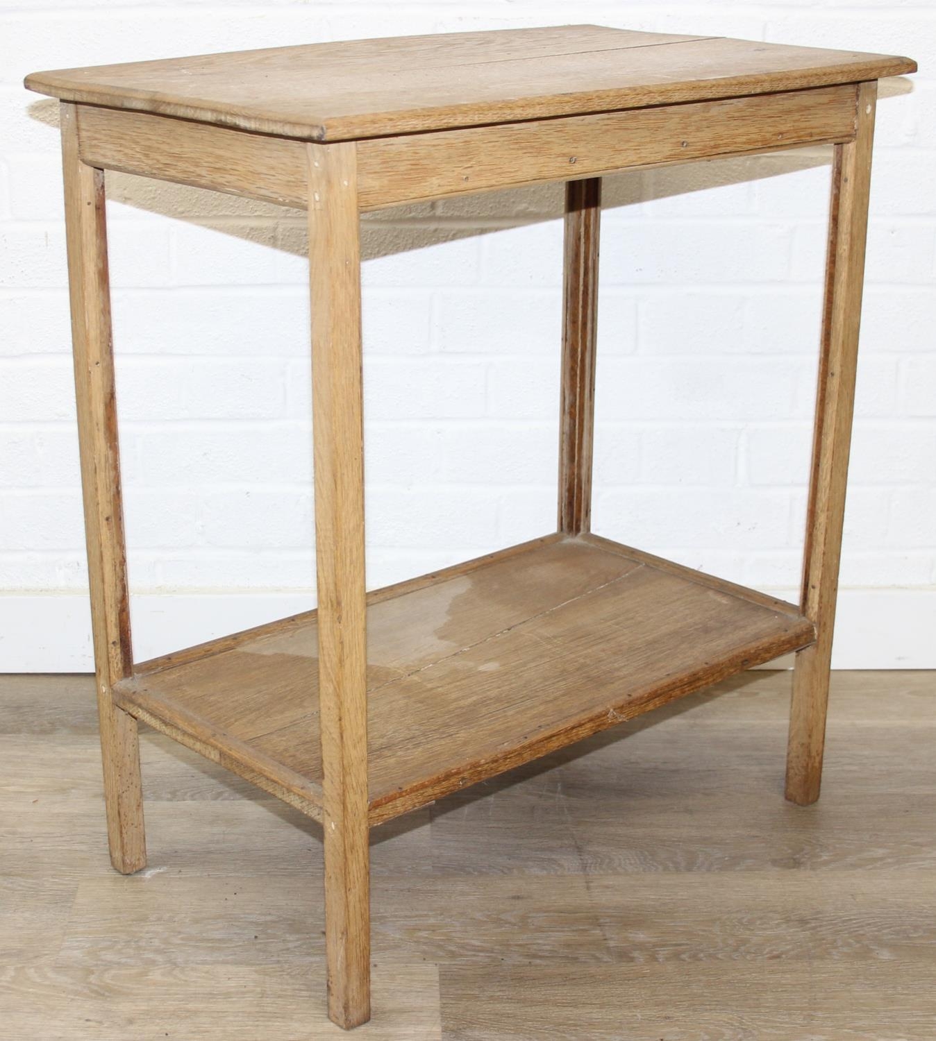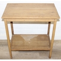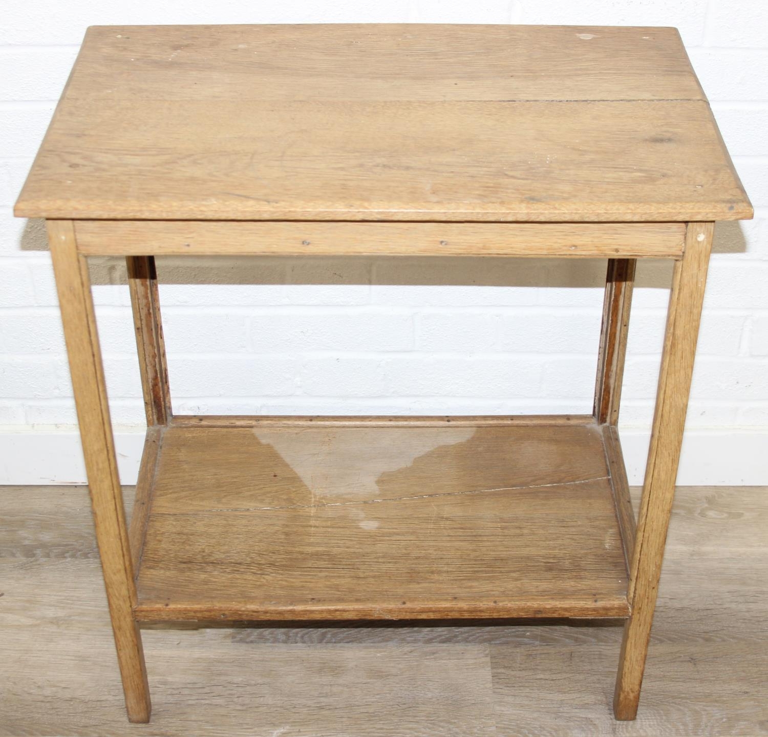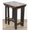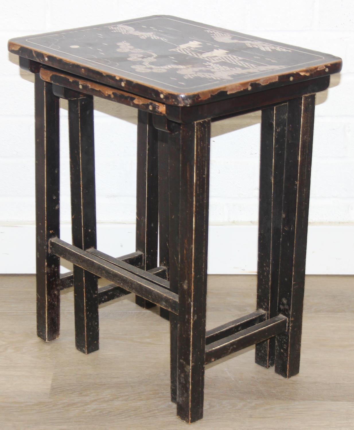 Nest of two oriental style lacquered tables with mother of pearl inlay and a light oak side table with undertier, the oak table 66cm x 40cm x 72cm [2]