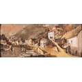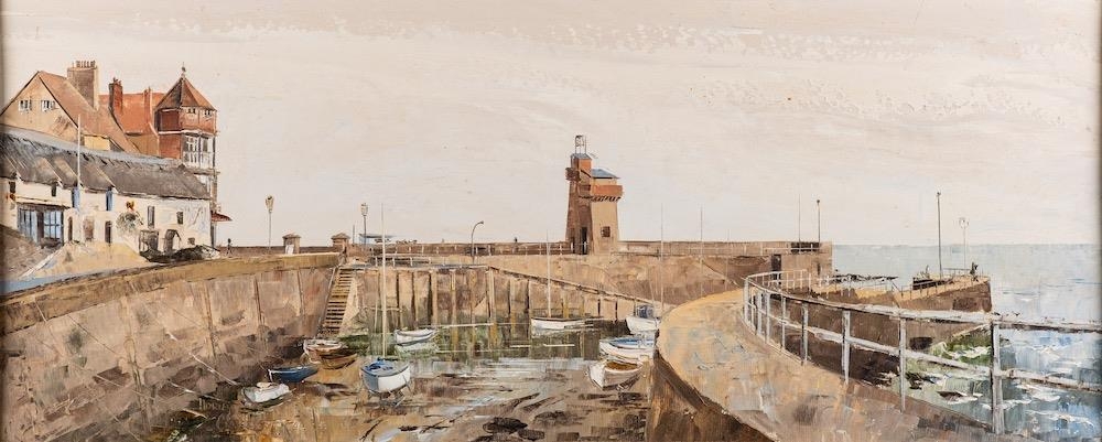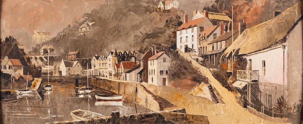 Harley Crossley (1936-2013) Lynmouth Harbour, and another harbour scene; a near pair each signed and with artist's label to the reverse oil on board 28.5 x 69 and 29.5 x 74cm respectively