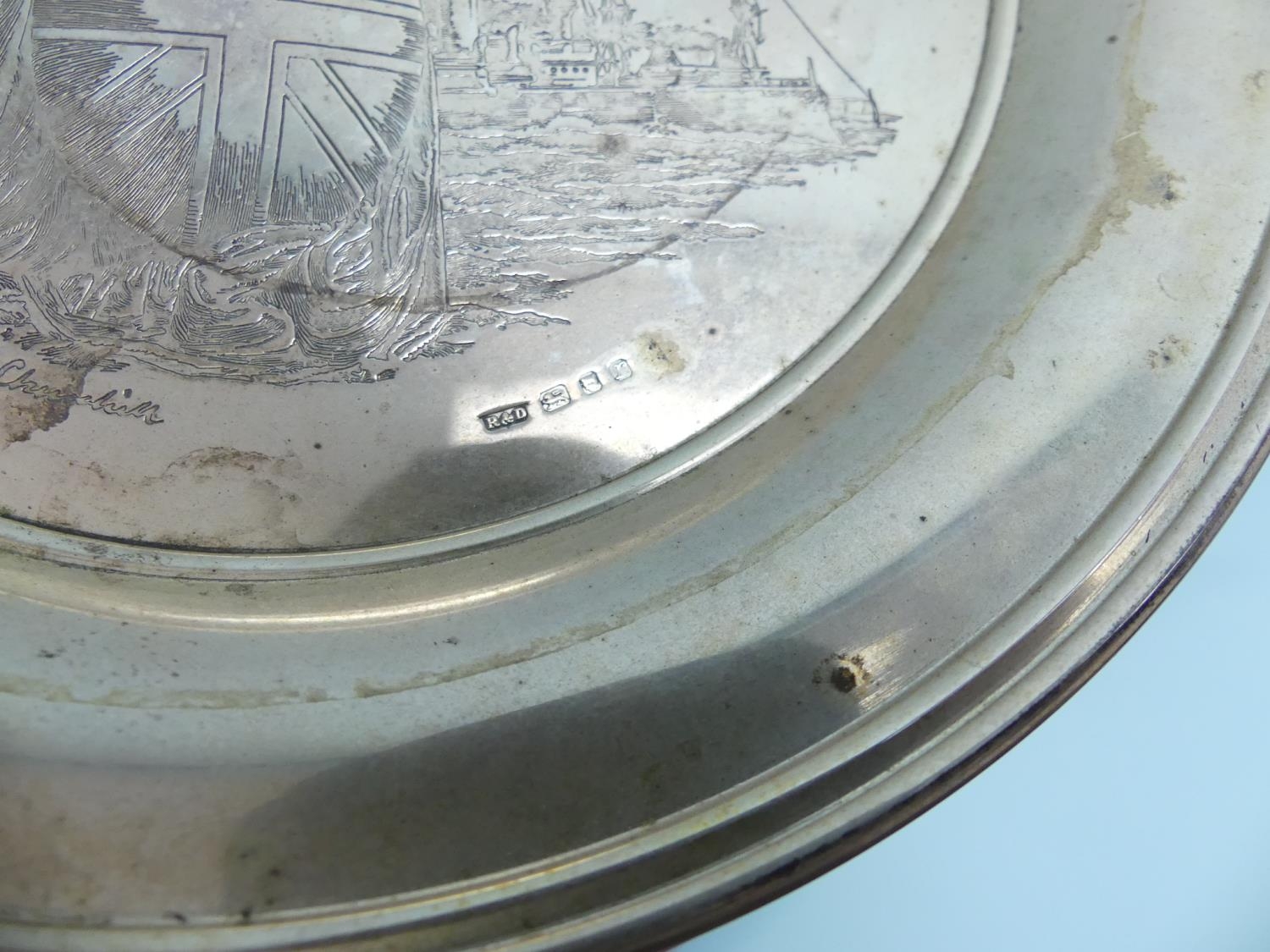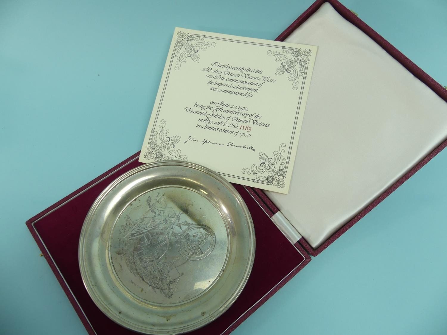 An Elizabeth II silver limited edition Commemorative Plate, by Roberts & Dore Ltd., hallmarked London, 1972, designed by John Spencer Churchill to celebrate the 75th Anniversary of Queen Victoria's diamond jubilee with engraving of Britannia and Victoria, no. 1163/1700, 7½in (19cm) diameter, with presentation box and certificate.