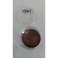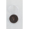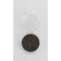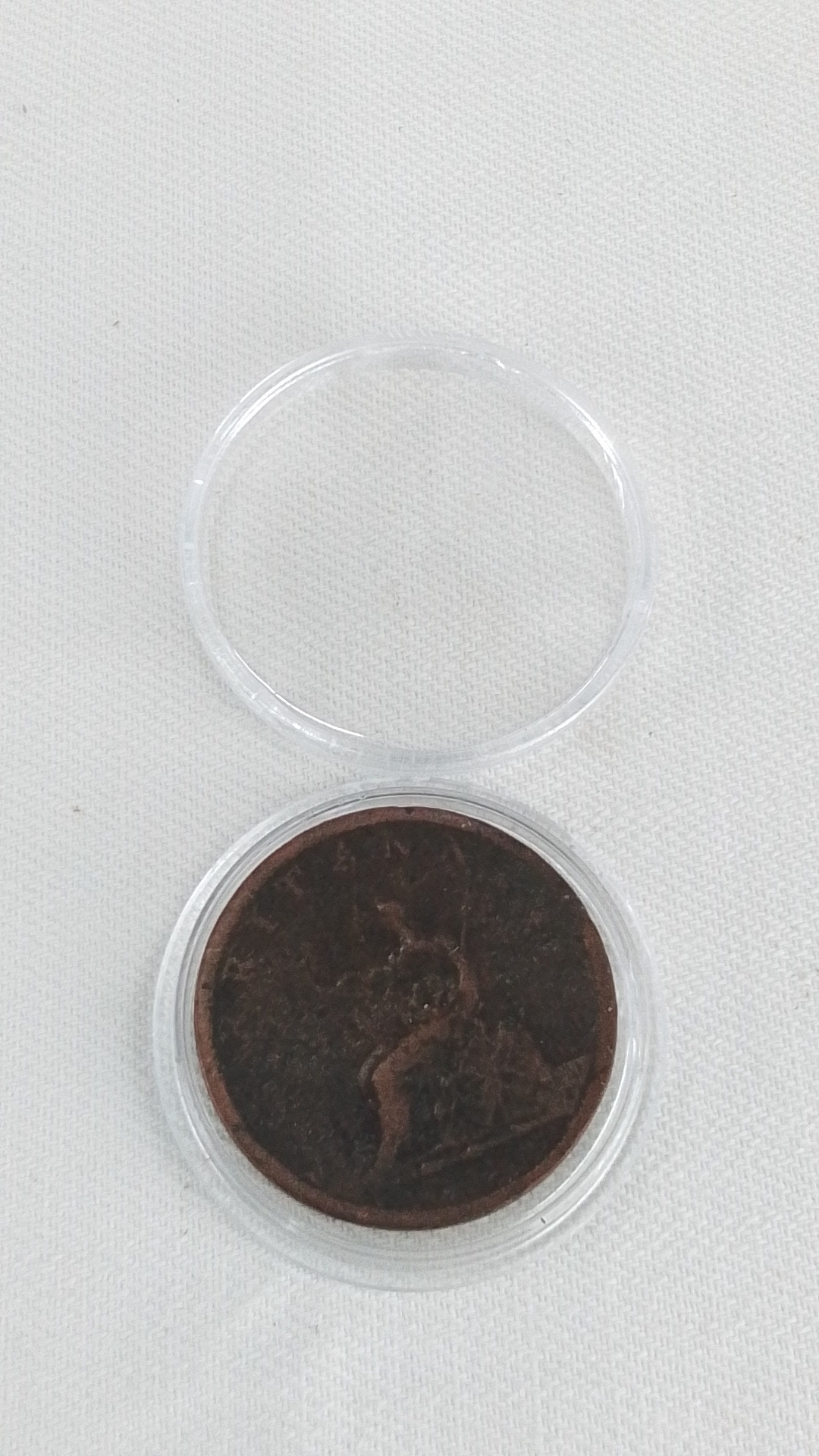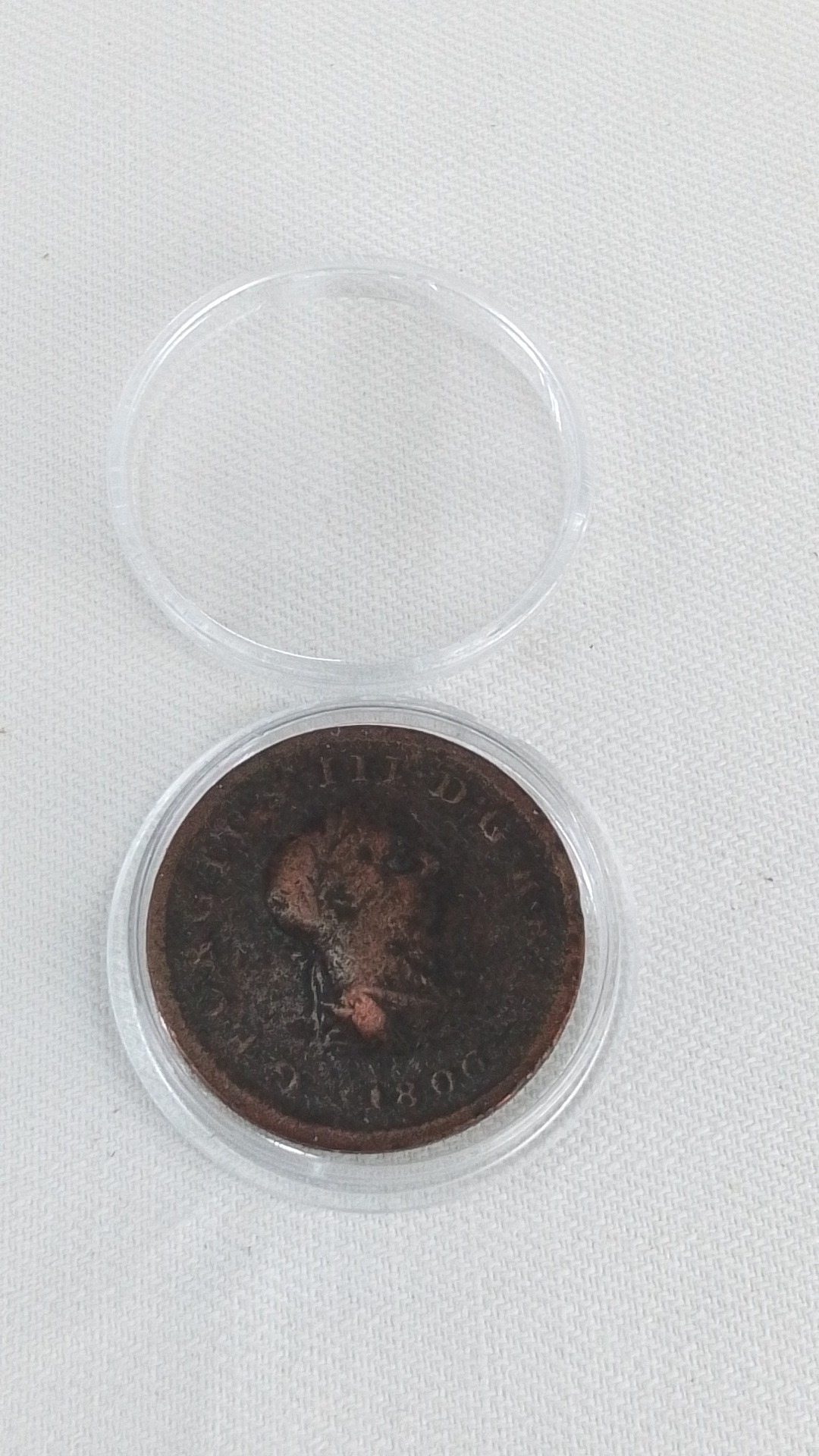 An early George III copper penny coin, dated 1806, in a clear protective capsule; obverse with laureate portrait and legend, reverse with Britannia seated and surrounding inscription.