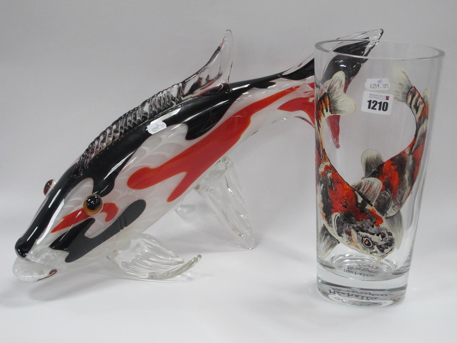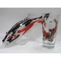 Kare Design Heavy Glass Coloured Fish, 29cm high, Michelle Brunyee 2003 signed glass vase, featuring fish. (2).