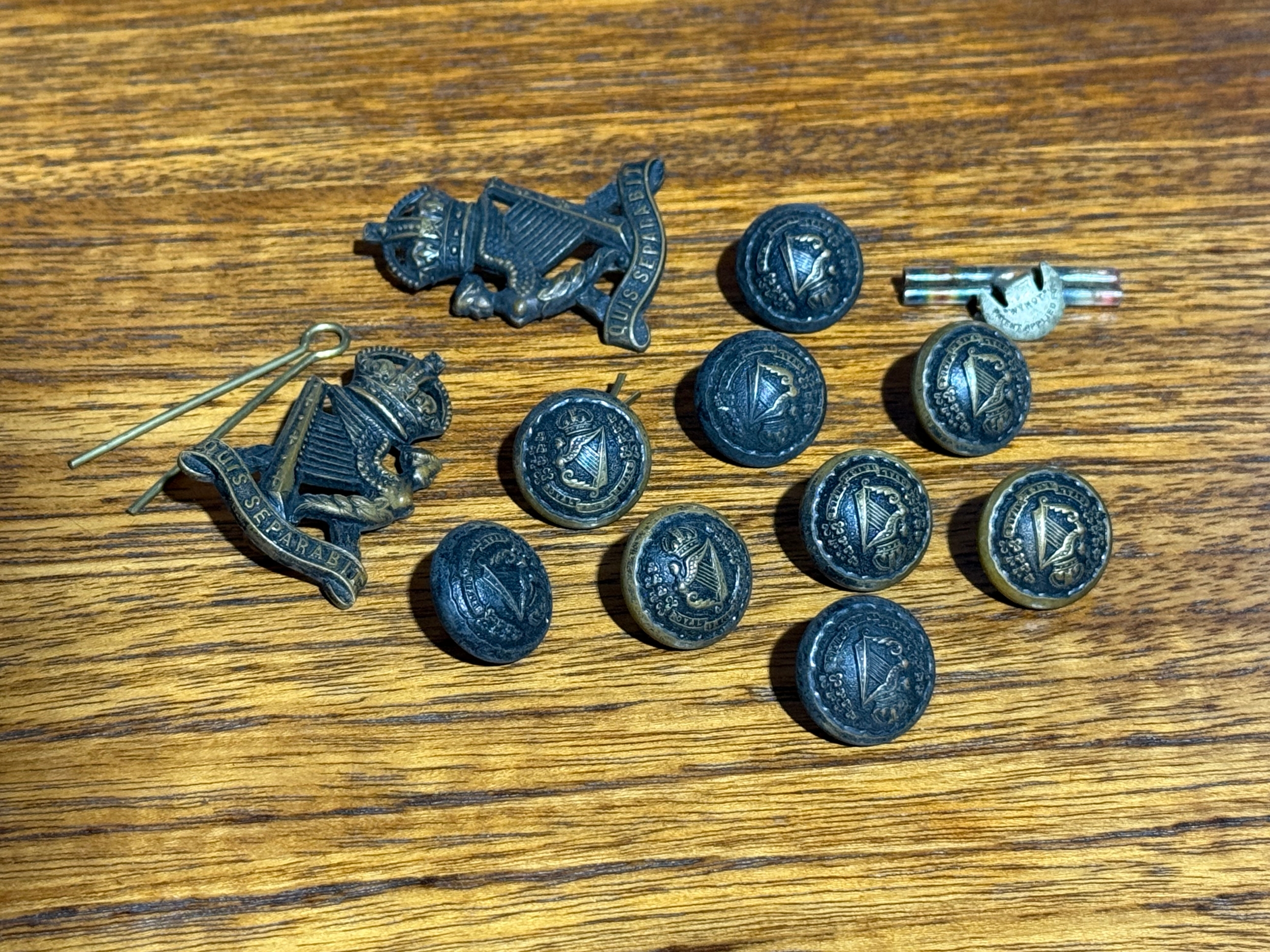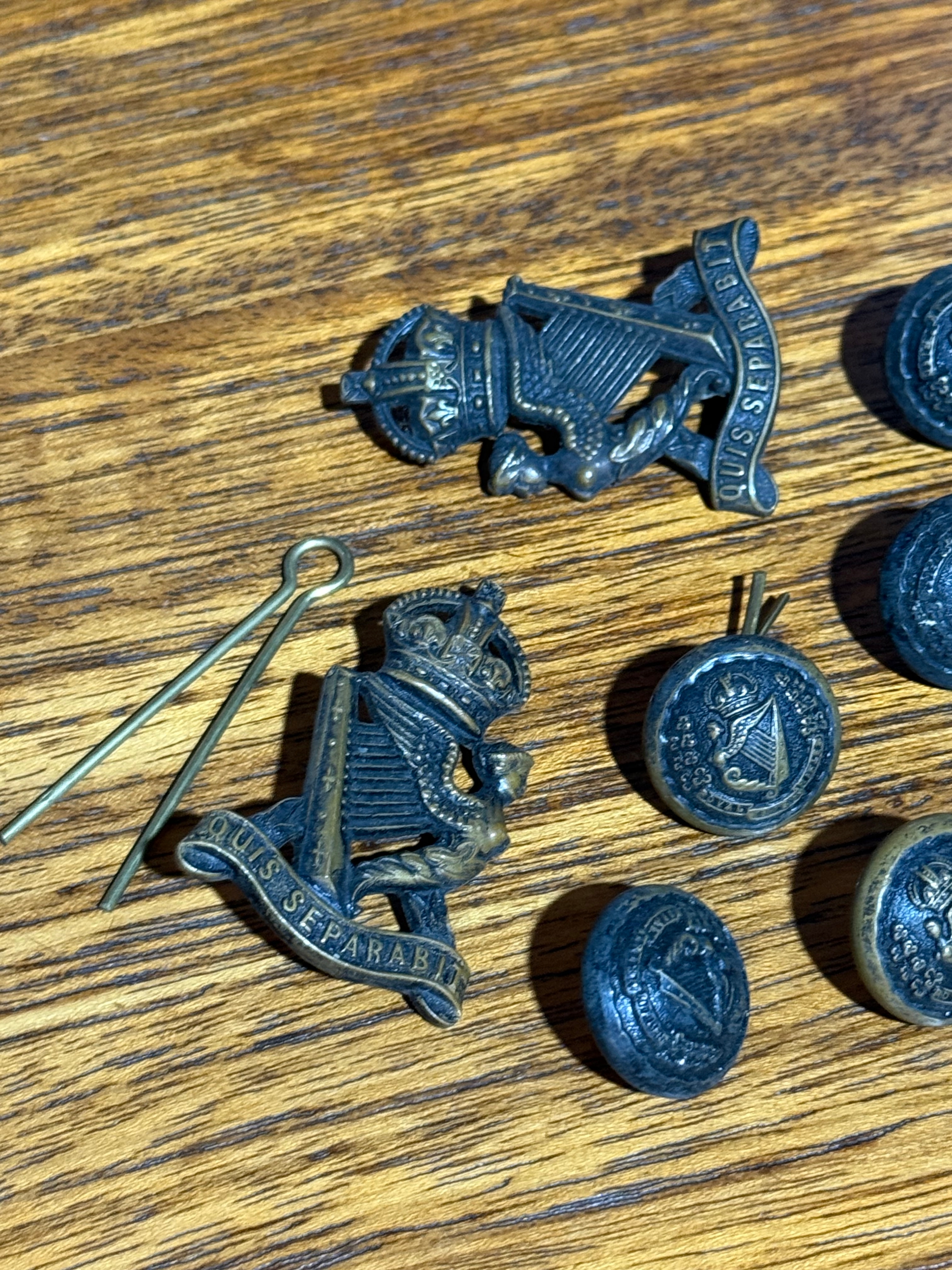 Victorian Royal Irish Rifles tunic buttons and two Royal Irish Rifles cap badges (1903-1912)