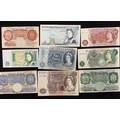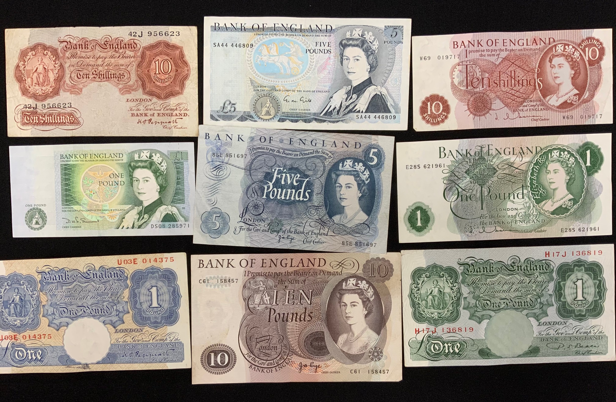Banknotes - Bank of England Jo Page (1970-1980) £10.00 , serial number C61 158457, red brown, £5.00 Jo Page, serial no 85E 851 697 , G M. Gill, serial no SA44 446809; £1.00 notes K O Peppiatt, serial no U03E 014375, P S Beale, H17J 136819; Jasper Hollom , E28S 621961; David Somerset, DS08 285971, Ten Shillings, K O Peppiatt, 42J 956623, J Hollom, W69 019717, all in good circulated condition, (9)