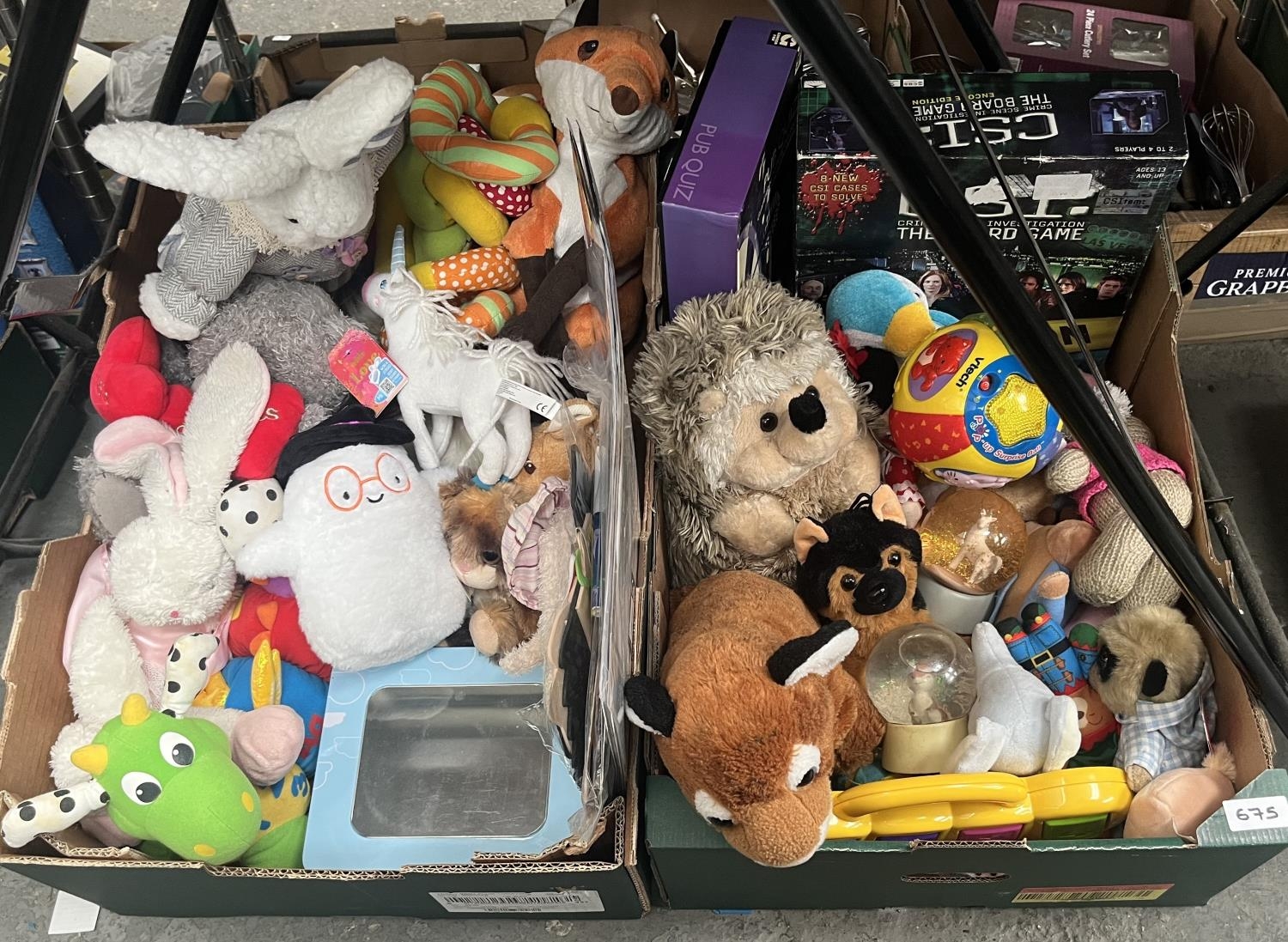 2 Boxes containing a quantity of soft toys and games including Vtech