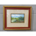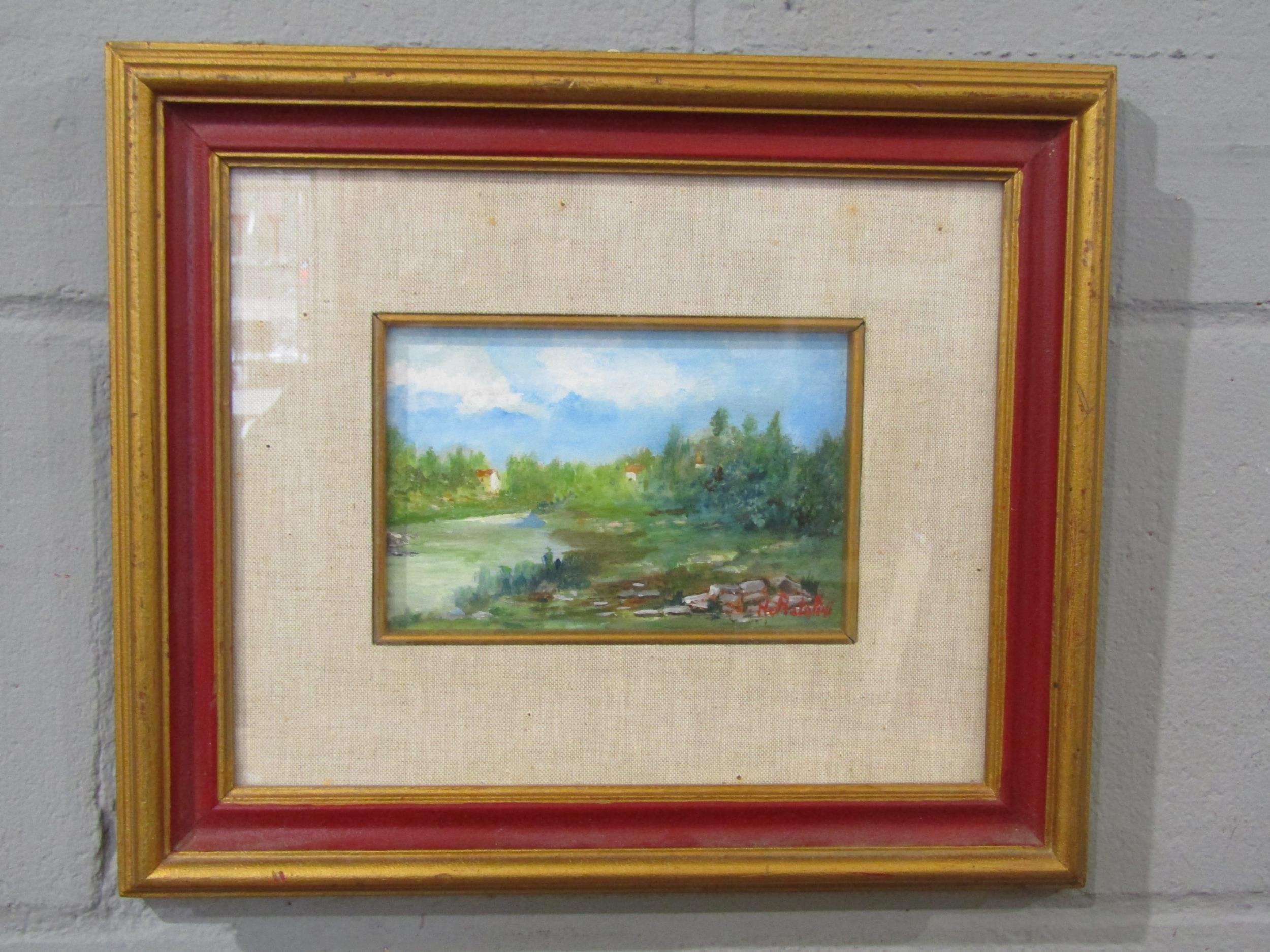A 20th Century oil on board of rural landscape, houses by lake, Italian artist, signed lower right and verso, framed and glazed, 11.5cm x 17cm image size