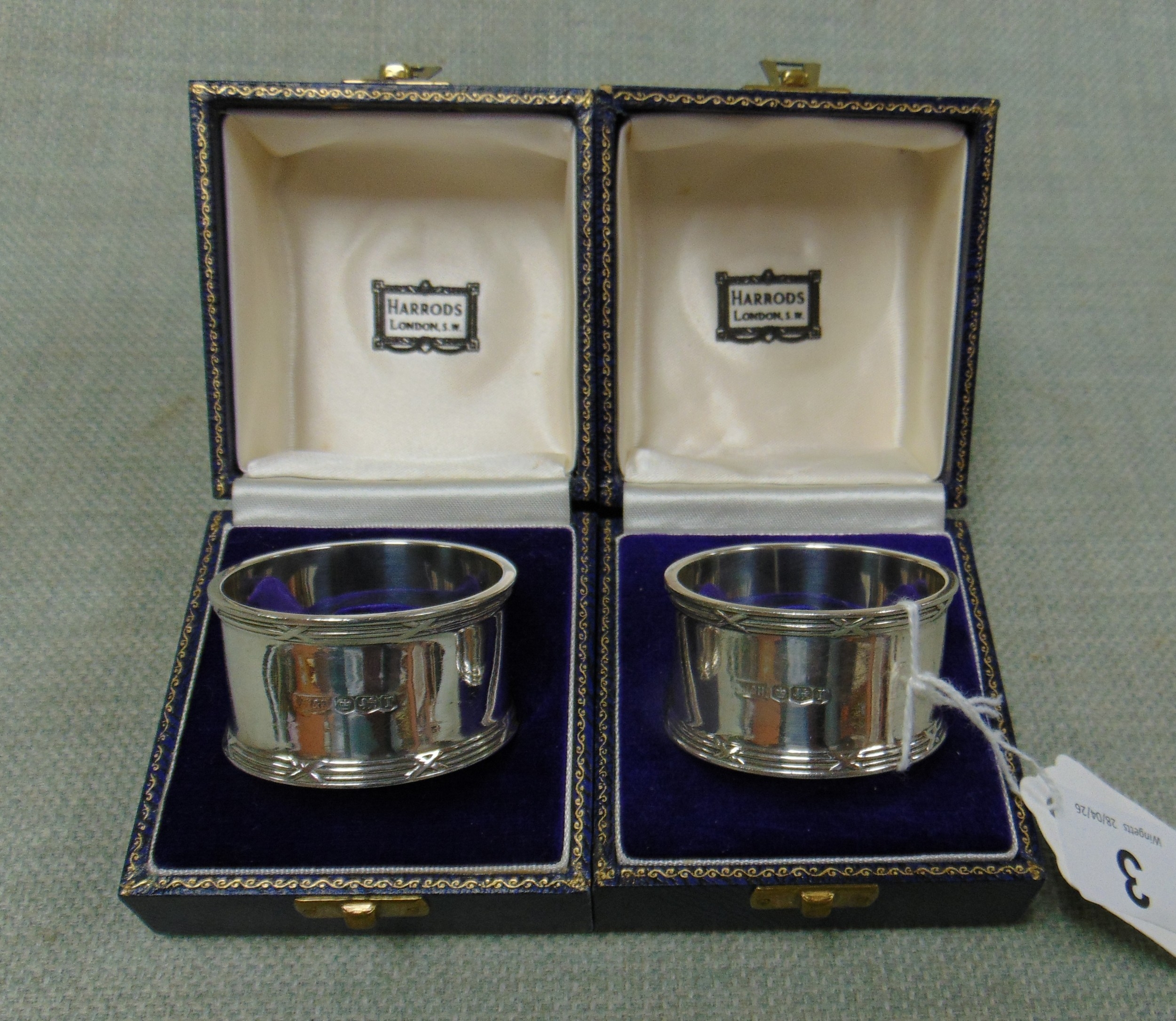 Pair of cased silver napkin holders, maker Walker and Hall, Sheffield 1934, retailed by Harrods, 2.7 ozt.