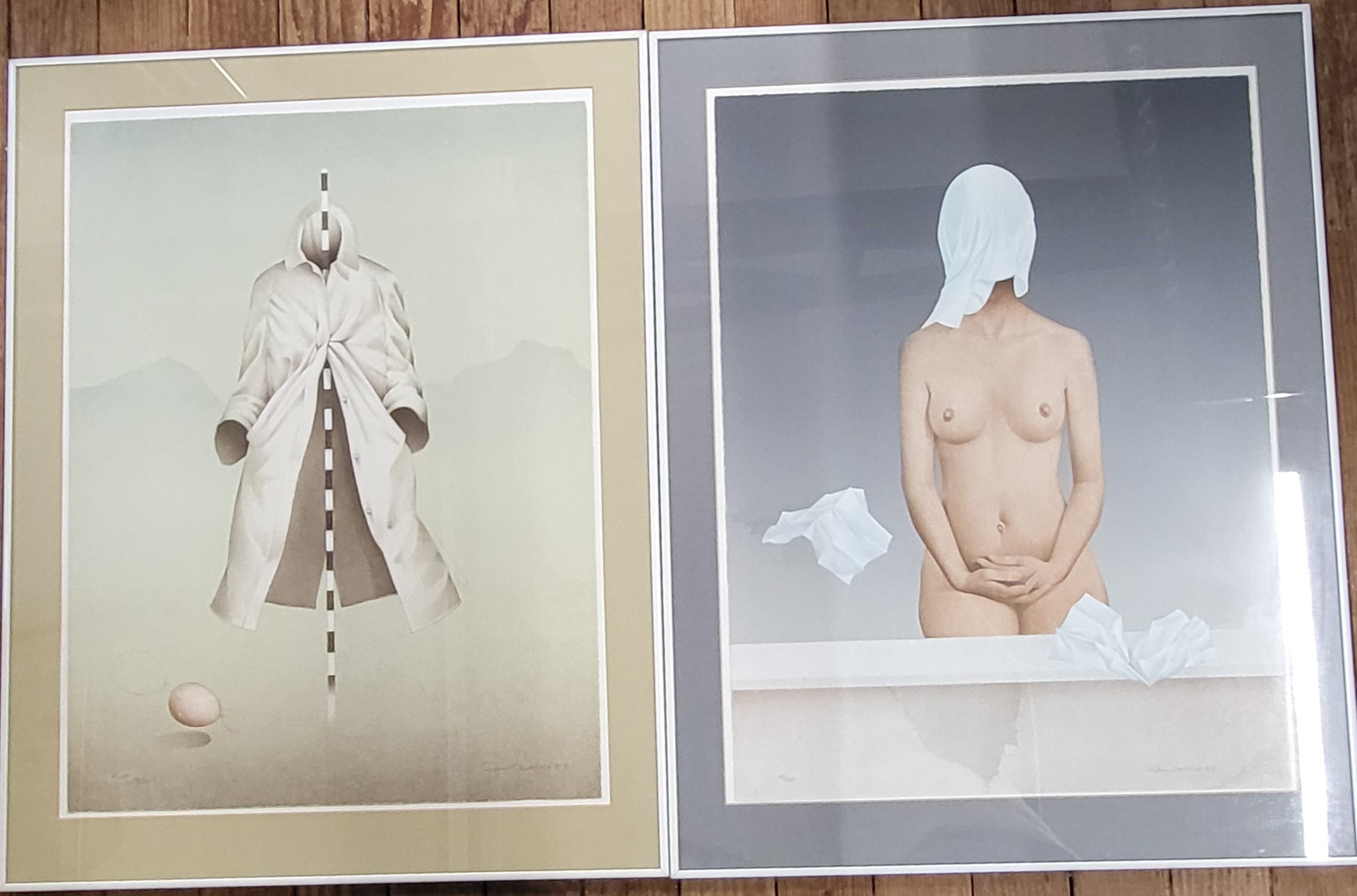 A Don Clarke limited edition 10/10 lithograph of a raincoat and a balloon, and a Don Clarke limited edition 56/150 lithograph of a nude with head covered 78 x 62cm. Both signed. (2)