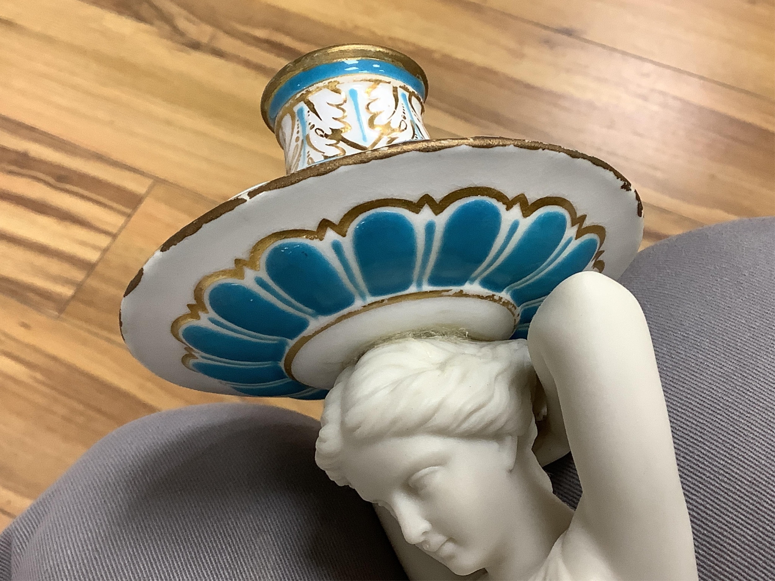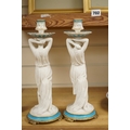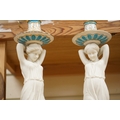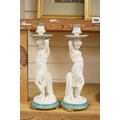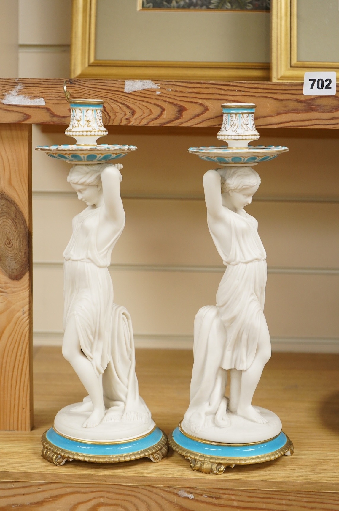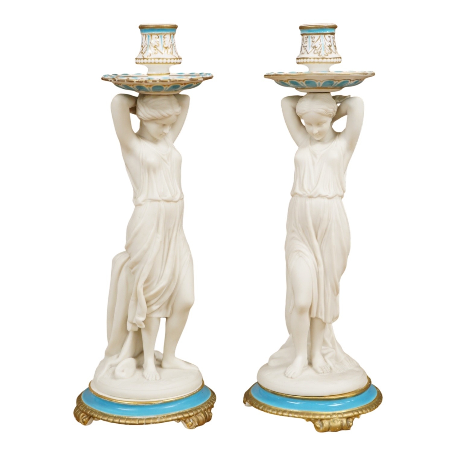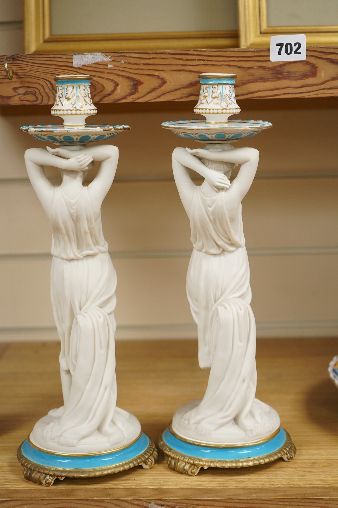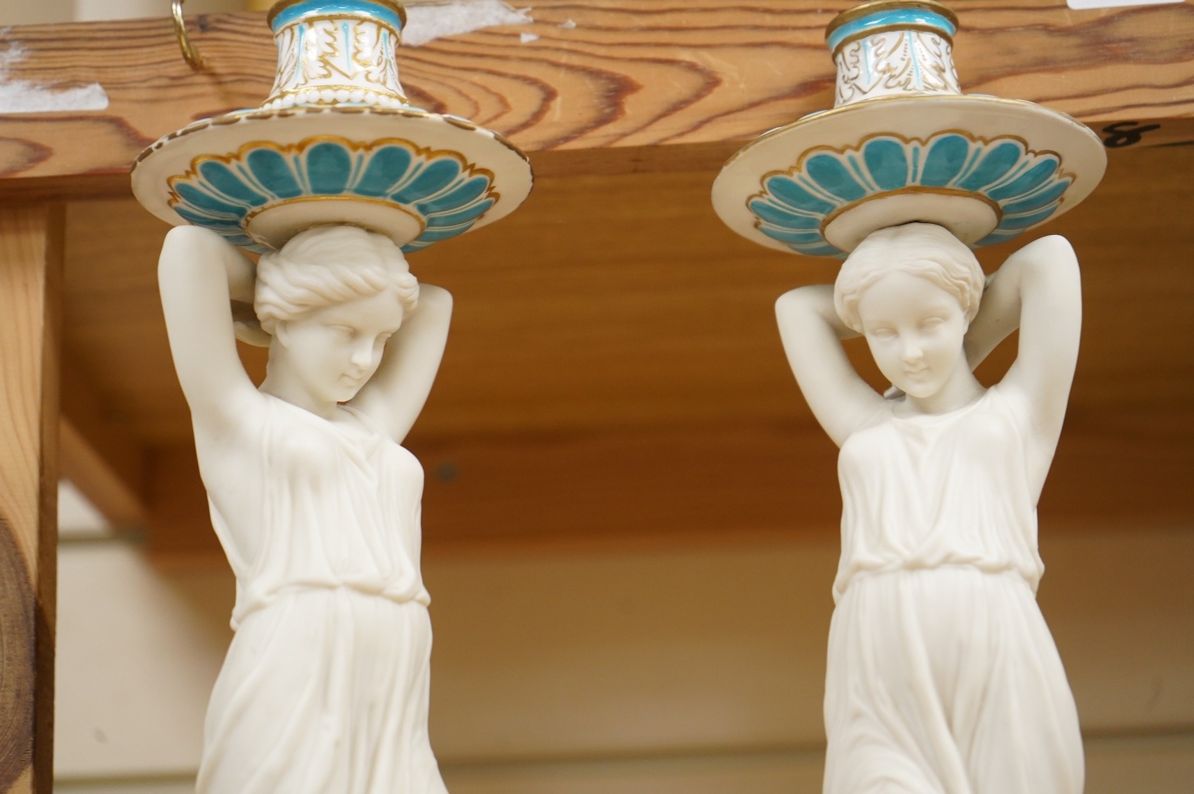 A pair of Victorian glazed and bisque porcelain figural candlesticks, 34cm high