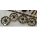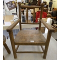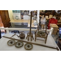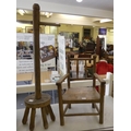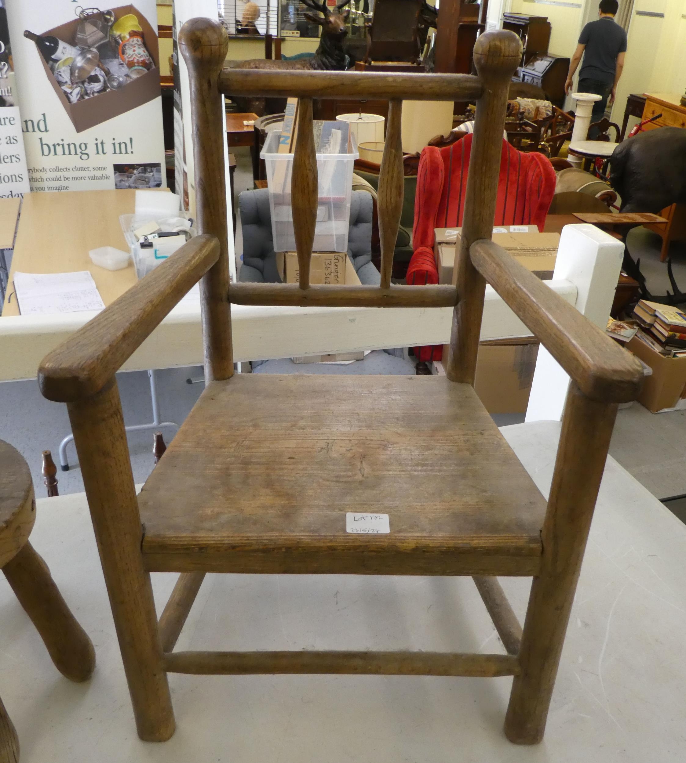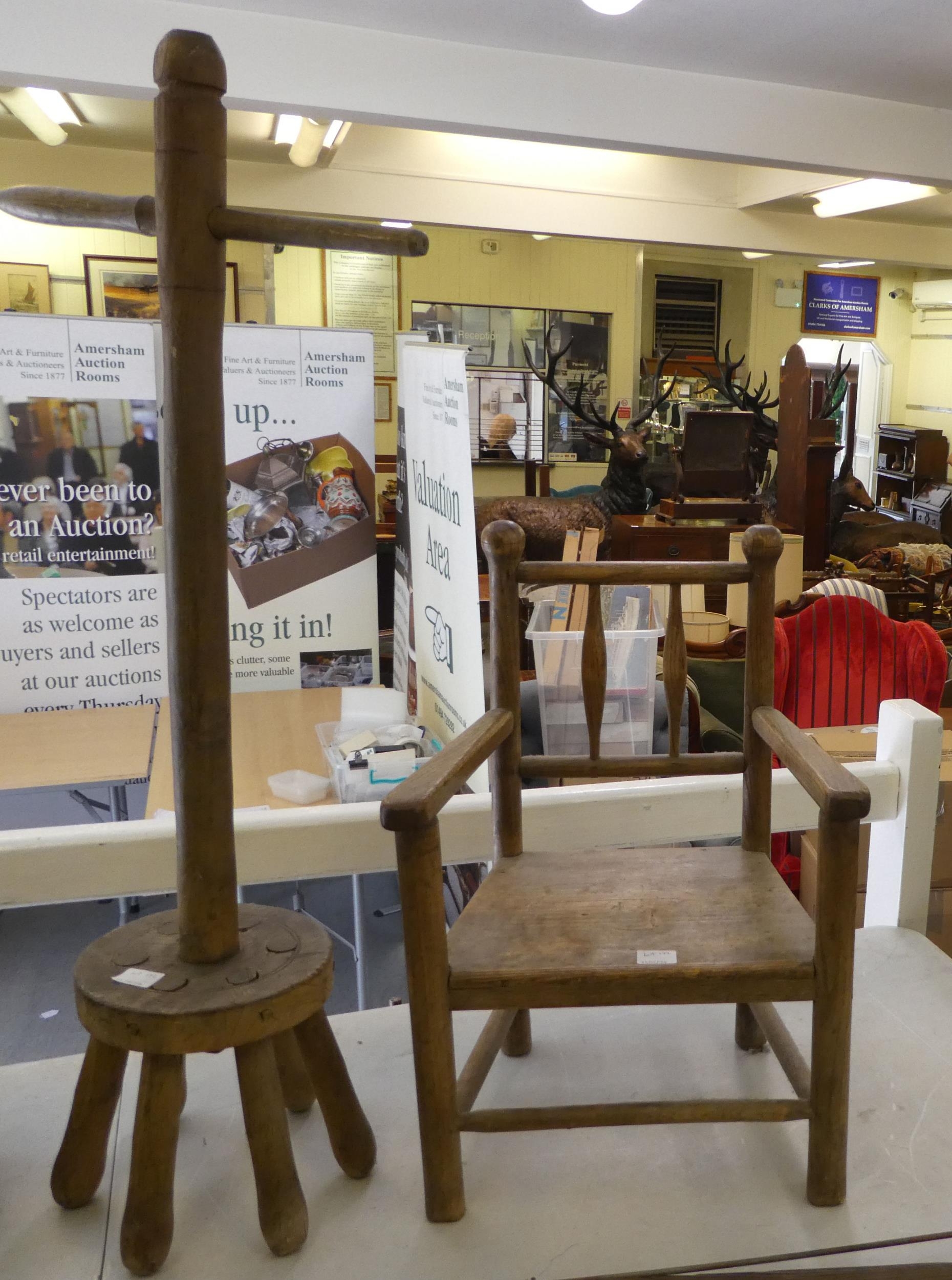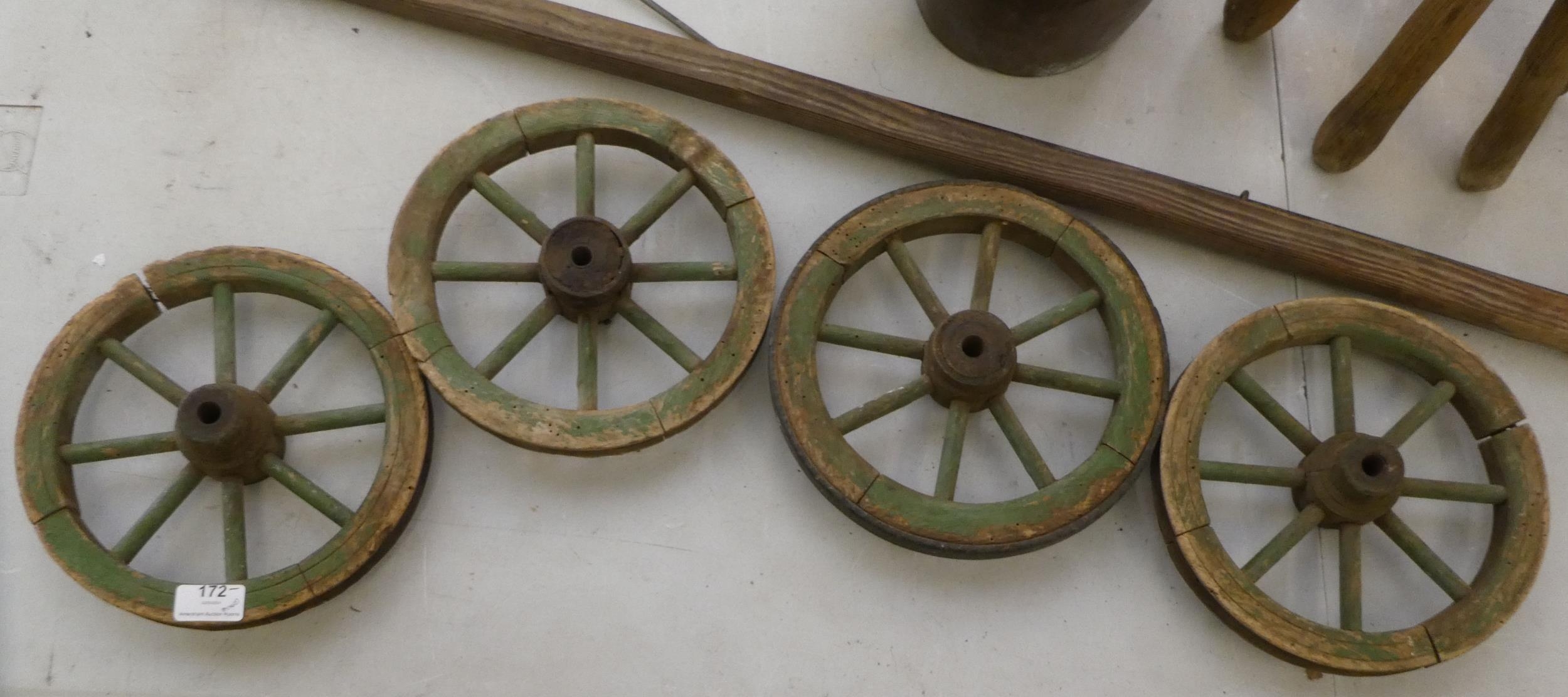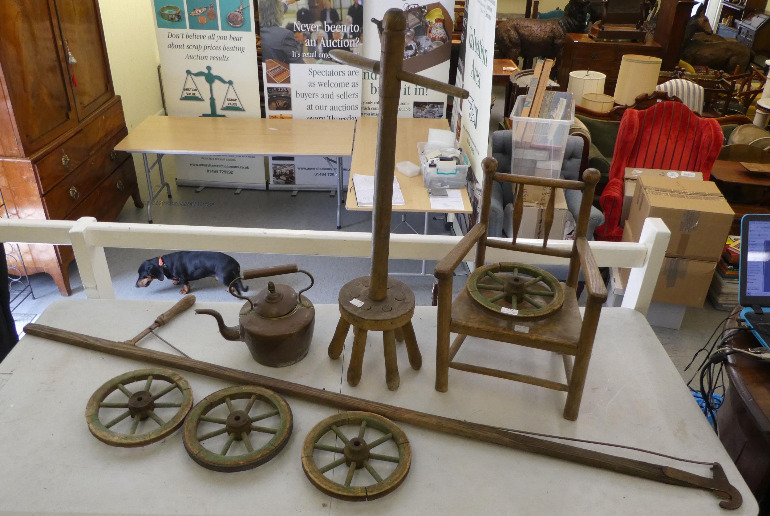 19thC vernacular collectables: to include a child's open arm chair with a solid seat; a set of four wooden toy cart wheels 10"dia; and a washing dolly