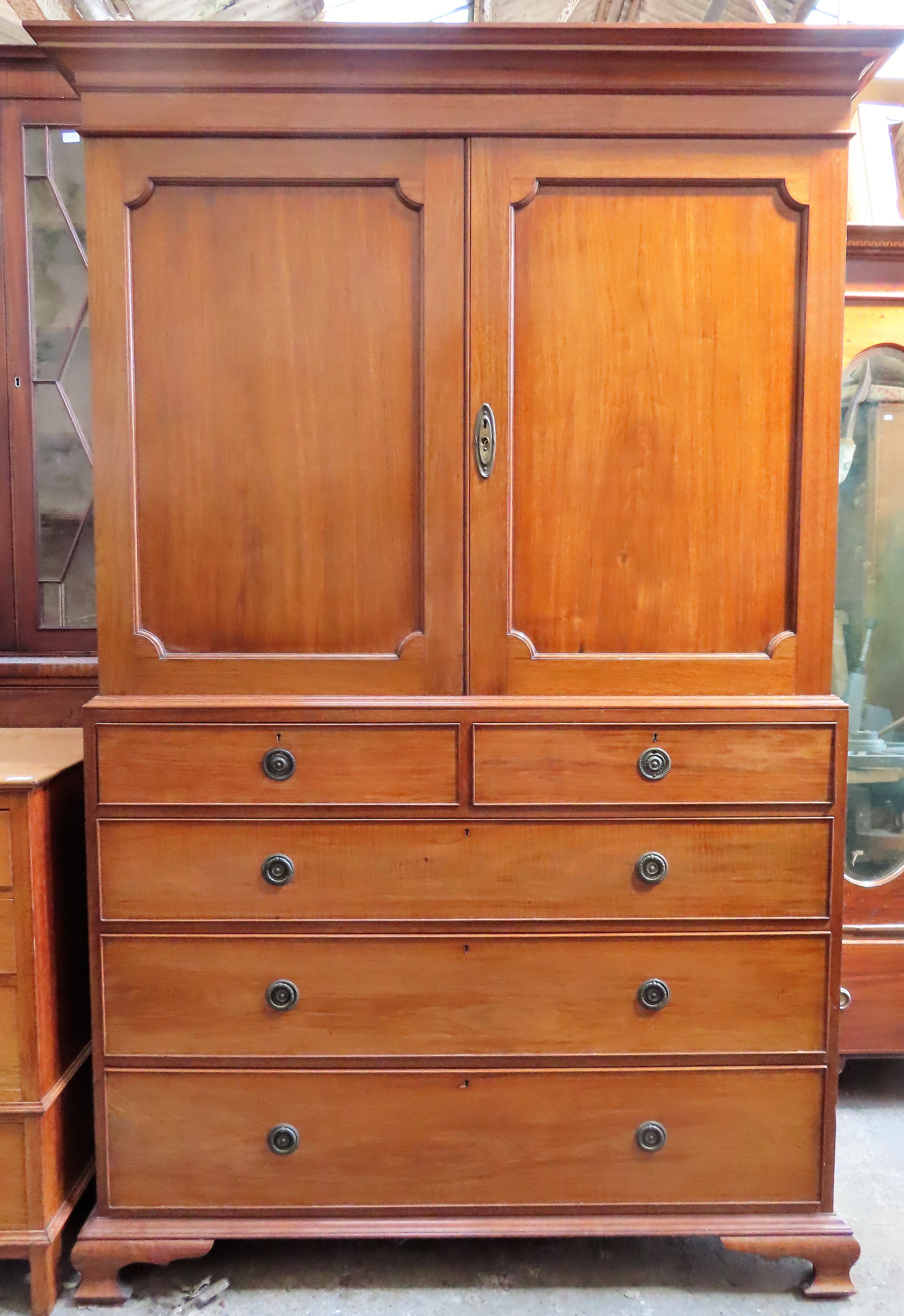 19th century panelled mahogany linen press, with drawers below. Approx. 212cm H x 138cm W x 56cm D