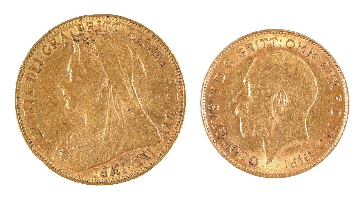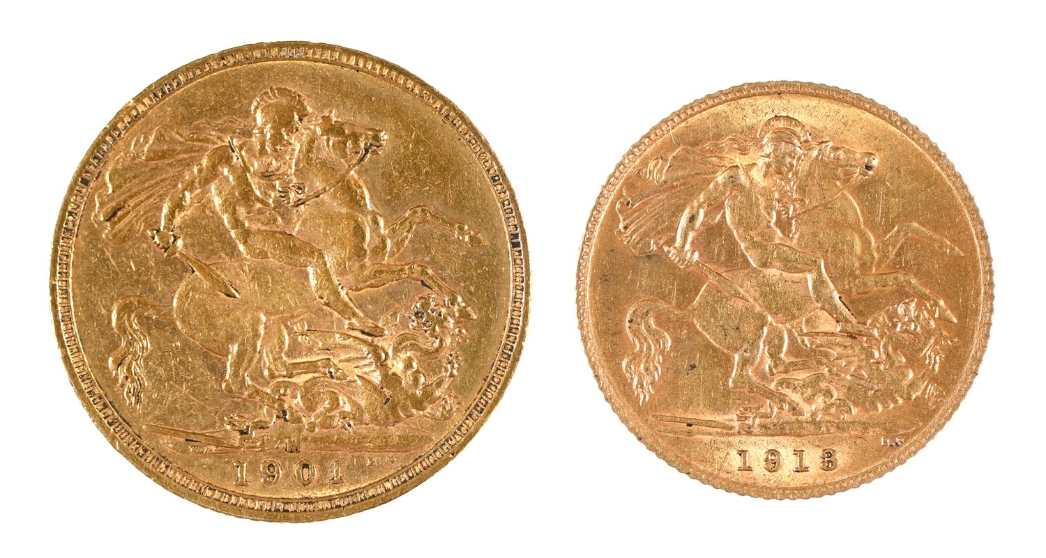 Gold coins. Queen Victoria, Sovereign 1901; George V, Half Sovereign, 1913, both VF or better (2)