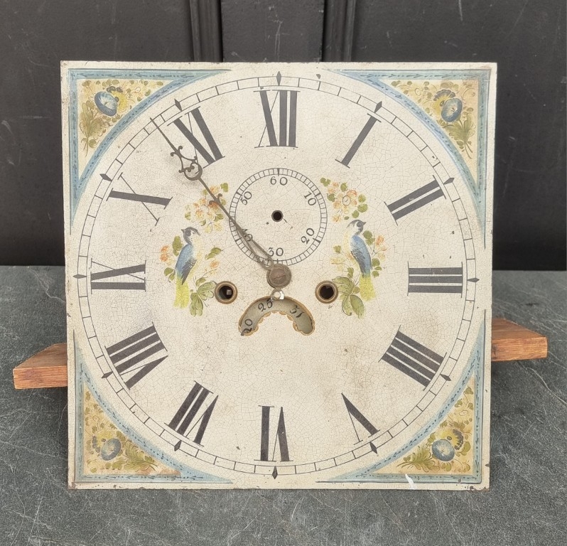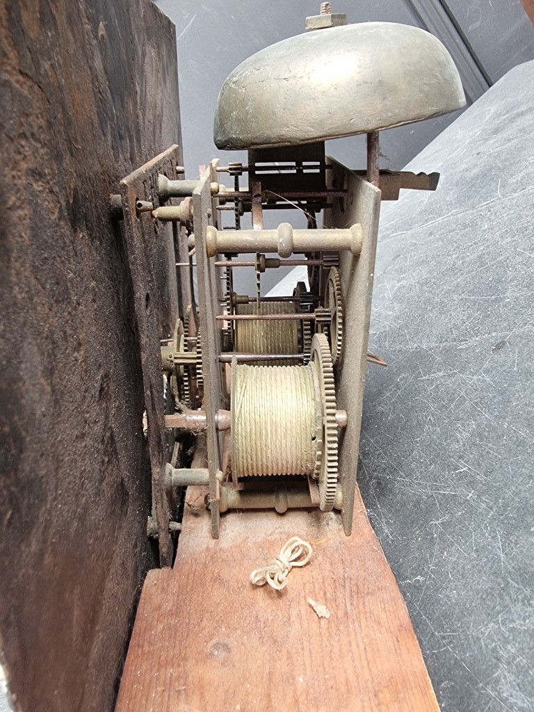 An early 19th century eight day longcase clock movement, with 14in square painted dial, (s.d.), no pendulum or weights.