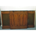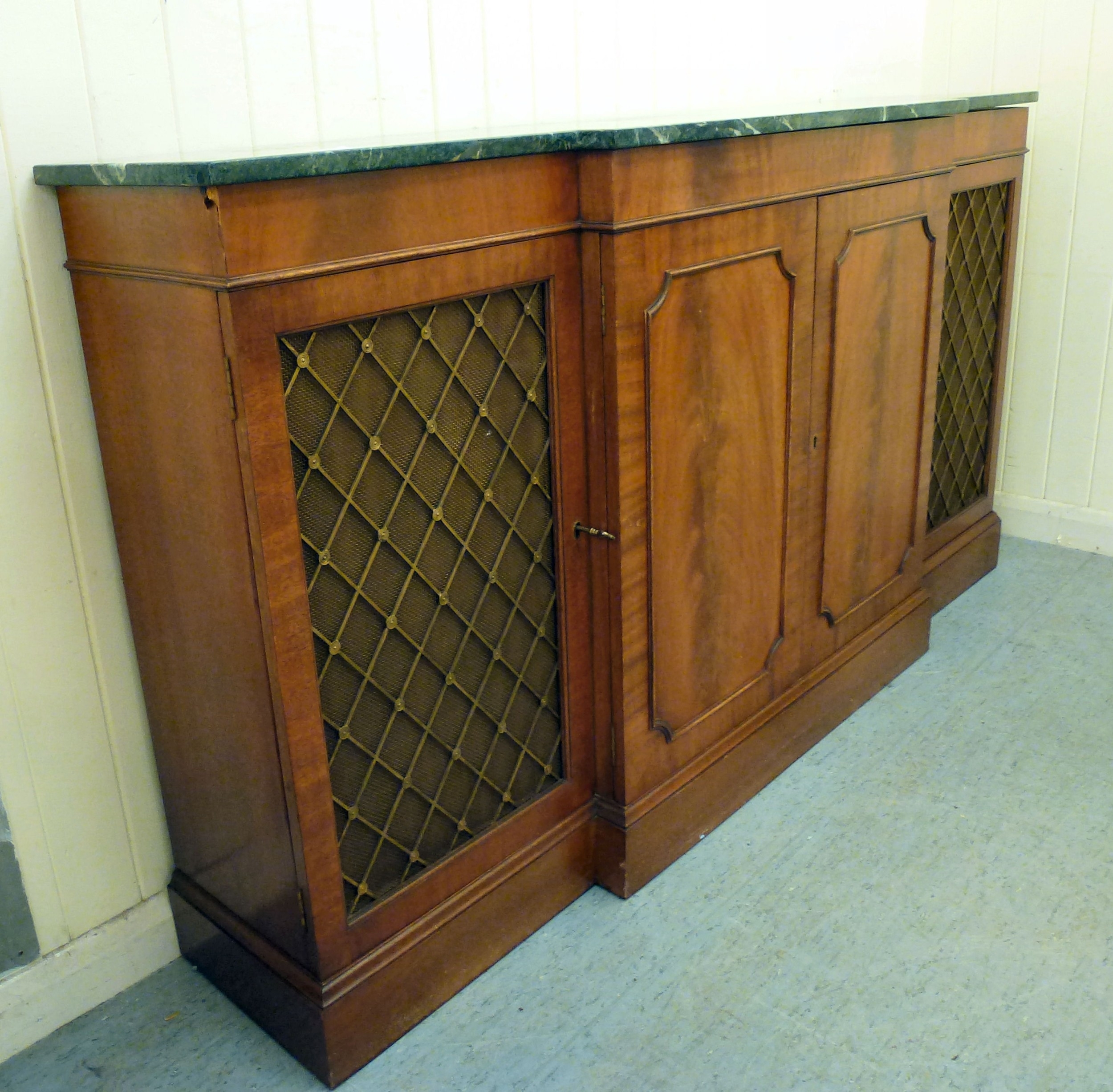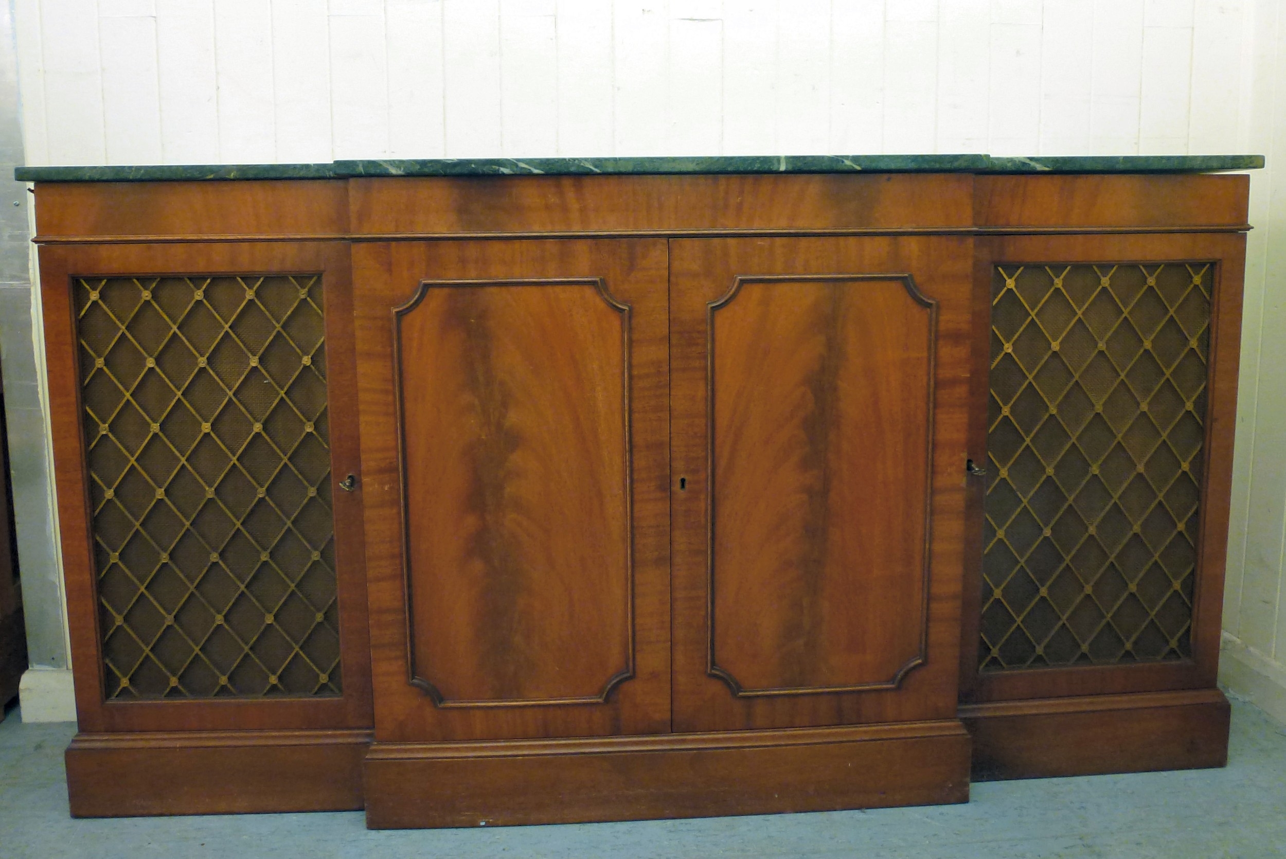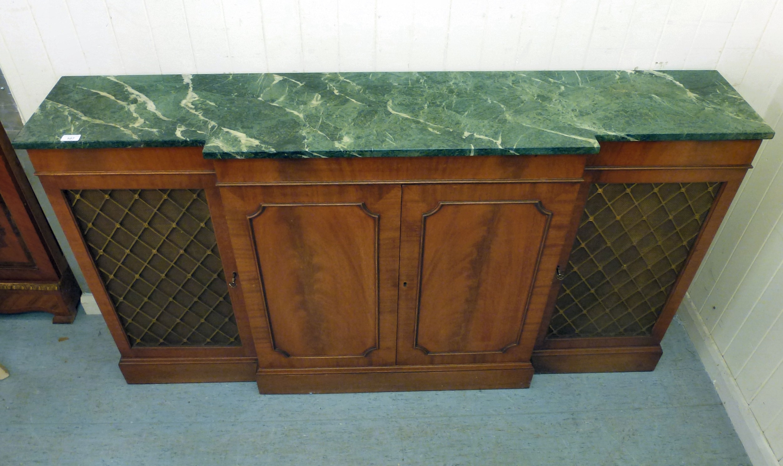 A modern Reprodux mahogany breakfront chiffonier, the marble top over four doors, raised on a plinth 35"h 65.5"w