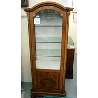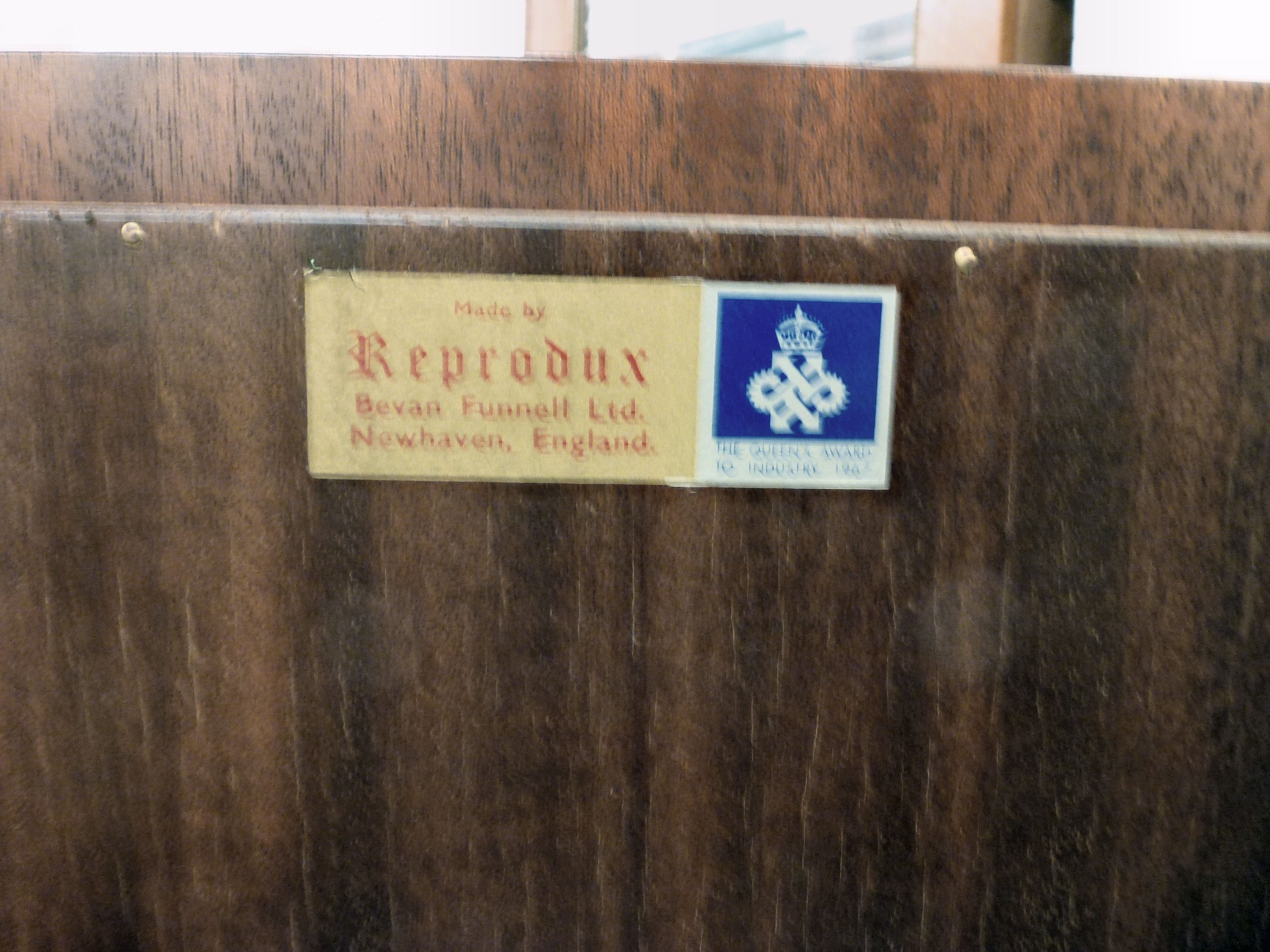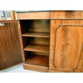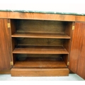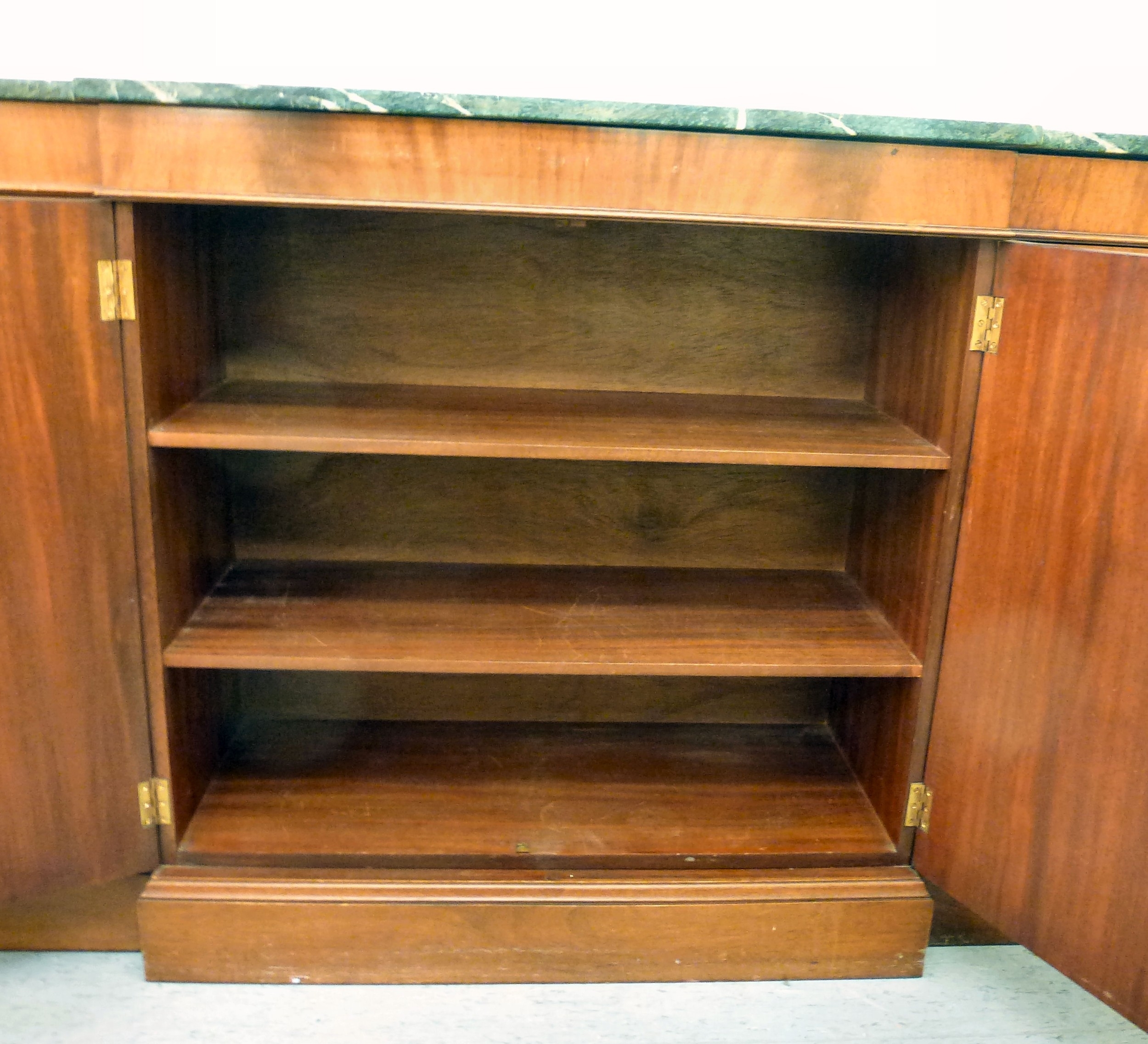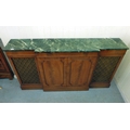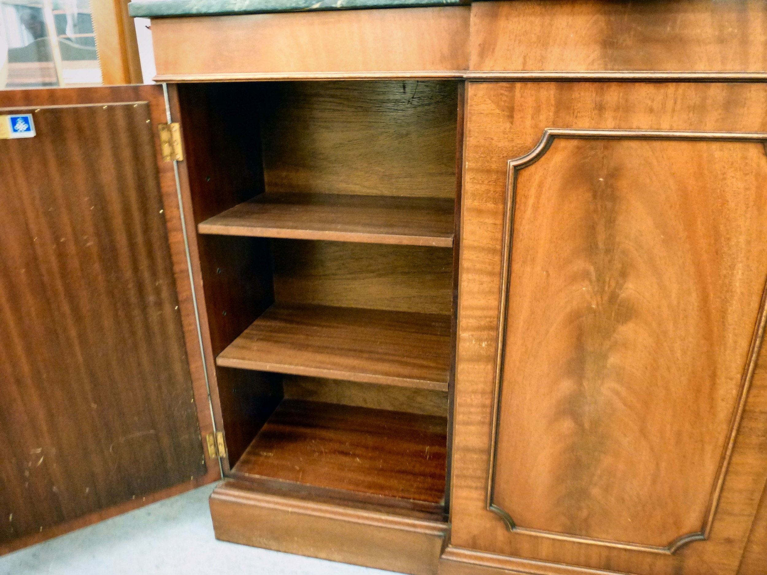 A modern Reprodux mahogany breakfront chiffonier, the marble top over four doors, raised on a plinth 35"h 65.5"w
