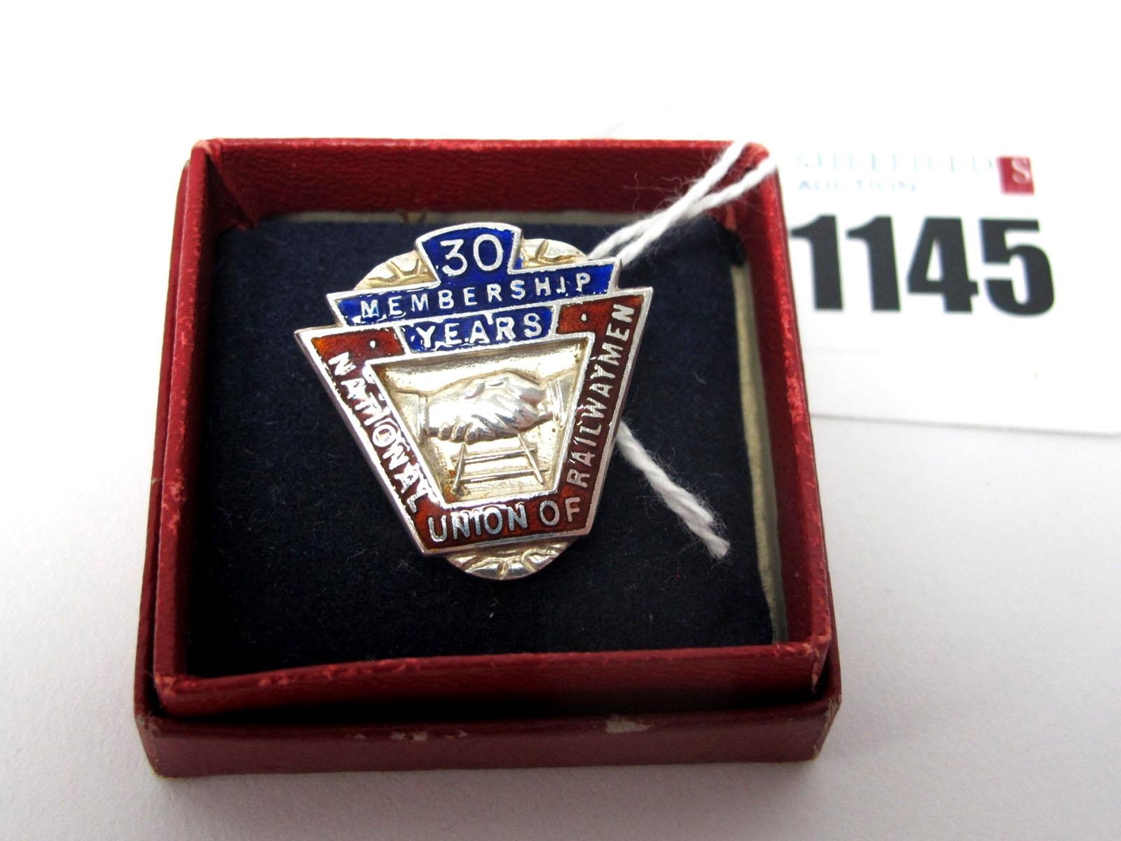A Hallmarked Silver 'National Union of Railwaymen' Button Hole Badge, "30 Membership Years", Birmingham 1948, in original box.