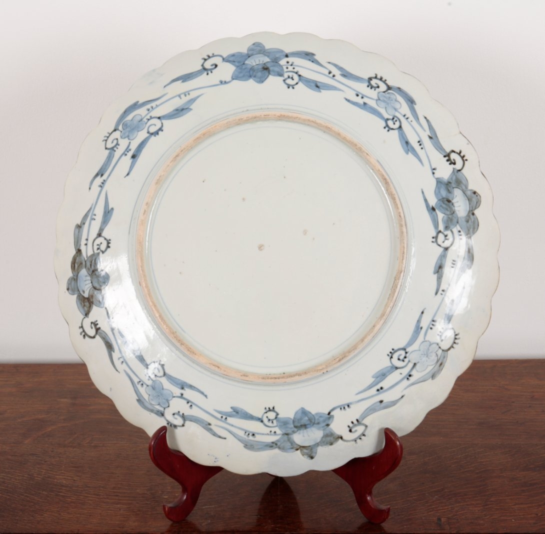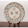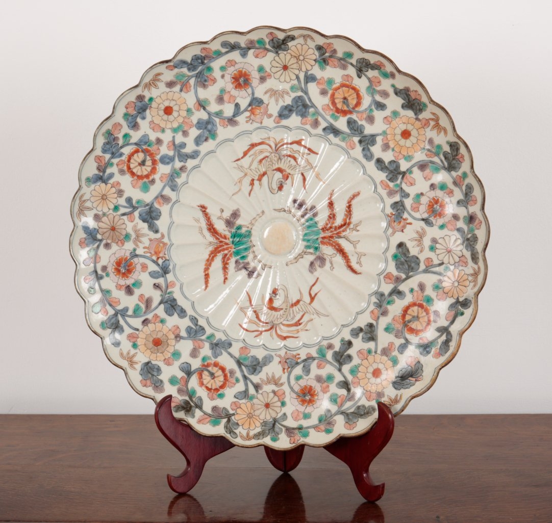 A JAPANESE PORCELAIN CHARGEREdo period, with scalloped rim, decorated with birds to the centre within a band of foliage, 46cm wide