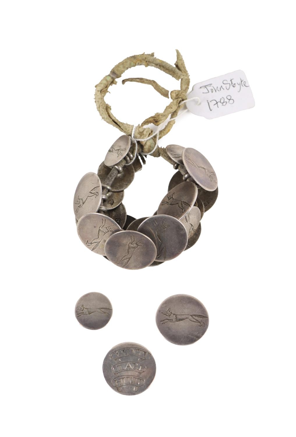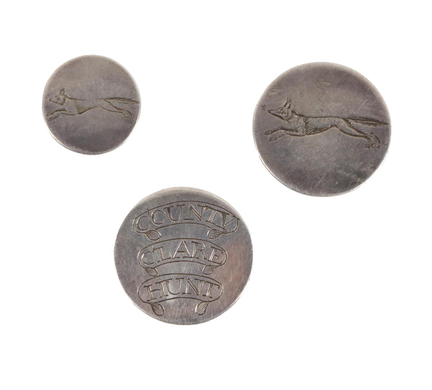 [Co. Clare] An important and rare set of 18th Century Irish silver Buttons, for the Co. Clare Chasseurs and County Clare Hunt, (engraved) and with engraved fox hall marked John Styote (1783-1802). (1)