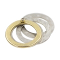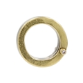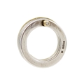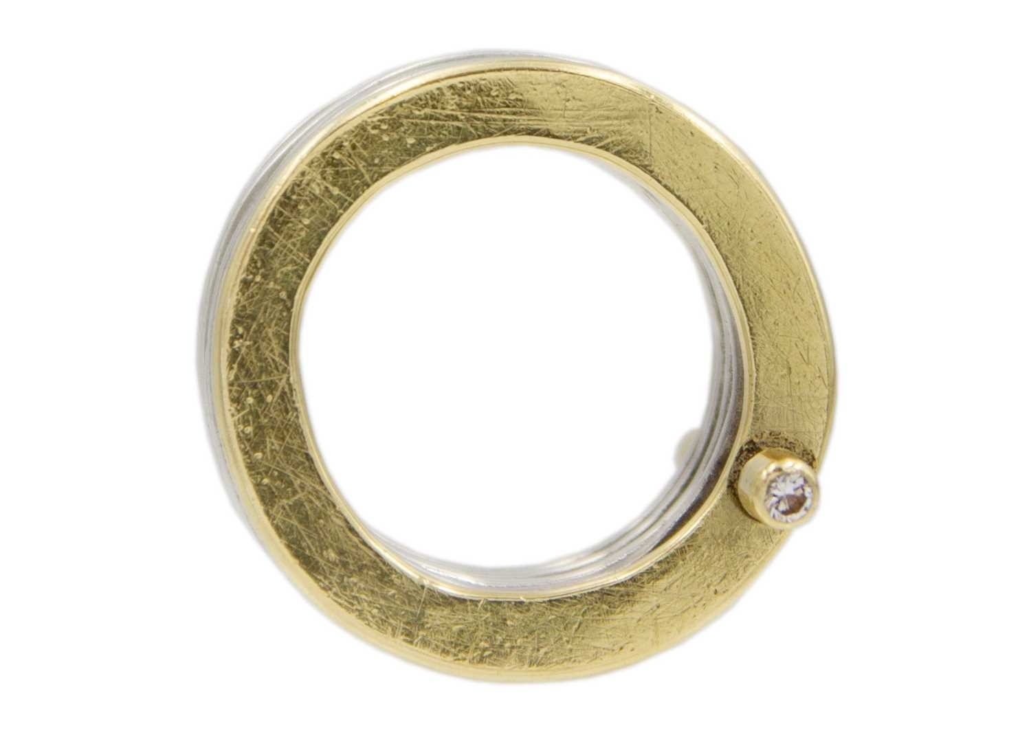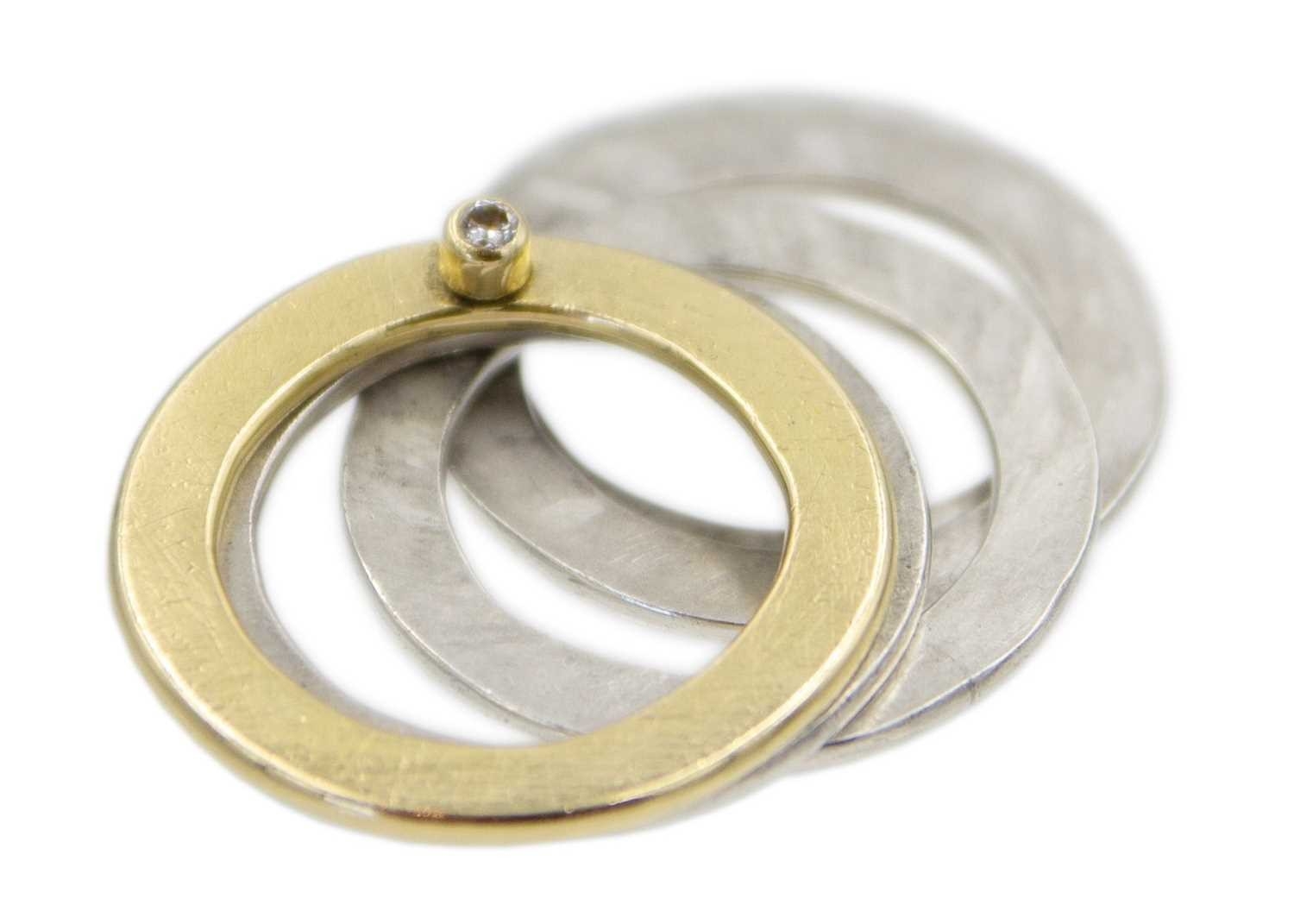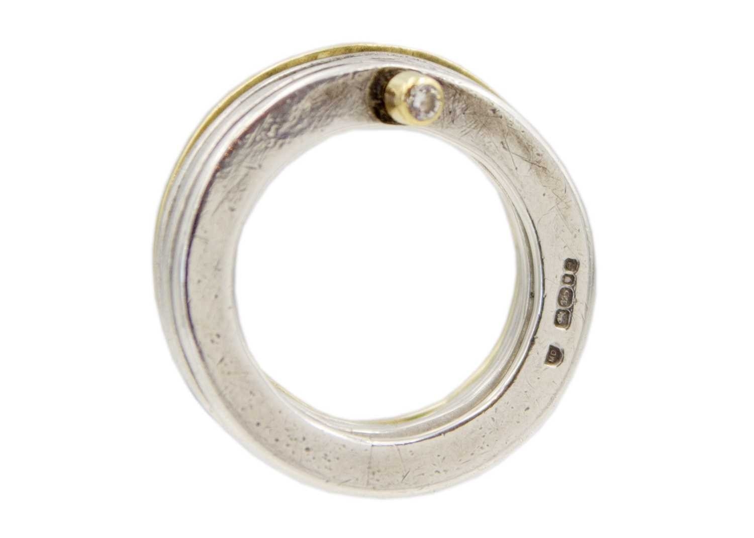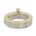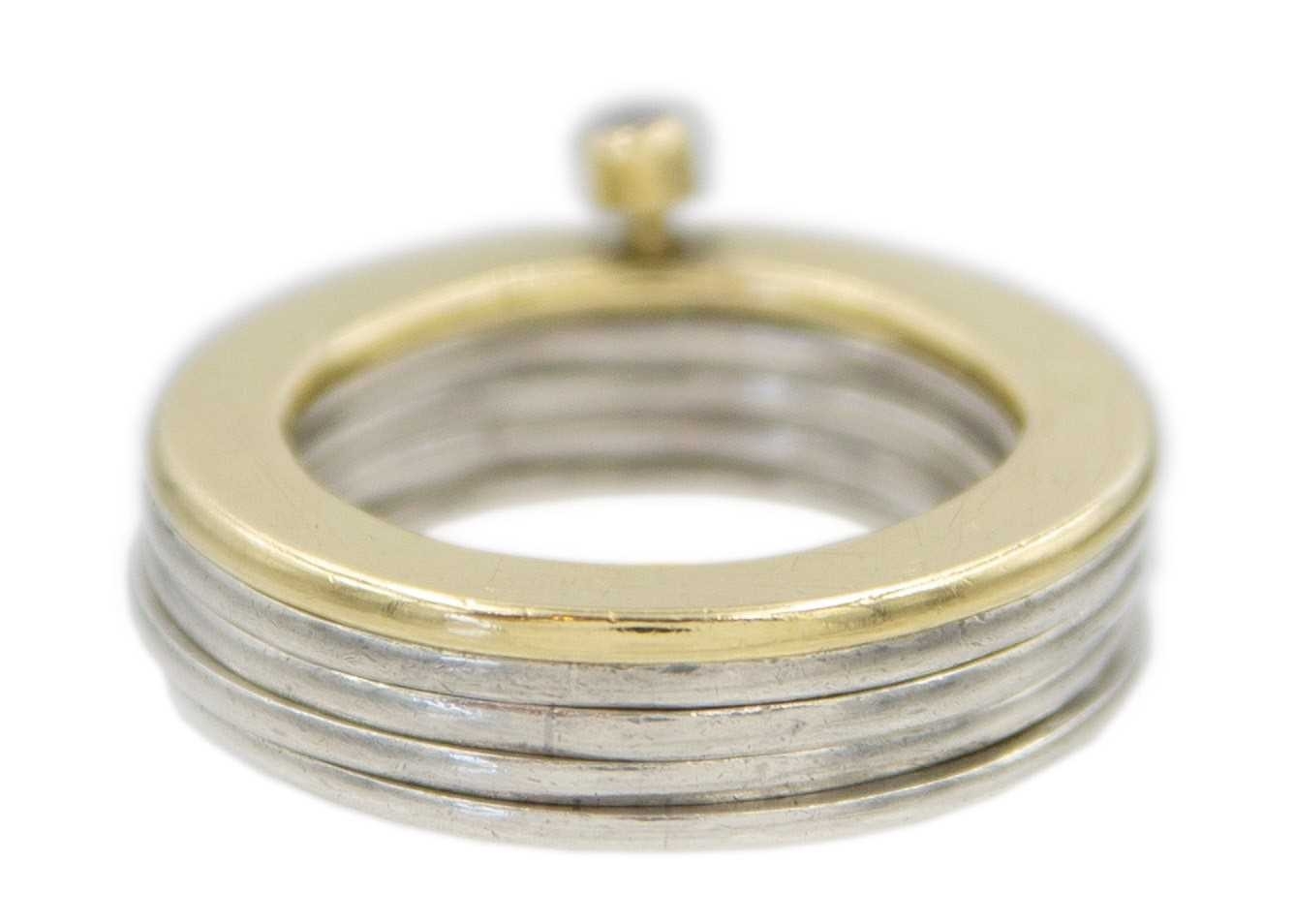 A diamond set silver and yellow gold stacking ring in a box. Includes four silver and one gold flattened rings fitted on a bezel set diamond pin, the stones are 0.03ct each, approx., clear and white, ring size L, London hallmarked 2004, by MD, total weight 13.77g.