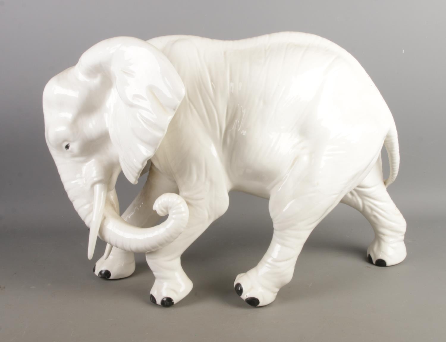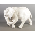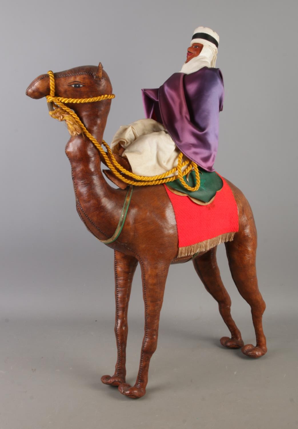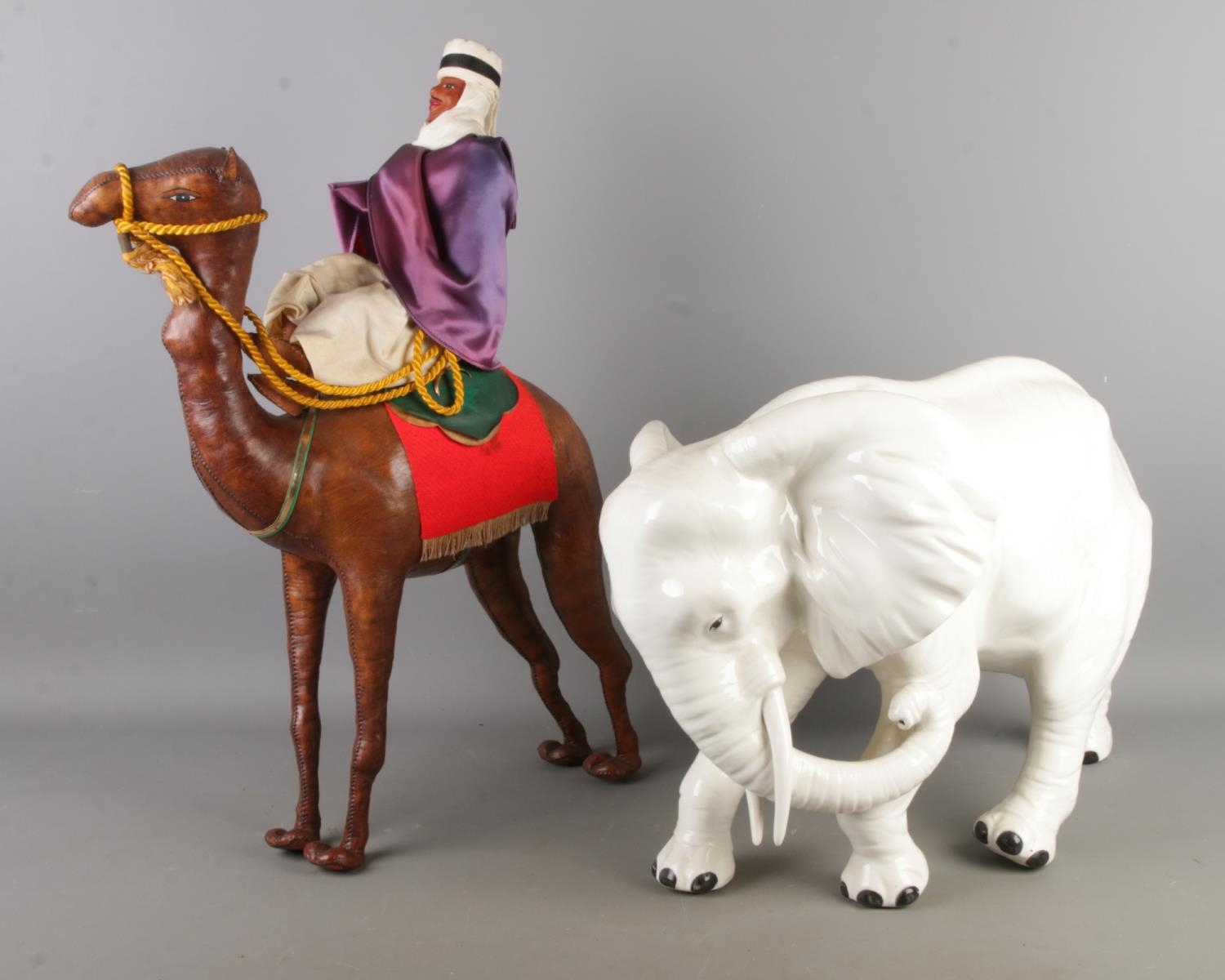 A large white Italian ceramic model of an elephant, together with a leather wrapped model of a camel with rider.