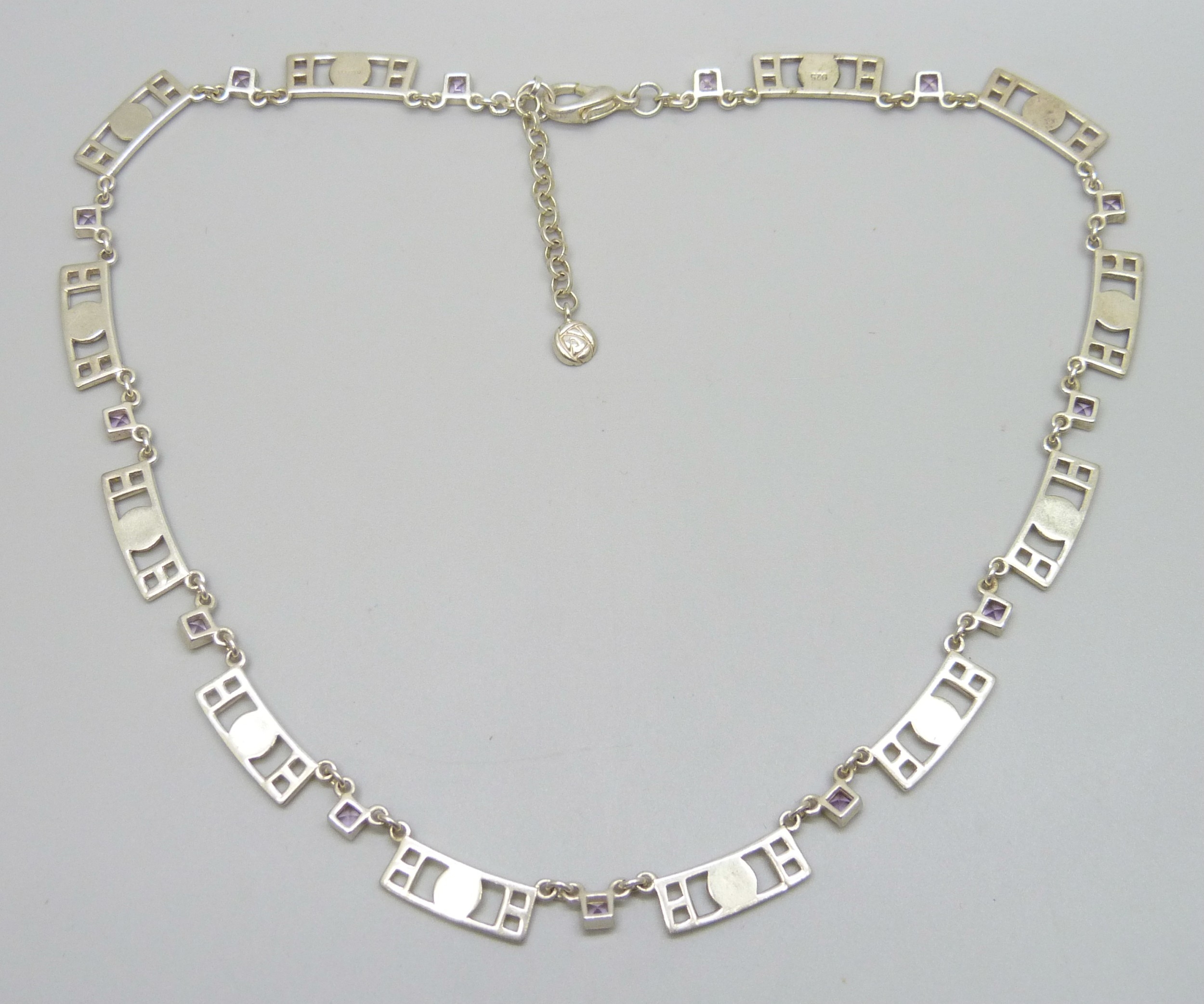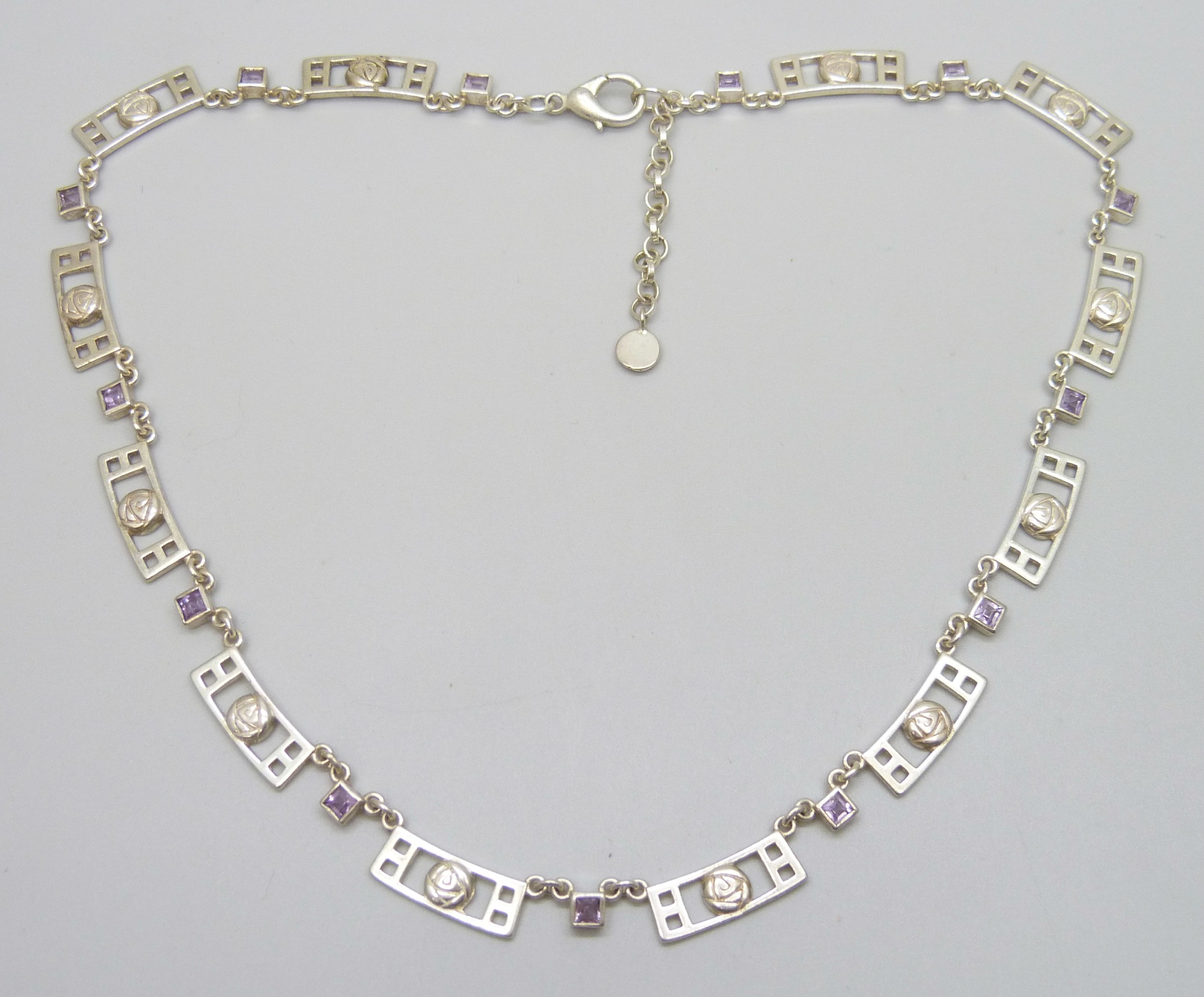 A silver Charles Rennie Mackintosh inspired Art Nouveau style necklace, replacement unmarked clasp, 36g, 45.5cm