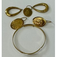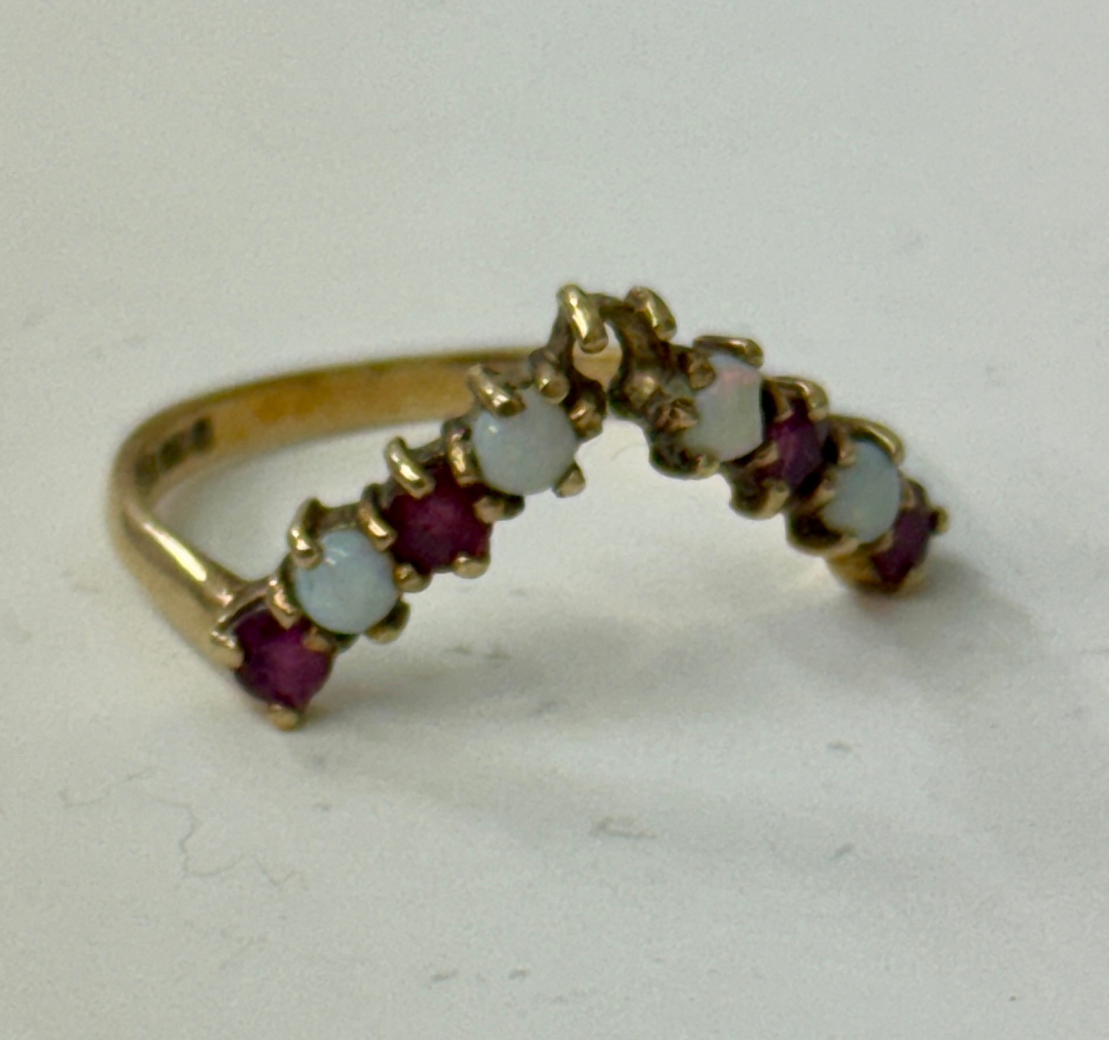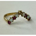 A 9CT YELLOW GOLD RUBY AND OPAL WISHBONE RING - WT: 2 GMS -SIZE 'T' MISSING ONE RUBY